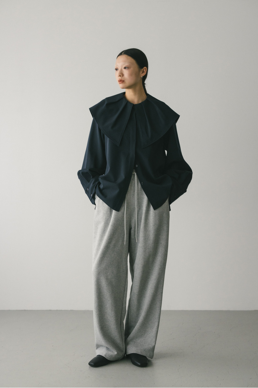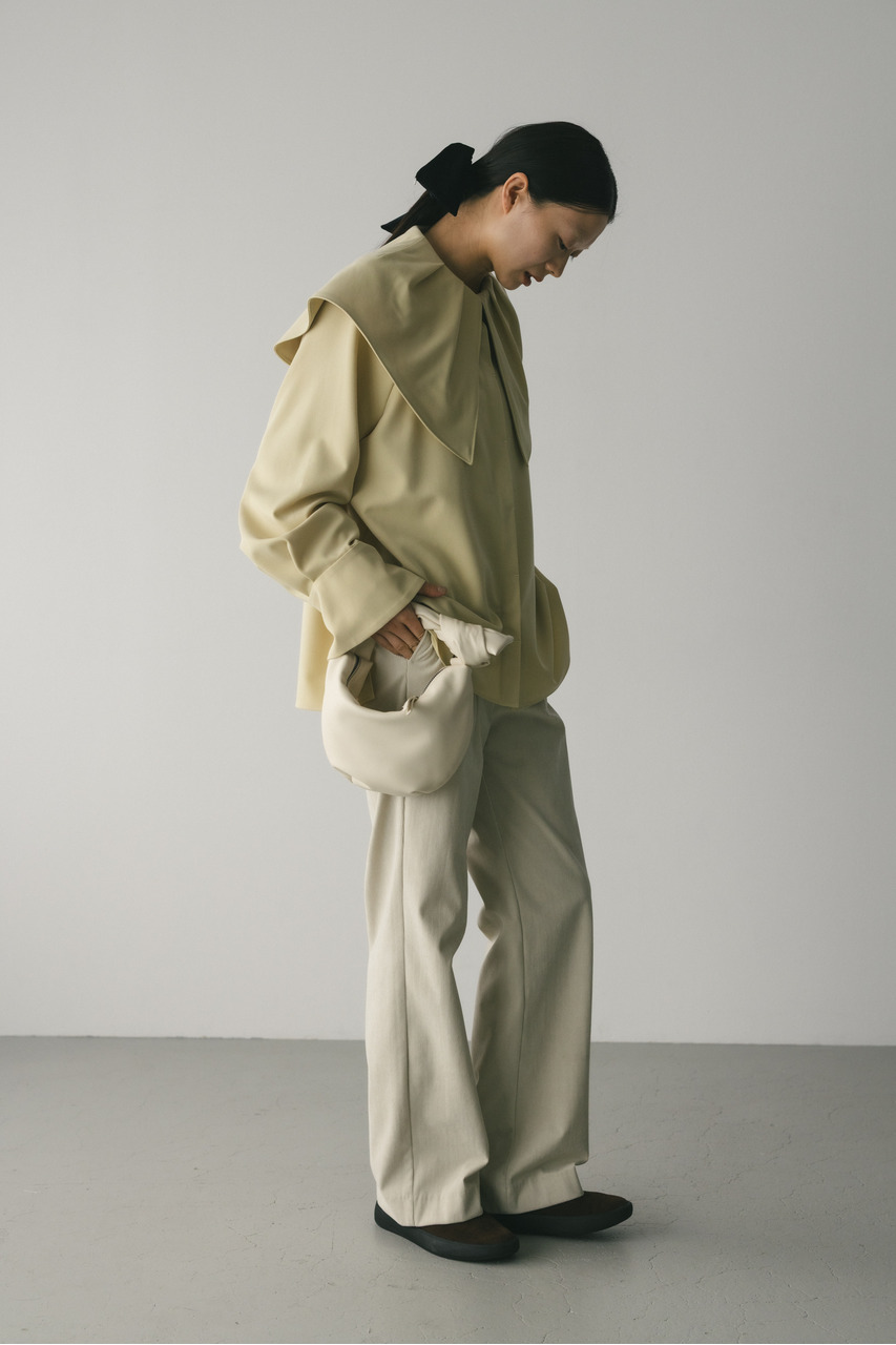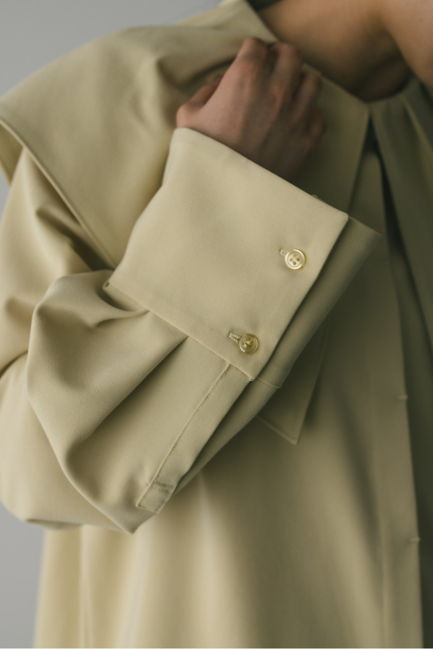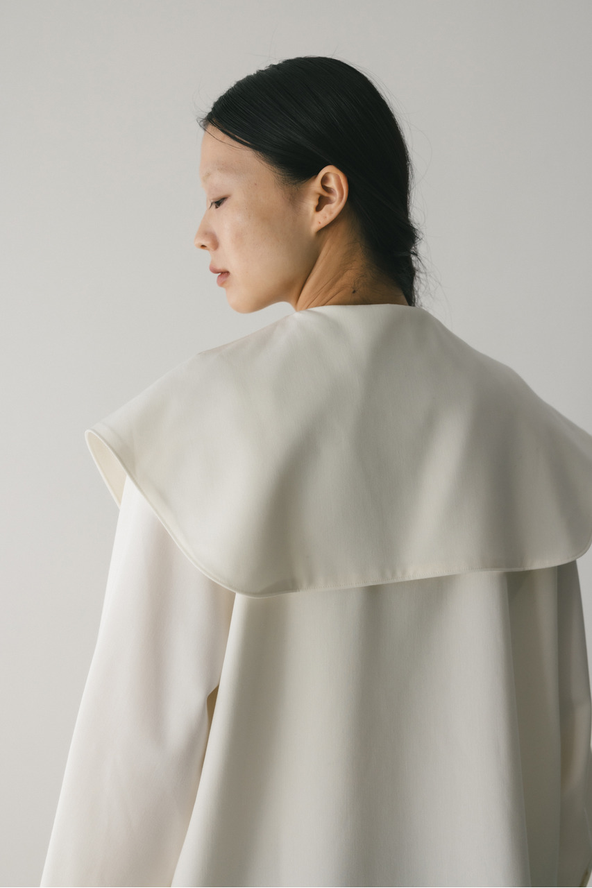 タックをあしらったビッグカラーが特徴的なブラウス。大きめな衿は可愛らしさがありつつもタックデザインとケープのようなデザインが落ち着き感とモードな印象の大人なデザインに仕上げました。ゆったりとしたサイズ間で、1枚でもインナータートルなどとレイヤードしても使えるアイテムです。ストレッチなし、透け感なし。