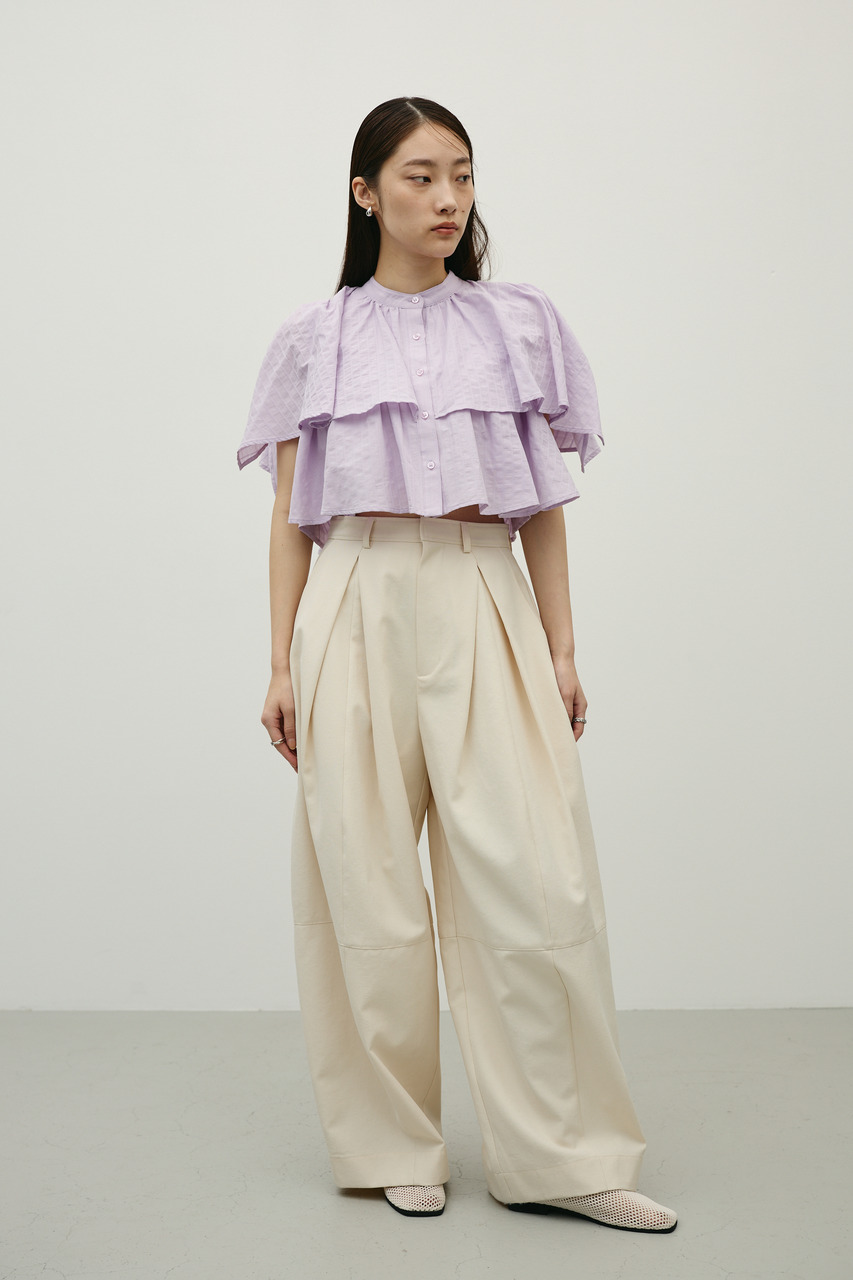 ふんわりと重なるティアードフリルが、女性らしさを引き立てる主役級ブラウス。動くたびに揺れる立体的なフリルデザインが、華やかさと軽やかさを演出します。程よいボリューム感で甘くなりすぎず、きれいめにもカジュアルにも着回し可能。デニムと合わせて大人カジュアルに、スカートと合わせてフェミニンスタイルにもおすすめです。透け感ややあり、ストレッチなし。