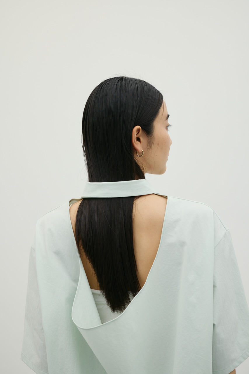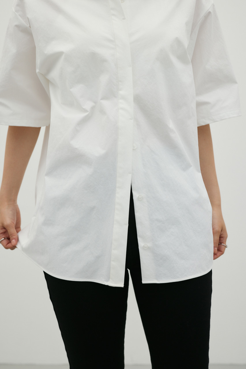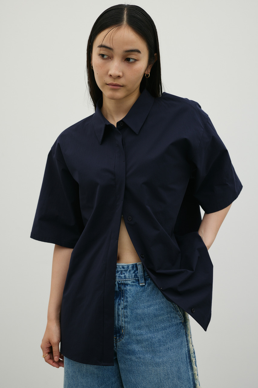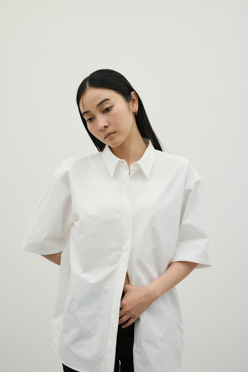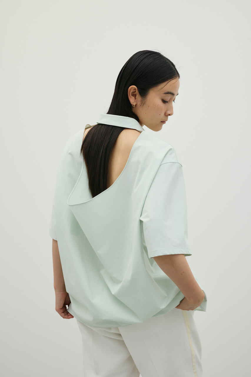 バックスタイルは大胆に開いたドレープデザインで、動きに合わせて揺れるモードな表情が魅力のシャツトップス。フロントはメンズライクなボックスシルエットの半袖シャツで、クリーンかつ端正な印象に仕上げています。前後で印象の異なるコントラストが、スタイリングに奥行きを与える一枚です。ポリエステル100%の程よく厚みのあるシャツ素材を使用。軽やかさと適度なハリ感を兼ね備え、シワになりにくく扱いやすいのも特徴です。シンプルながら存在感のあるデザインで、着るだけでモードな雰囲気を演出します。透け感なし(WHTややあり)、ストレッチなし。