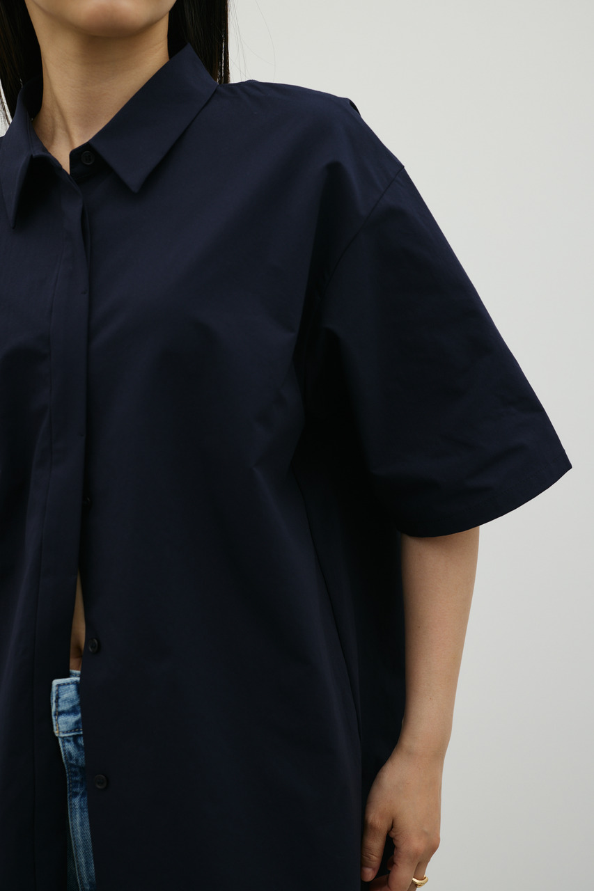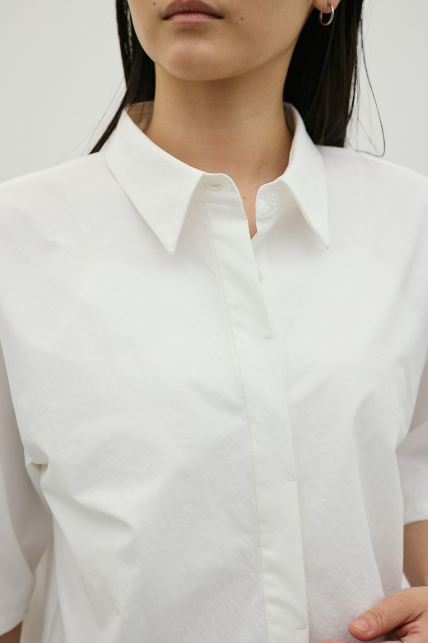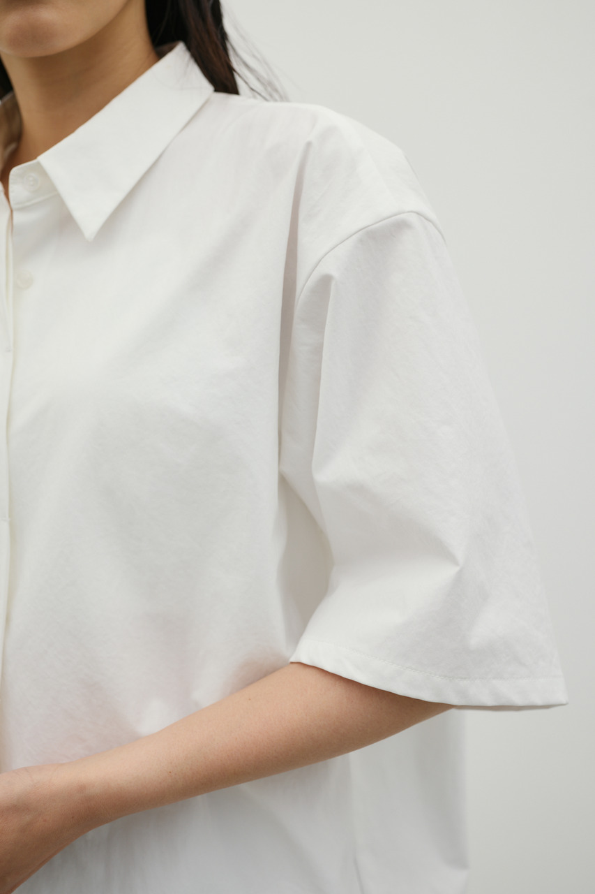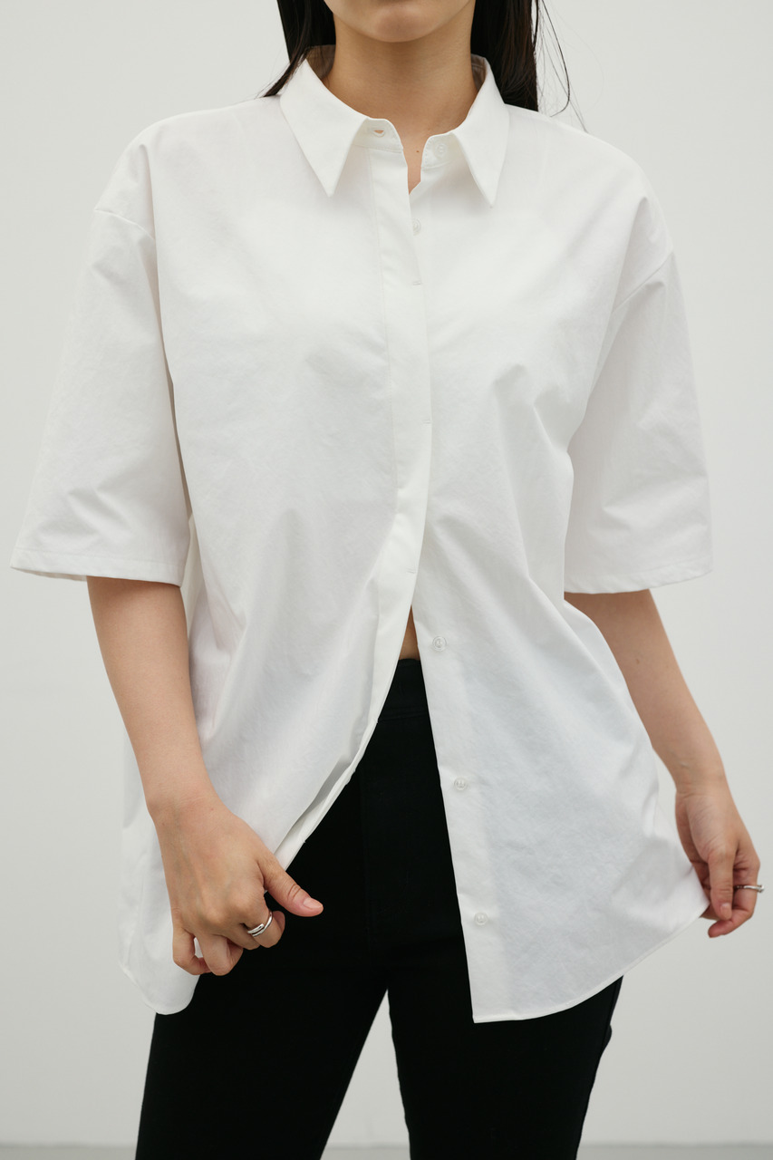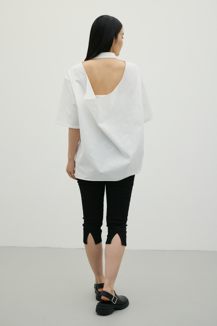 バックスタイルは大胆に開いたドレープデザインで、動きに合わせて揺れるモードな表情が魅力のシャツトップス。フロントはメンズライクなボックスシルエットの半袖シャツで、クリーンかつ端正な印象に仕上げています。前後で印象の異なるコントラストが、スタイリングに奥行きを与える一枚です。ポリエステル100%の程よく厚みのあるシャツ素材を使用。軽やかさと適度なハリ感を兼ね備え、シワになりにくく扱いやすいのも特徴です。シンプルながら存在感のあるデザインで、着るだけでモードな雰囲気を演出します。透け感なし(WHTややあり)、ストレッチなし。