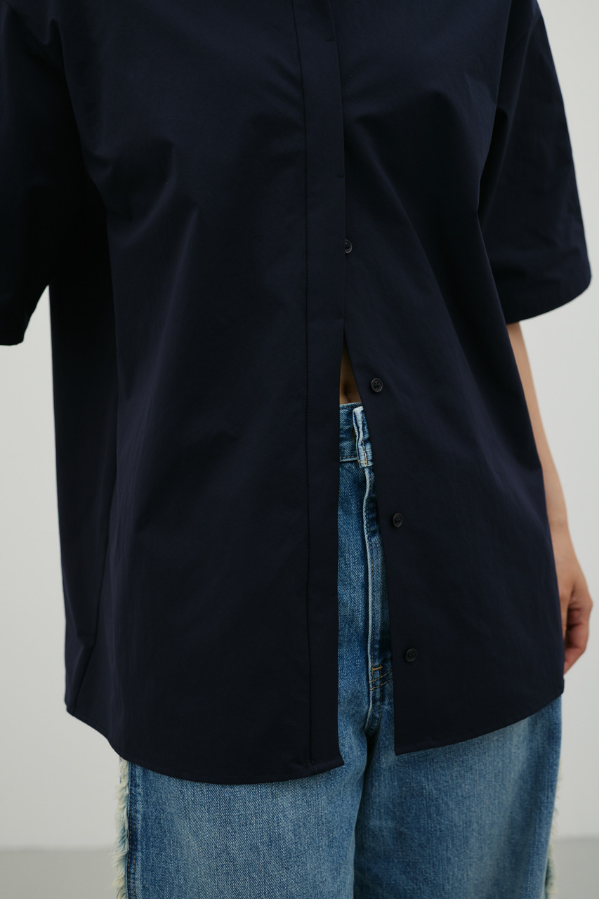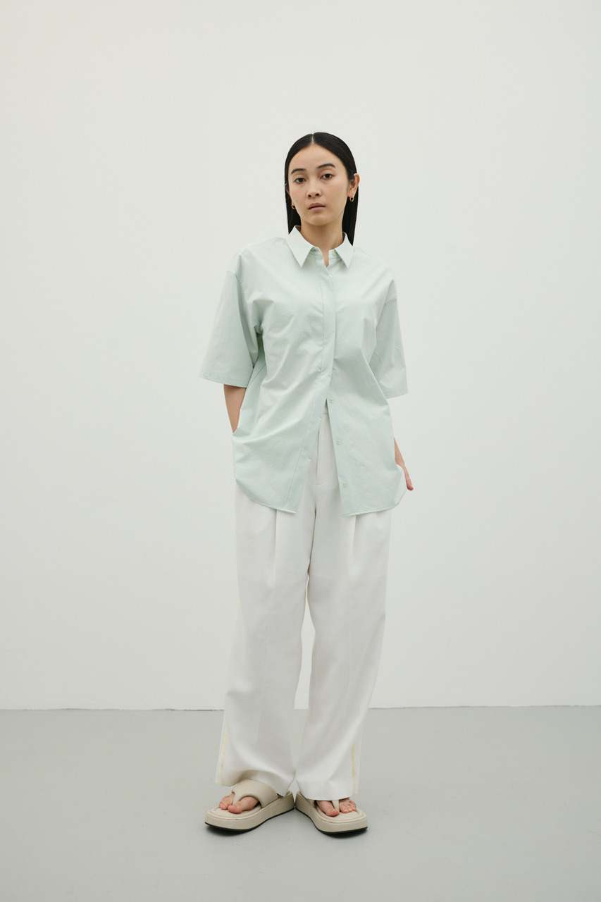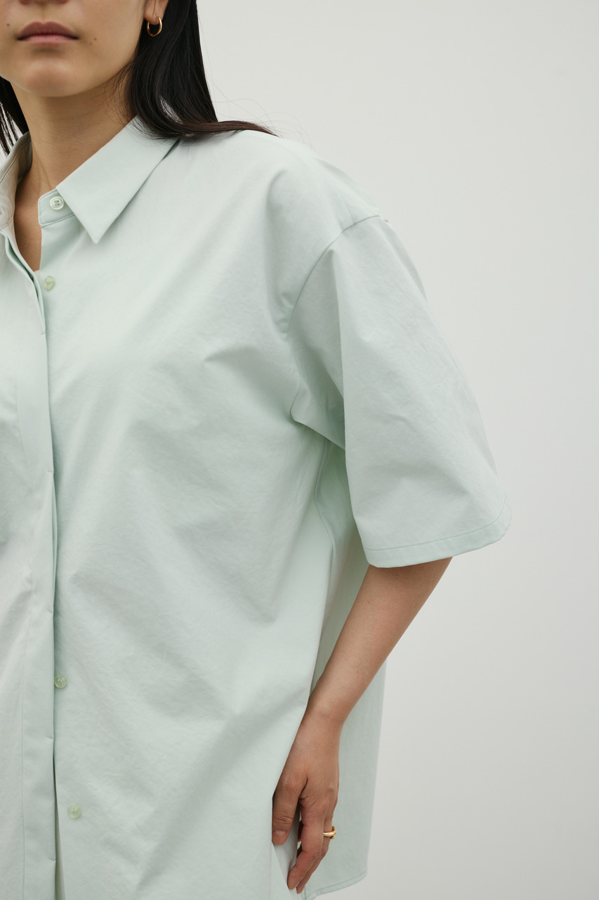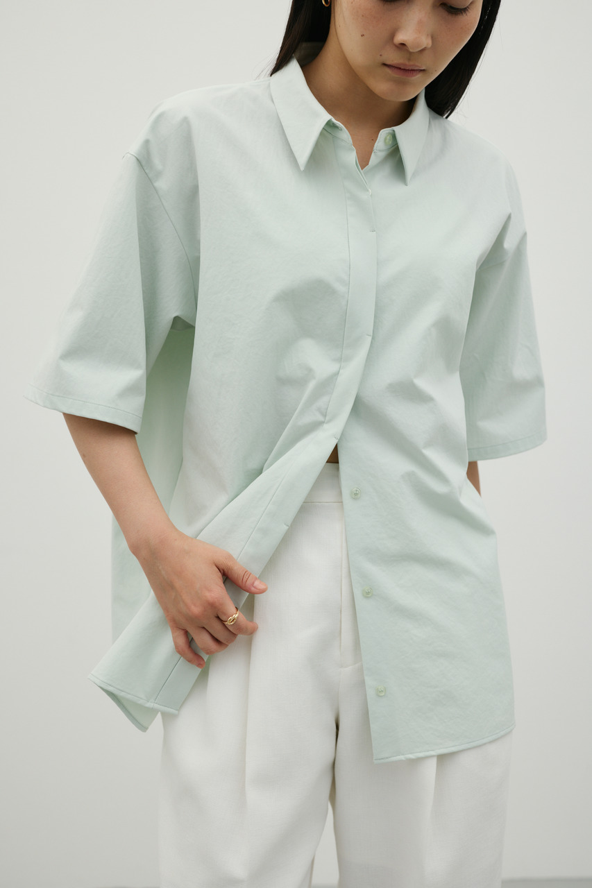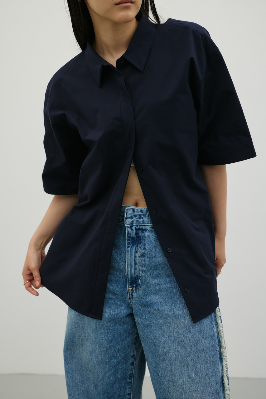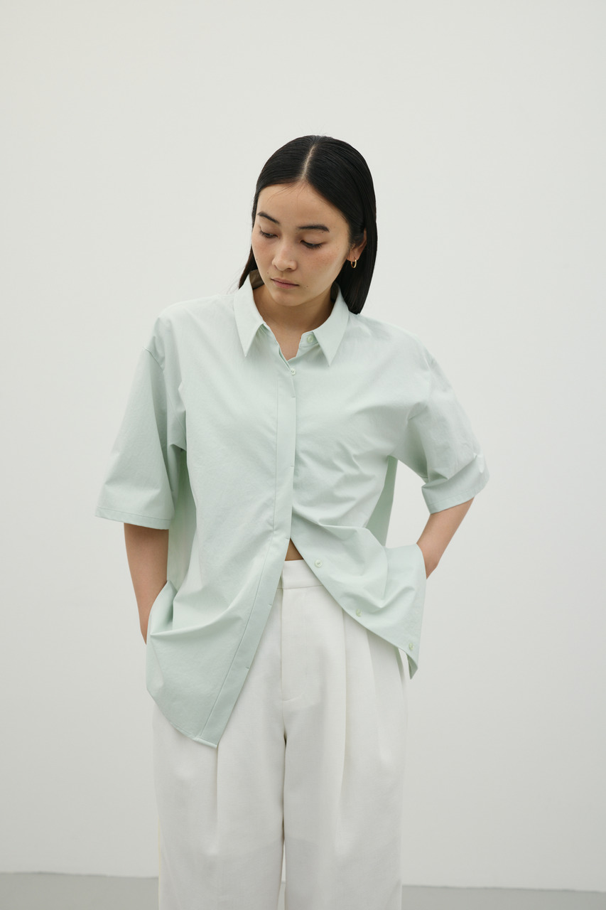 バックスタイルは大胆に開いたドレープデザインで、動きに合わせて揺れるモードな表情が魅力のシャツトップス。フロントはメンズライクなボックスシルエットの半袖シャツで、クリーンかつ端正な印象に仕上げています。前後で印象の異なるコントラストが、スタイリングに奥行きを与える一枚です。ポリエステル100%の程よく厚みのあるシャツ素材を使用。軽やかさと適度なハリ感を兼ね備え、シワになりにくく扱いやすいのも特徴です。シンプルながら存在感のあるデザインで、着るだけでモードな雰囲気を演出します。透け感なし(WHTややあり)、ストレッチなし。