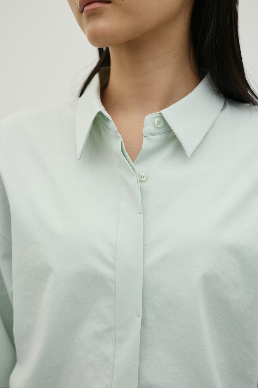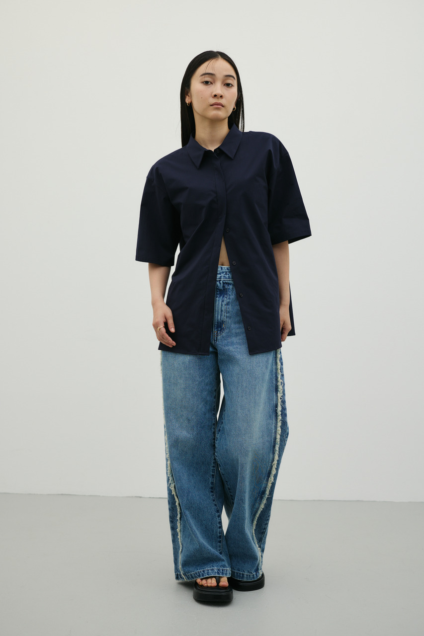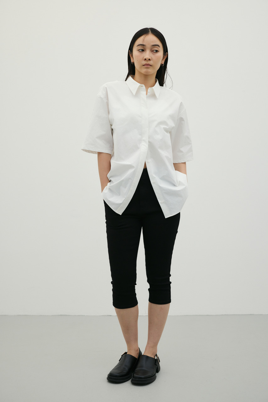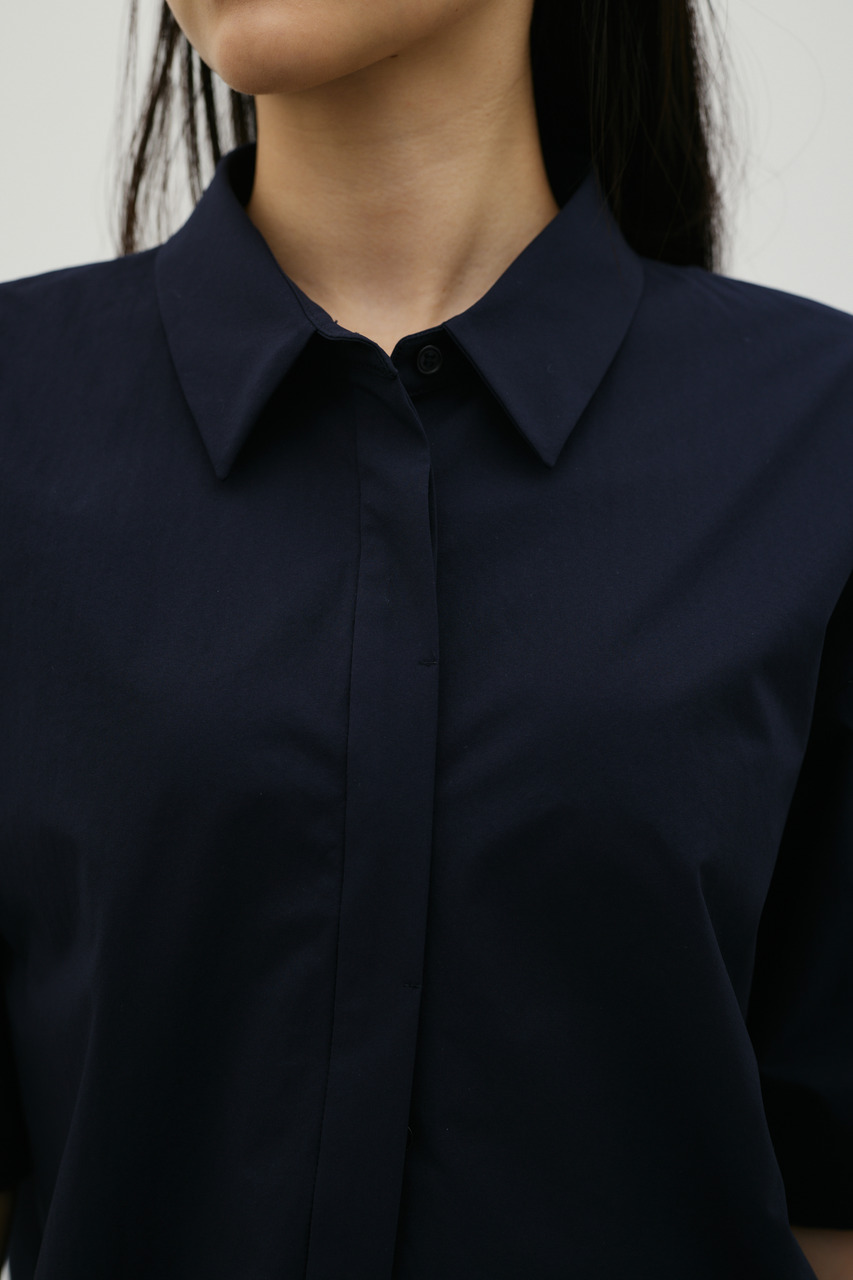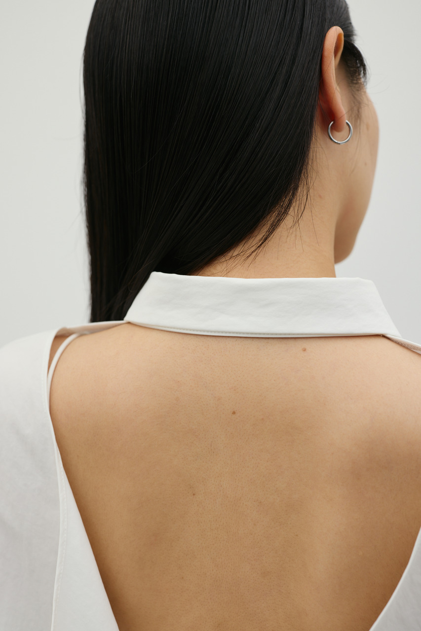 バックスタイルは大胆に開いたドレープデザインで、動きに合わせて揺れるモードな表情が魅力のシャツトップス。フロントはメンズライクなボックスシルエットの半袖シャツで、クリーンかつ端正な印象に仕上げています。前後で印象の異なるコントラストが、スタイリングに奥行きを与える一枚です。ポリエステル100%の程よく厚みのあるシャツ素材を使用。軽やかさと適度なハリ感を兼ね備え、シワになりにくく扱いやすいのも特徴です。シンプルながら存在感のあるデザインで、着るだけでモードな雰囲気を演出します。透け感なし(WHTややあり)、ストレッチなし。