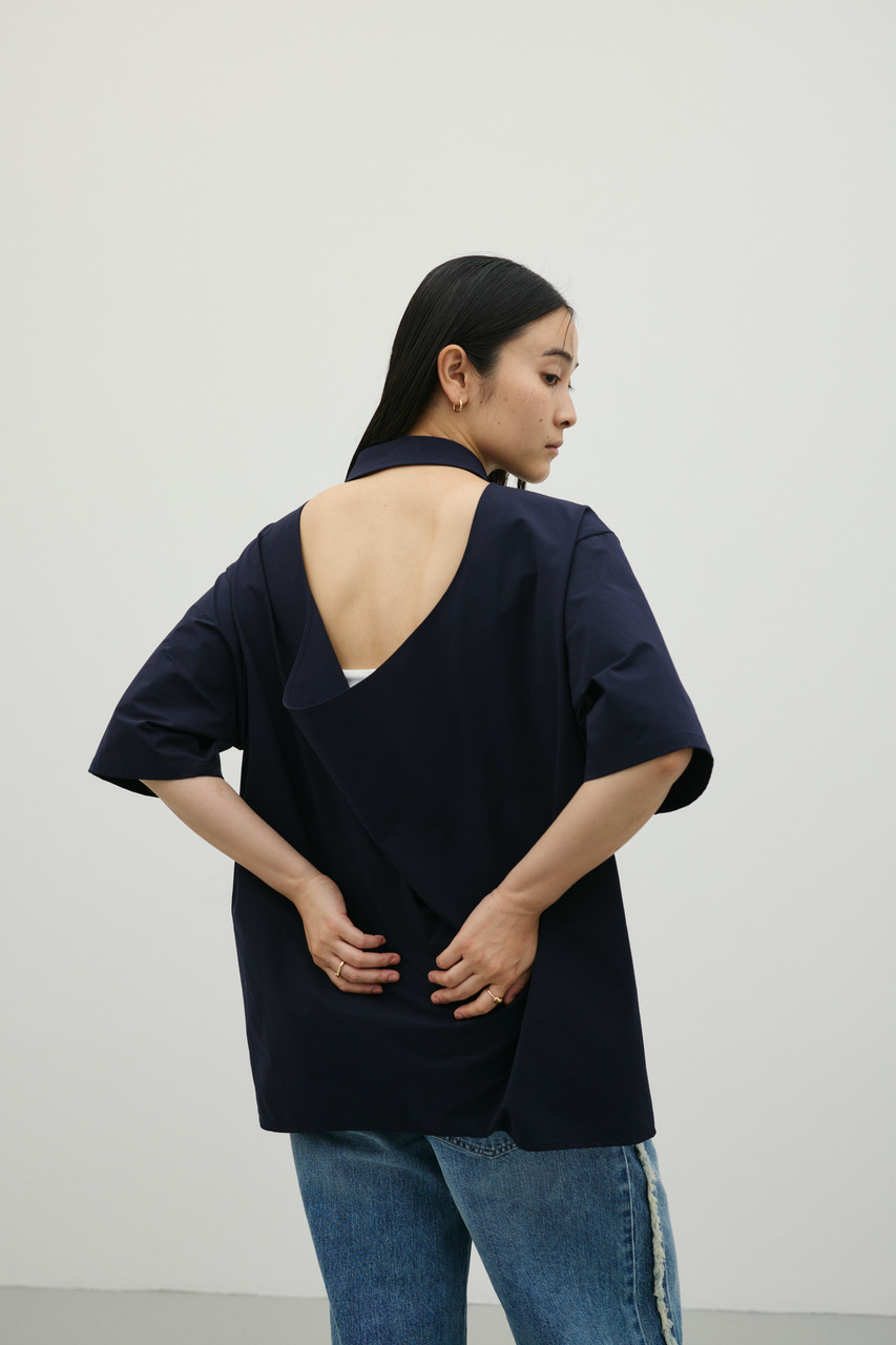 バックスタイルは大胆に開いたドレープデザインで、動きに合わせて揺れるモードな表情が魅力のシャツトップス。フロントはメンズライクなボックスシルエットの半袖シャツで、クリーンかつ端正な印象に仕上げています。前後で印象の異なるコントラストが、スタイリングに奥行きを与える一枚です。ポリエステル100%の程よく厚みのあるシャツ素材を使用。軽やかさと適度なハリ感を兼ね備え、シワになりにくく扱いやすいのも特徴です。シンプルながら存在感のあるデザインで、着るだけでモードな雰囲気を演出します。透け感なし(WHTややあり)、ストレッチなし。