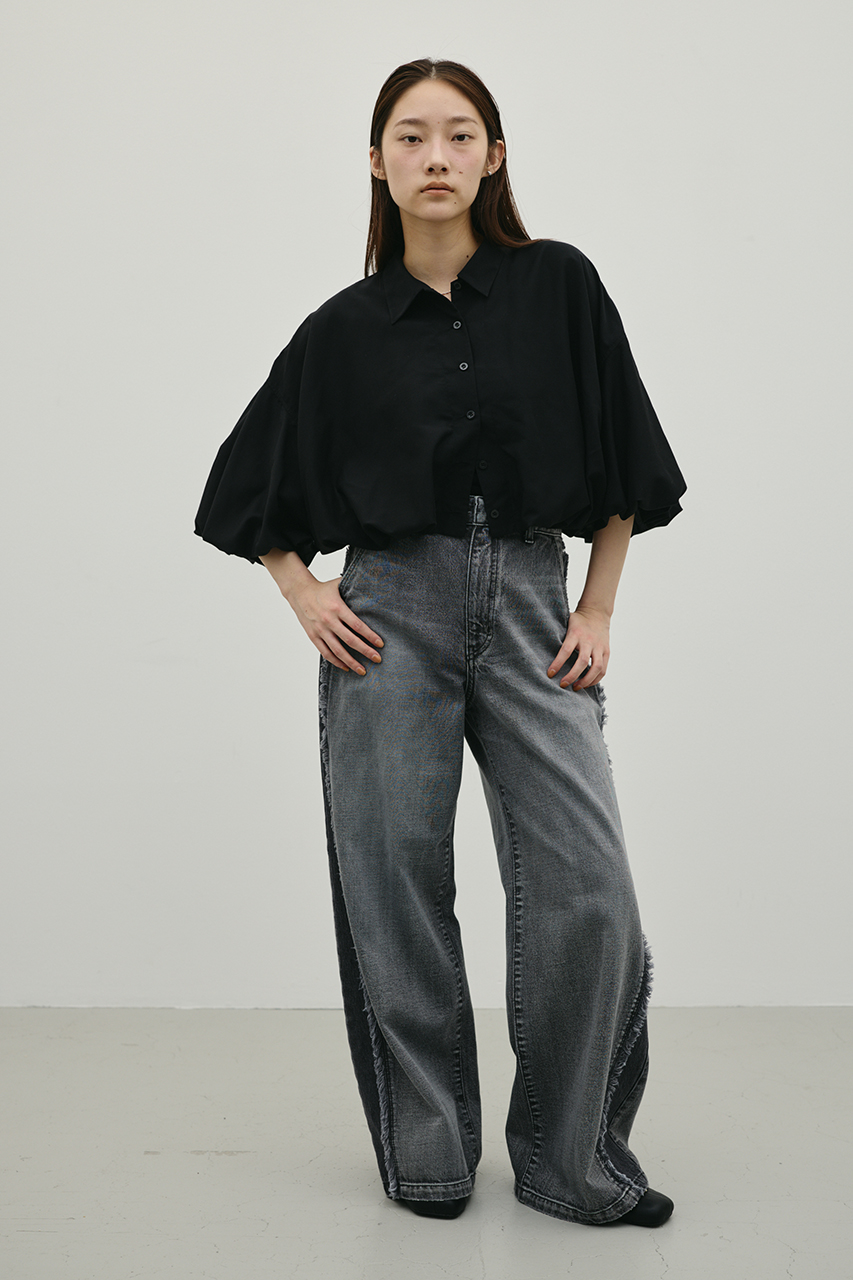 袖と身頃を裏地で吊った、立体的なバルーンシルエットが印象的なデザインシャツ。ドロップショルダーとゆったりとした袖が、抜け感のあるバランスを演出します。程よいクロップド丈でスタイルアップも叶えつつ、身体を締め付けないノンストレスな着心地が叶います。シンプルな中にさりげないデザイン性を感じられる、洗練された一枚です。