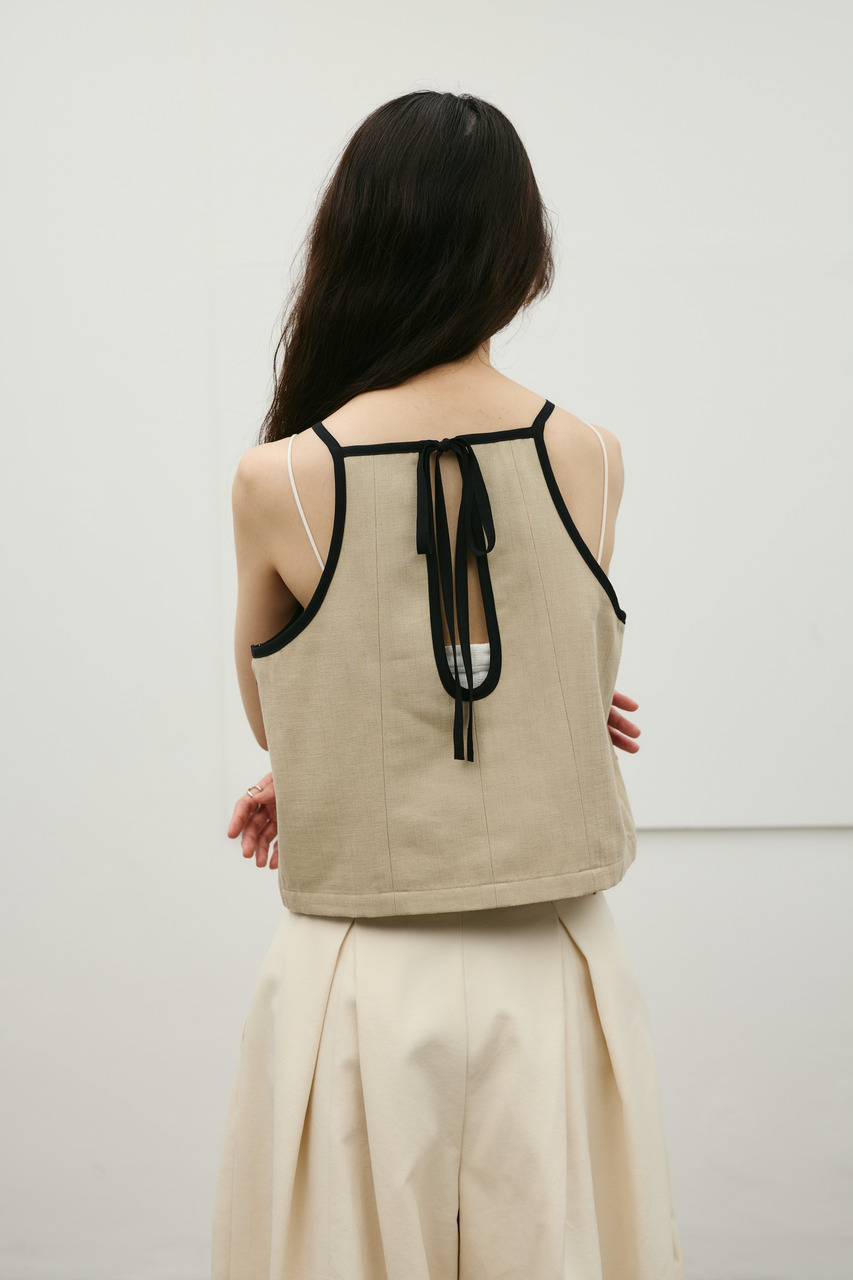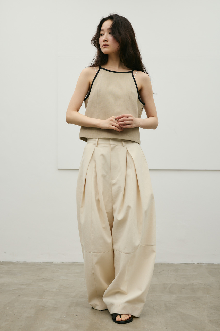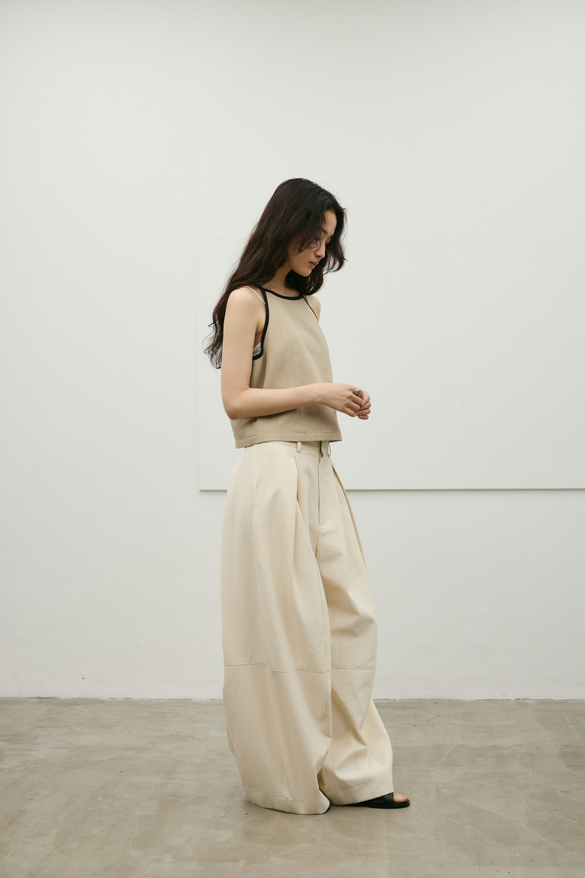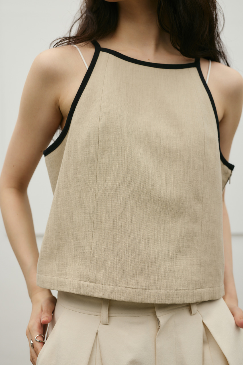 バイカラーのトリミングがアクセントになったコンパクトなアメリカンスリーブのタンクキャミ。テンセルコットンリネン素材を使用し、表面にほどよい変化感のあるサラッとしたドライな質感が特徴。肌触りが良くシワになりにくいのも魅力。カジュアルからきれいめまで幅広く使える、快適で上品な一枚です。500JSB31-3861(セットアップバイカラーパンツ)とセットアップ着用可能。ストレッチなし、透け感なし。