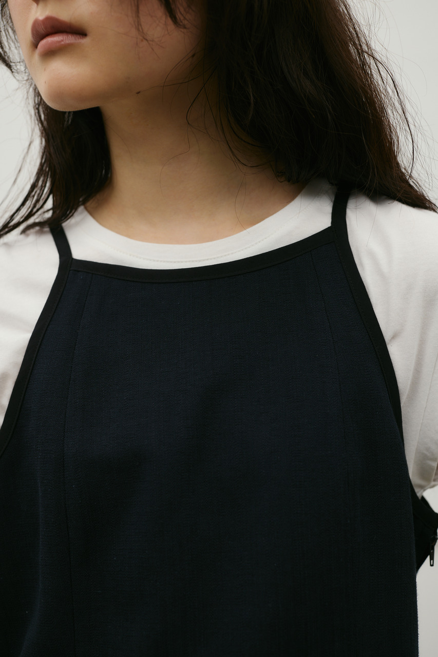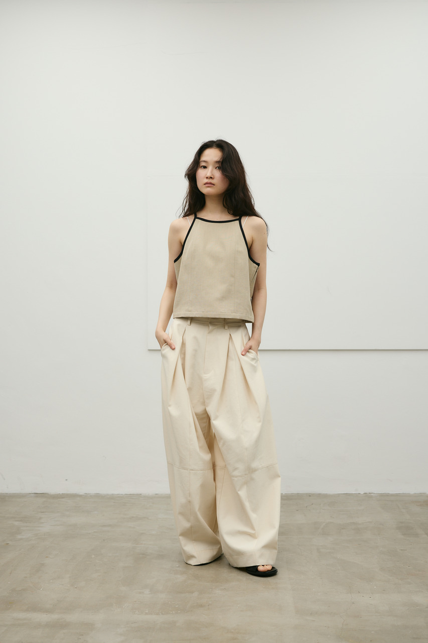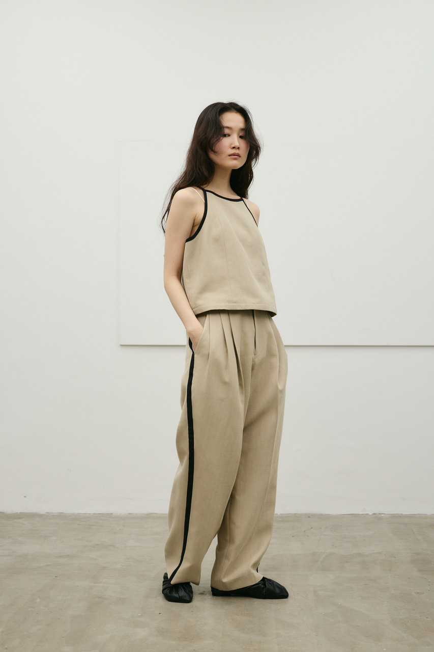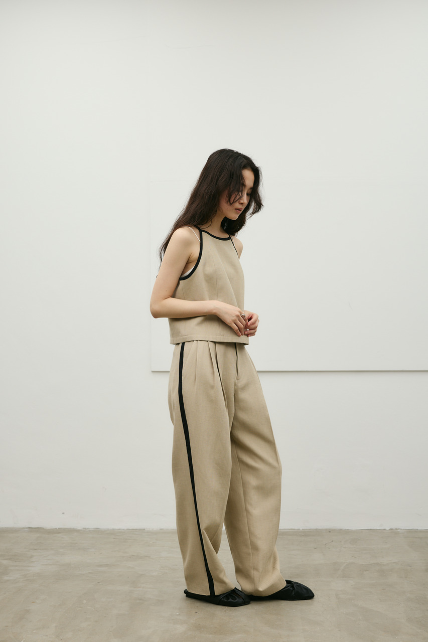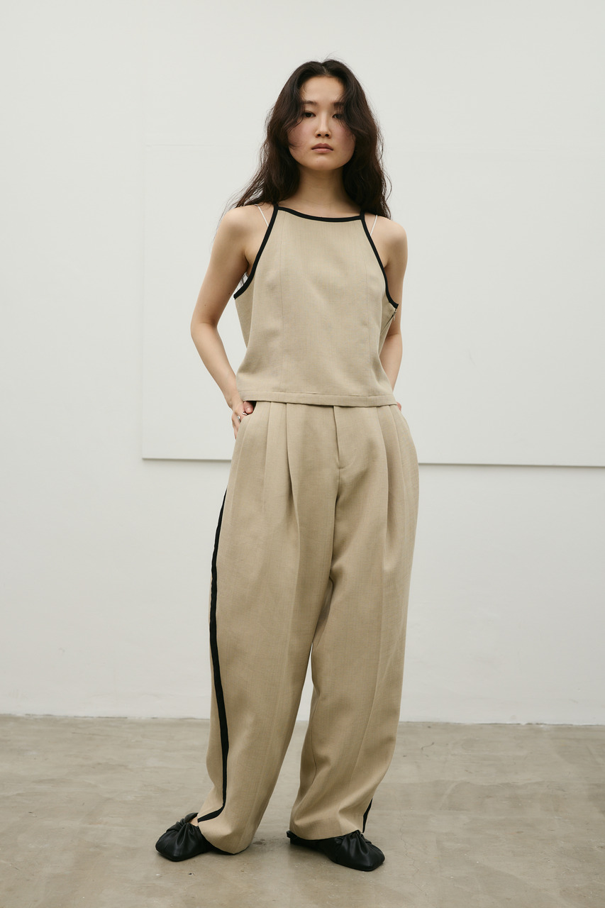 バイカラーのトリミングがアクセントになったコンパクトなアメリカンスリーブのタンクキャミ。テンセルコットンリネン素材を使用し、表面にほどよい変化感のあるサラッとしたドライな質感が特徴。肌触りが良くシワになりにくいのも魅力。カジュアルからきれいめまで幅広く使える、快適で上品な一枚です。500JSB31-3861(セットアップバイカラーパンツ)とセットアップ着用可能。ストレッチなし、透け感なし。