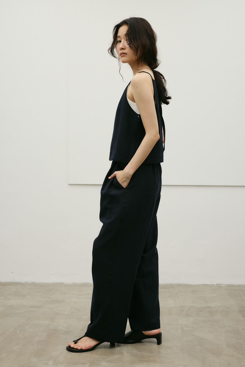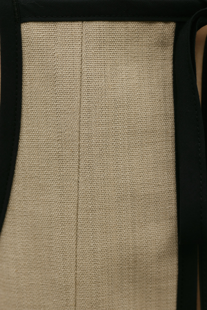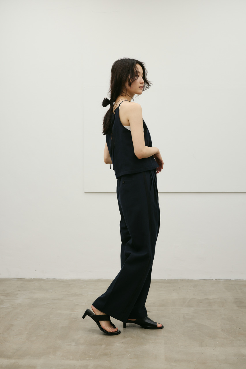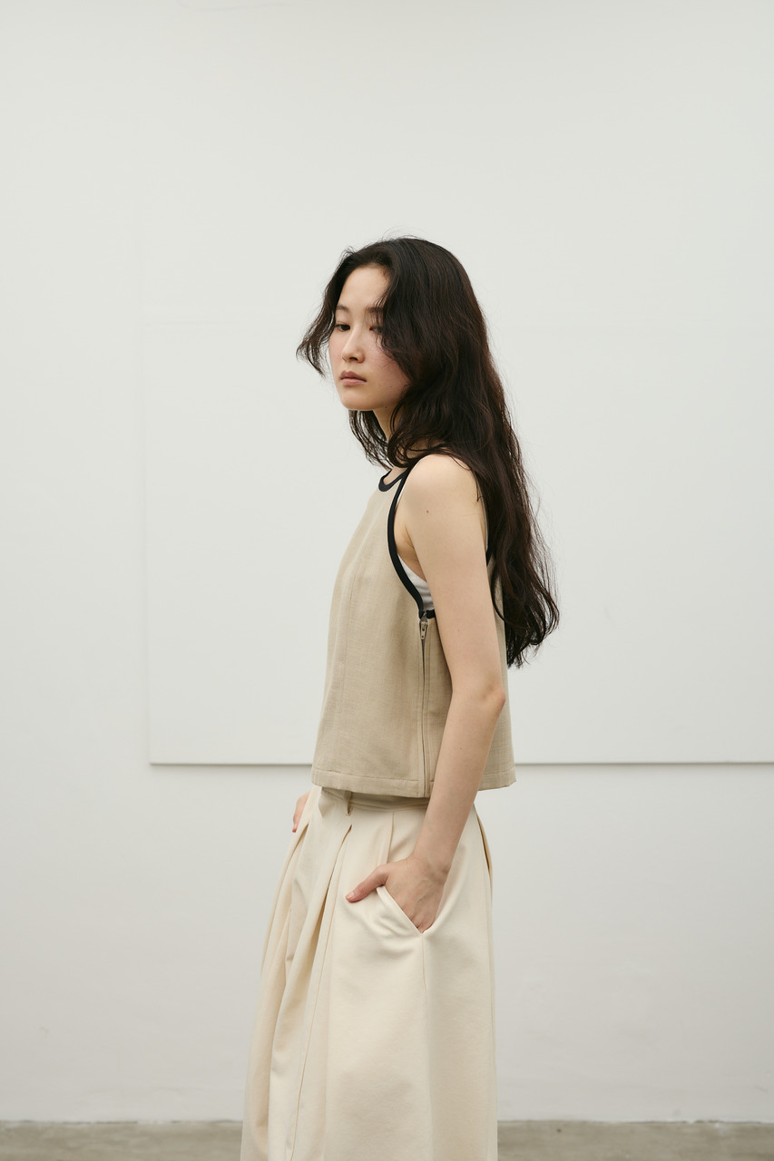 バイカラーのトリミングがアクセントになったコンパクトなアメリカンスリーブのタンクキャミ。テンセルコットンリネン素材を使用し、表面にほどよい変化感のあるサラッとしたドライな質感が特徴。肌触りが良くシワになりにくいのも魅力。カジュアルからきれいめまで幅広く使える、快適で上品な一枚です。500JSB31-3861(セットアップバイカラーパンツ)とセットアップ着用可能。ストレッチなし、透け感なし。