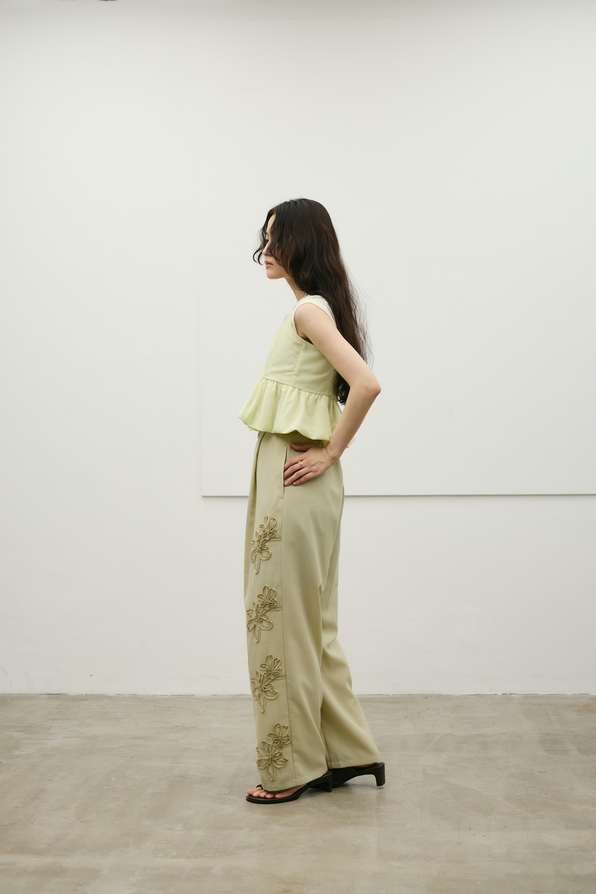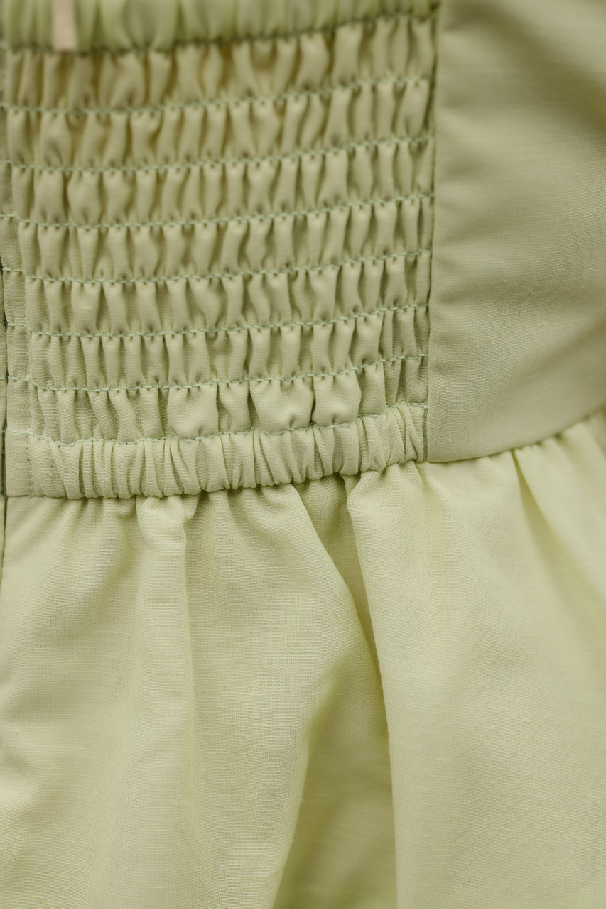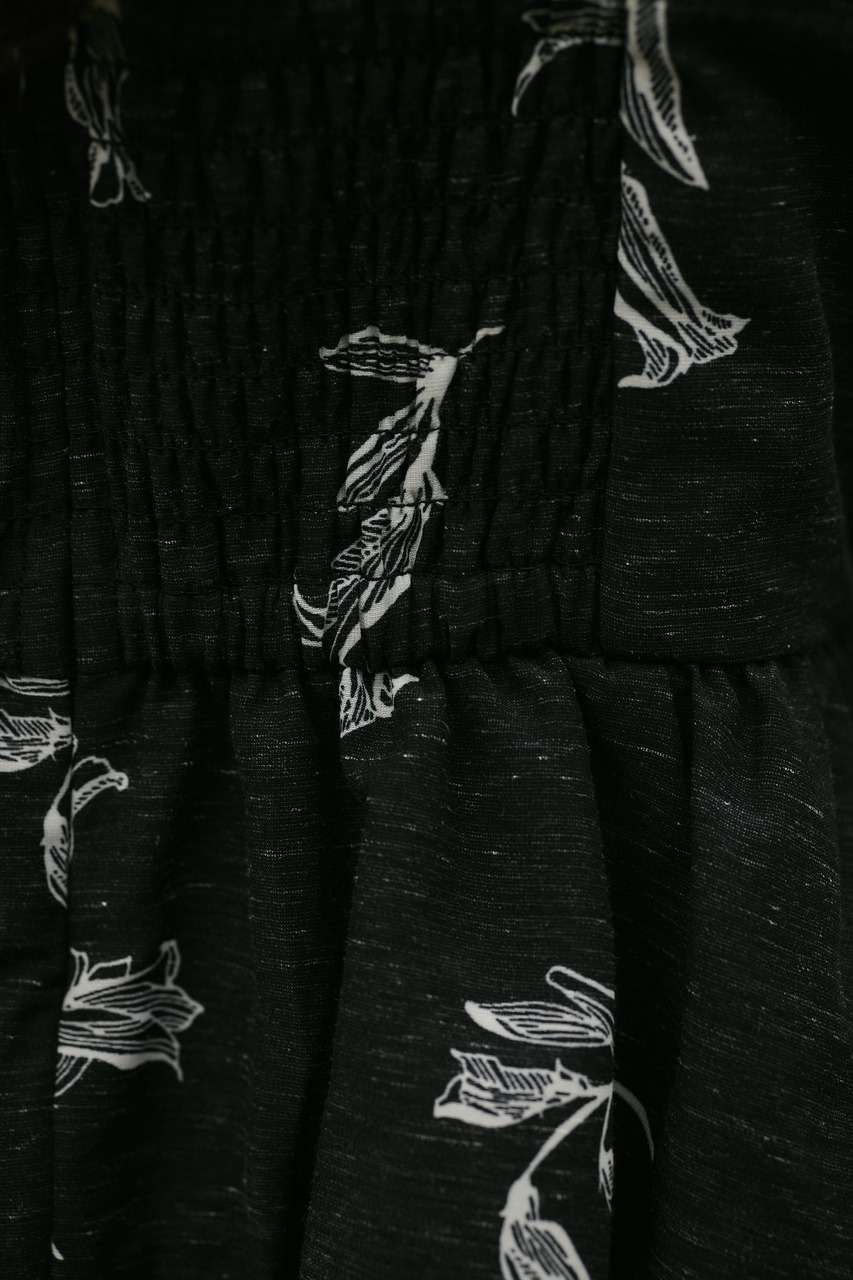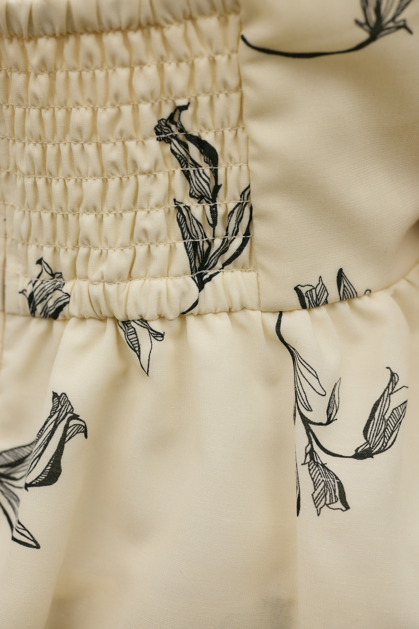 胸下の切り替えからふんわりと広がるシルエットが、軽やかな表情を演出。オリジナルのフラワープリントは、線画タッチで甘くなりすぎず大人っぽい印象に仕上げています。裾はバルーン仕様で立体感をプラス。ショート丈デザインでバランスが取りやすく、ボトムスを選ばず着用いただきやすい一枚。ポリエステルに麻をミックスした素材を使用し、軽やかで扱いやすく、ナチュラルな風合いが魅力。天然素材特有の節感があり、表情のある仕上がりになっています。ストレッチ、透け感ややあり(裏地あり)