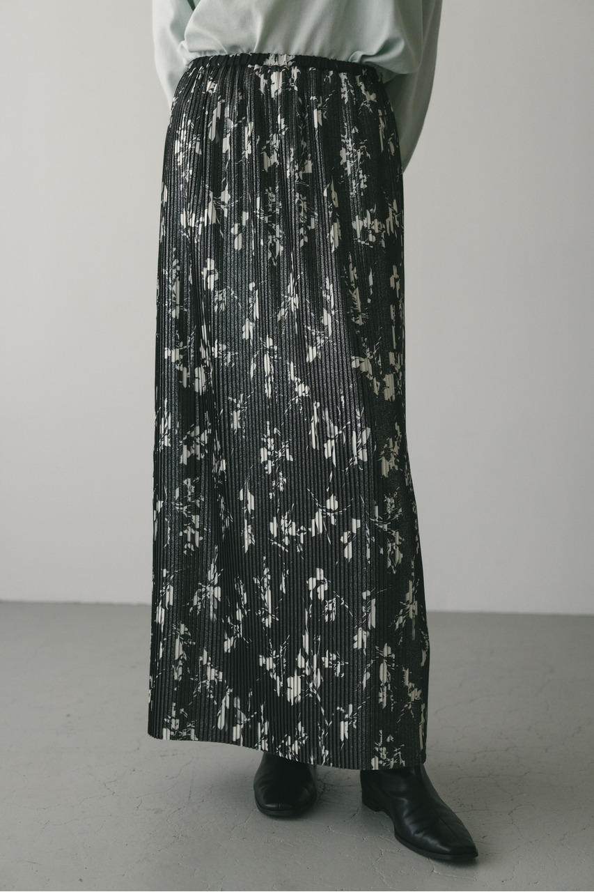 オリジナルのフラワー柄に箔プリントをトッピングしたプリーツスカート。程よい光沢感で上品に着用いただけます。すとんとしたナローシルエットは縦長のすっきりとしたデザインでボリュームのあるトップスとも合わせやすい一枚です。ウエストゴム仕様。ストレッチなし、透け感なし。