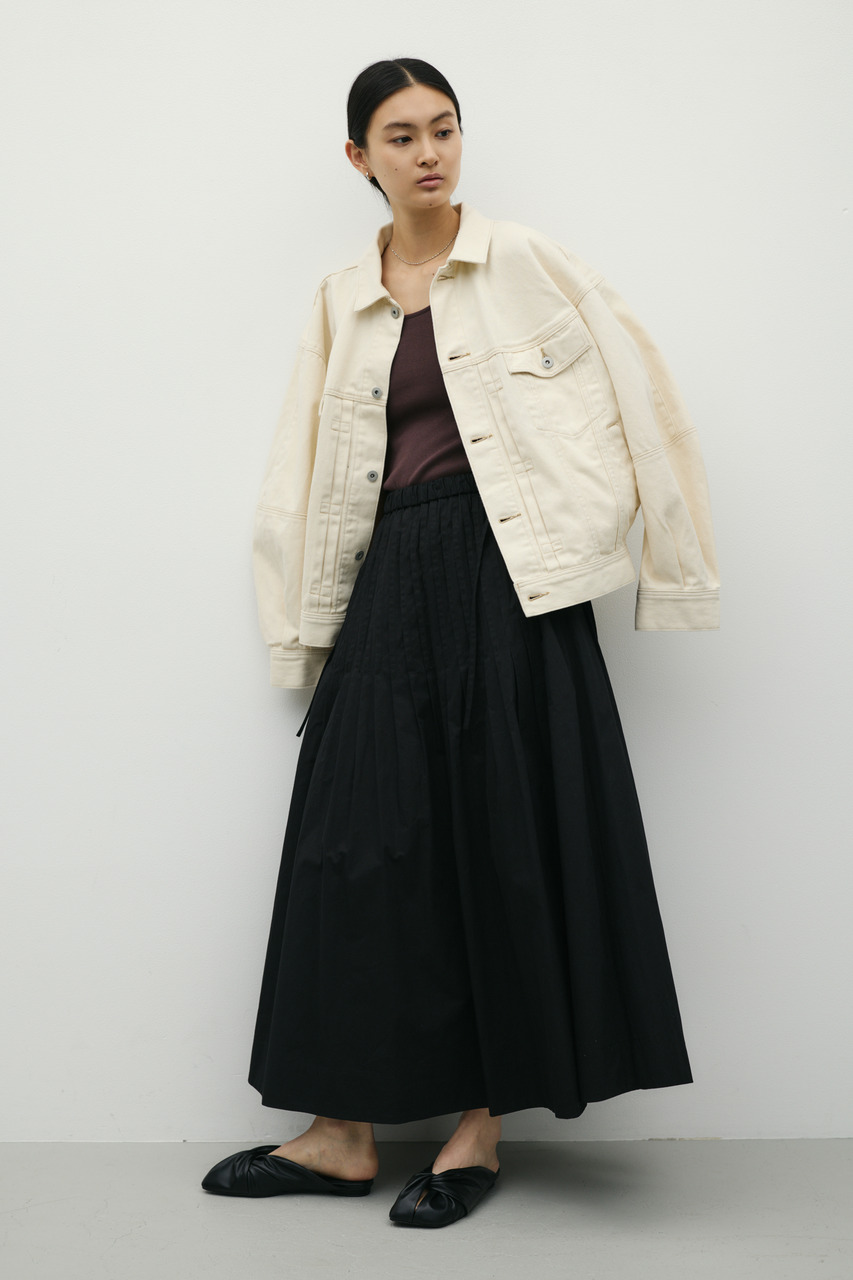 ボリューム感とハリのある素材でふんわり広がるフレアシルエットが魅力のタックプリーツスカート。程よくカジュアルな着こなしが楽しめる素材感でデイリーコーデにこなれ感をプラス。シンプルなトップスと合わせるだけで、ボリューム感を活かしたおしゃれなスタイルが完成します。ウエストは調節可能。透け感なし、ストレッチなし。