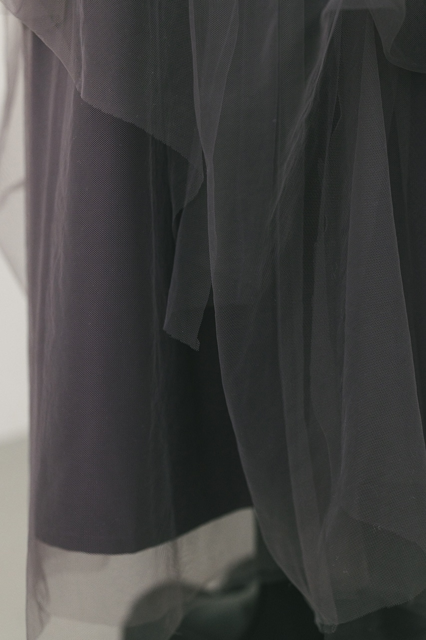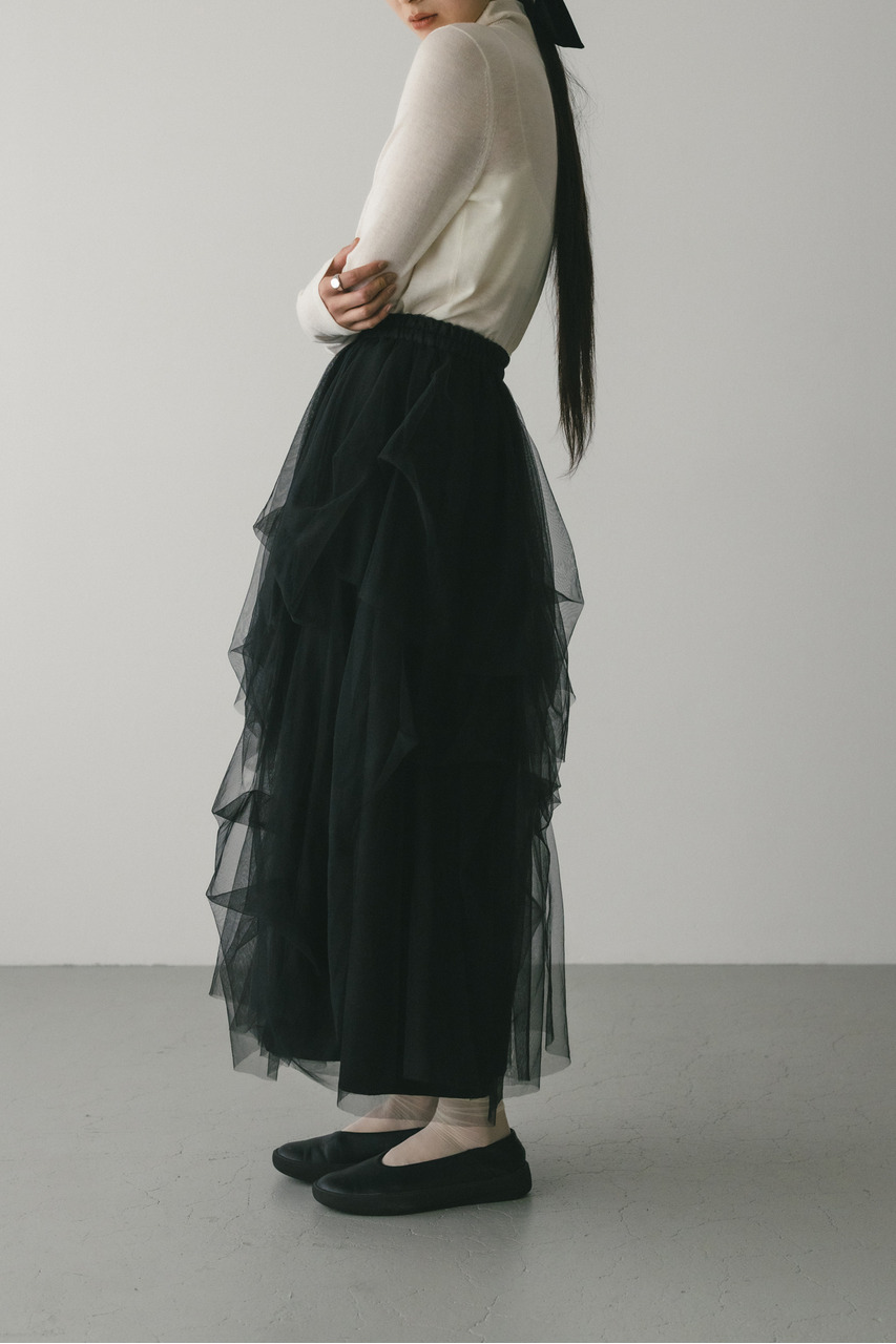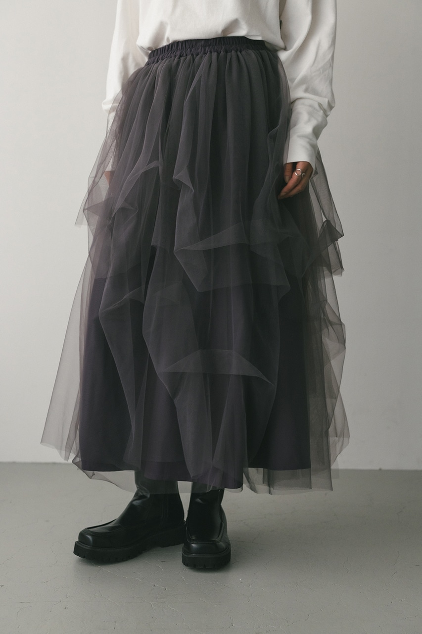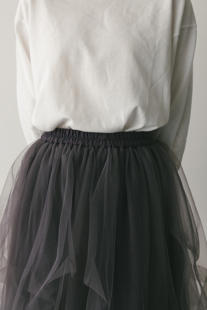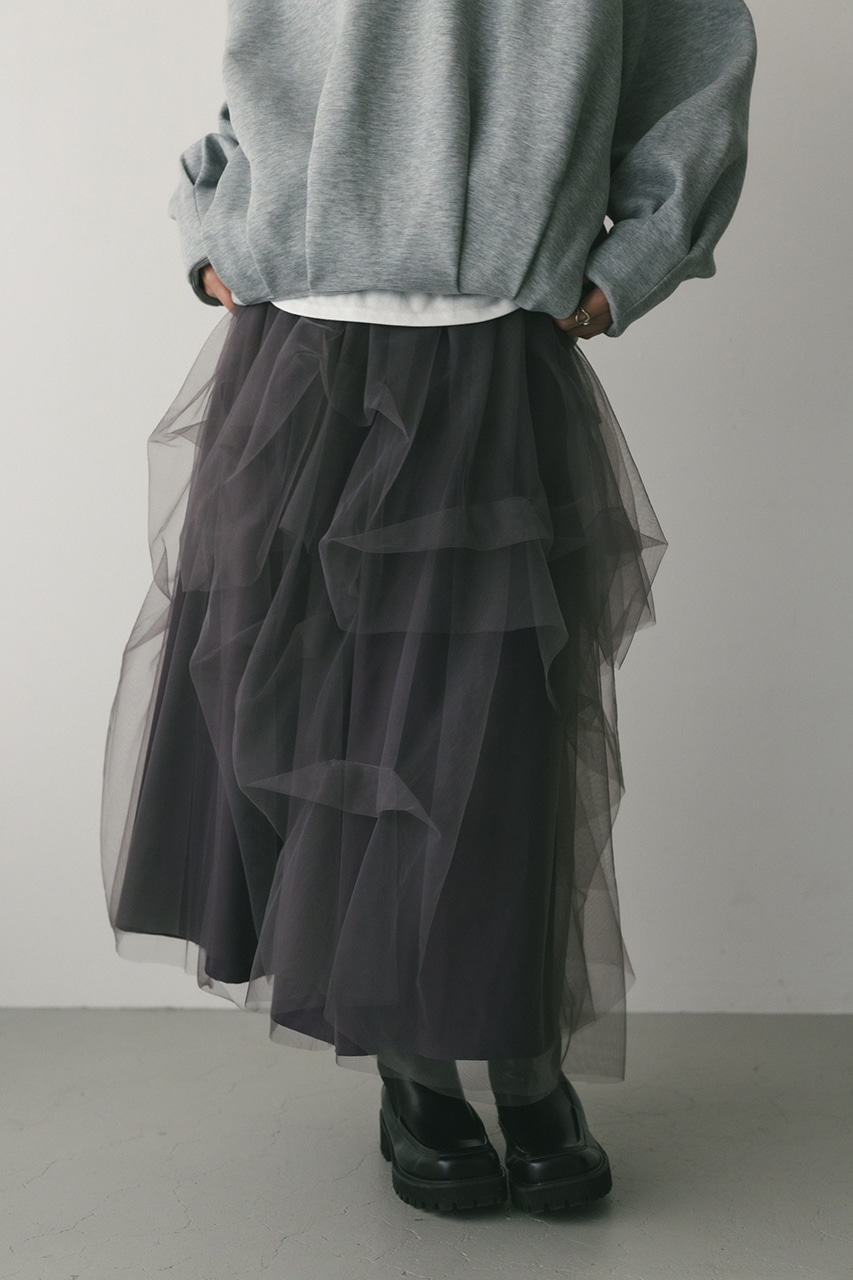 軽いチュール素材でランダムにタッキングを施した抜け感のあるフォルムが可愛いスカート。主役アイテムでスタイリングを華やかでおしゃれに導きます。ウエストゴム仕様。裏地付き。ストレッチなし、透け感なし。