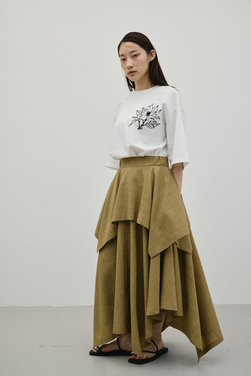 まるで四角い布を重ねたような、構築的なパターンにこだわったレイヤードフレアスカート。2段ティアードデザインが生み出す奥行きと立体感で、動くたびに美しく揺れる一枚です。直線的なカッティングとフレアの柔らかさを掛け合わせ、甘くなりすぎないモードな印象に仕上げました。シンプルなトップスを合わせるだけで、洗練されたスタイリングが完成。ウエストまわりはすっきりと、裾に向かって広がるシルエットでバランスよく着用可能。デイリーからお出かけまで幅広く活躍します。ストレッチなし、透け感なし。