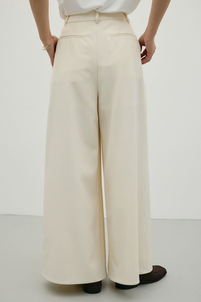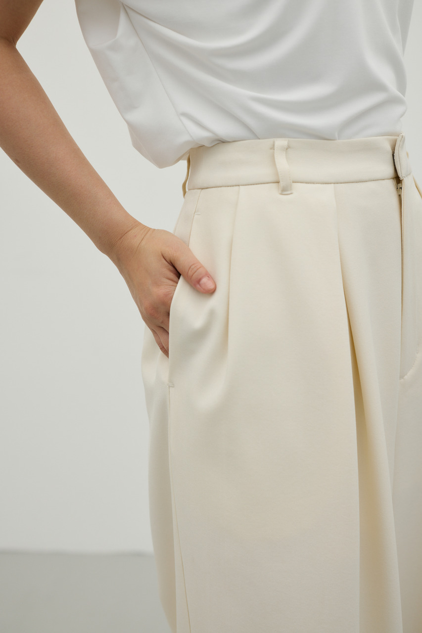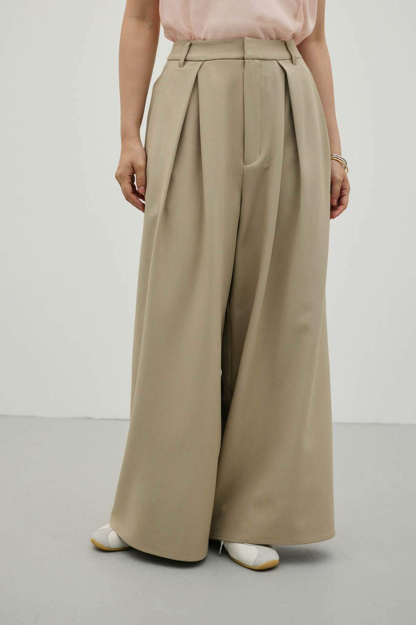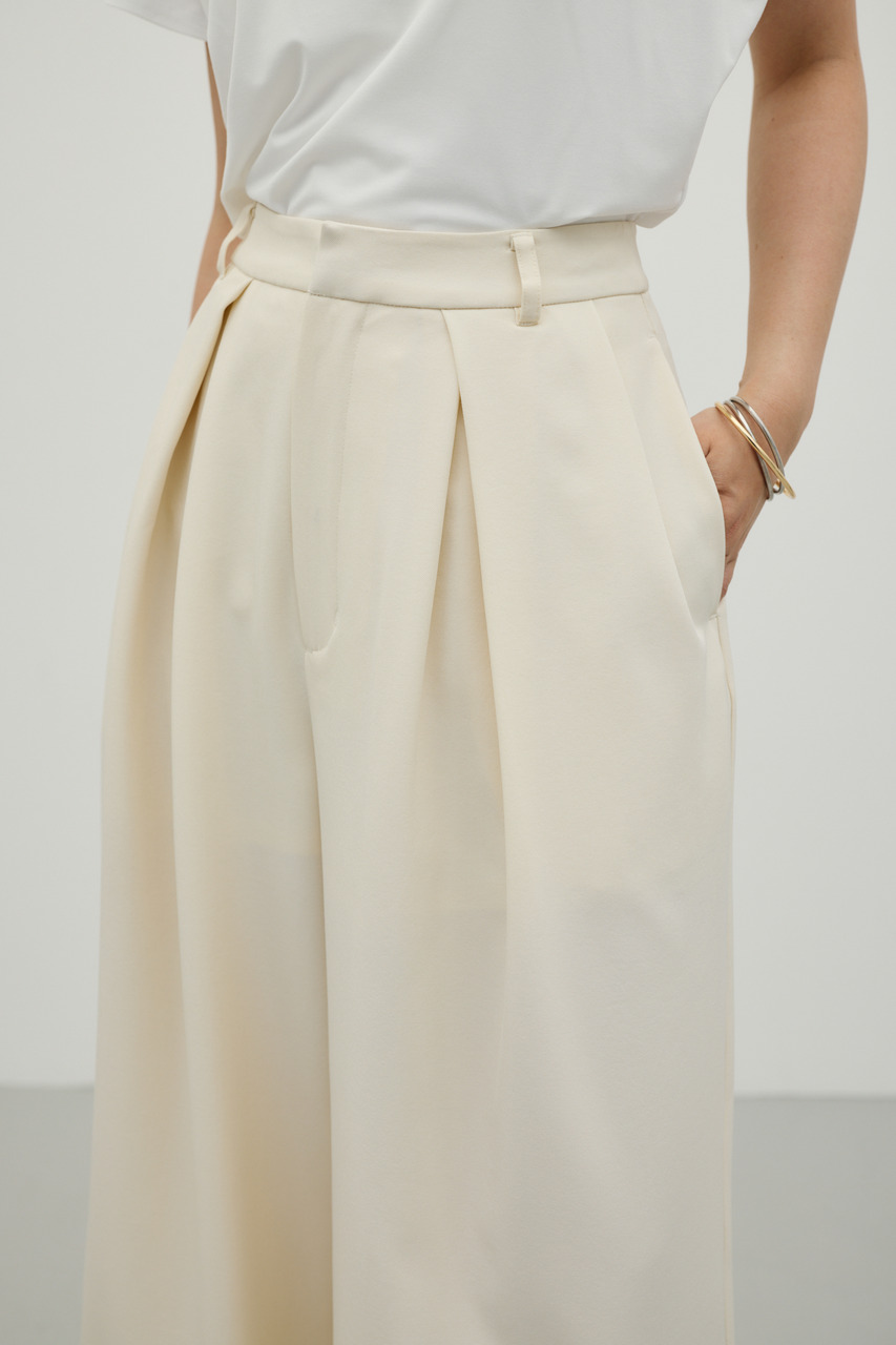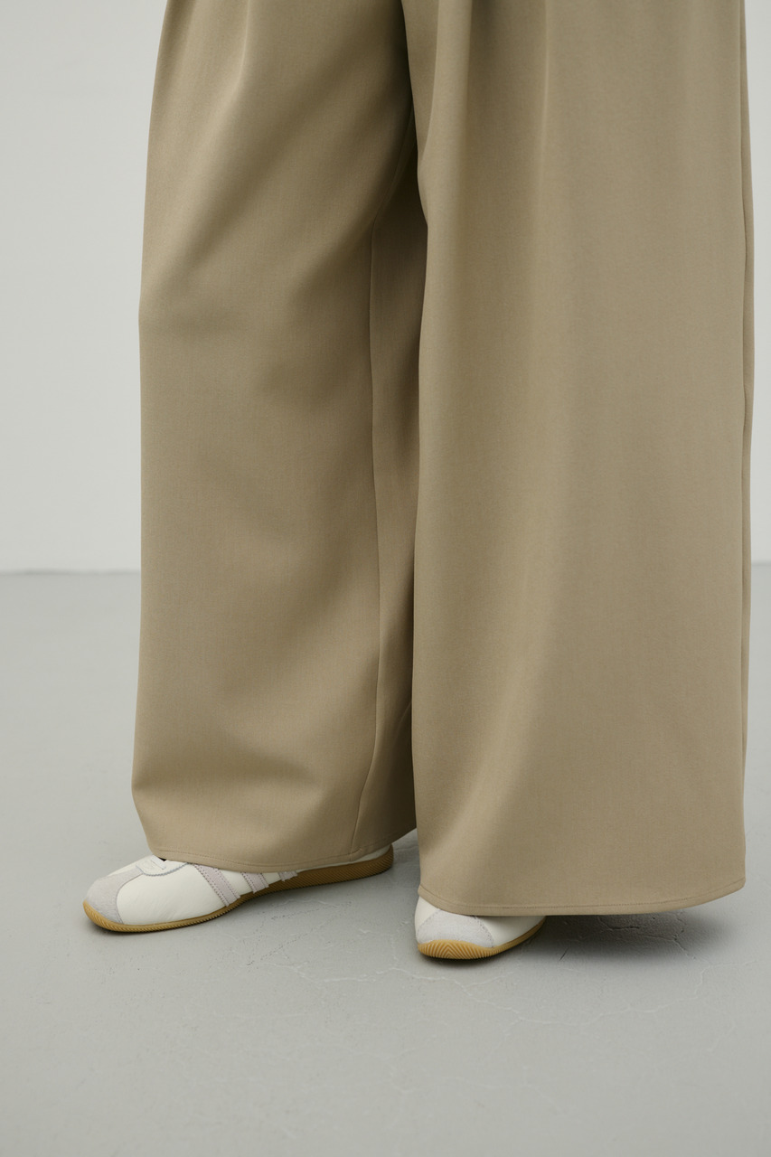 ロ―ウエストデザインがトレンド感を演出するタックワイドパンツ。フロントに施したタックが立体感を生み、ワイドながらもすっきりとしたシルエットに仕上げました。程よくルーズなサイズ感で、気になる腰回りや脚のラインを自然にカバー。リラックス感のある履き心地ながら、きちんと見えも叶える一枚です。コンパクトなトップスやクロップド丈と合わせれば、バランスの良い旬なスタイリングに。カジュアルからきれいめまで幅広いコーディネートに対応し、デイリーに活躍します。透け感なし、ストレッチなし。