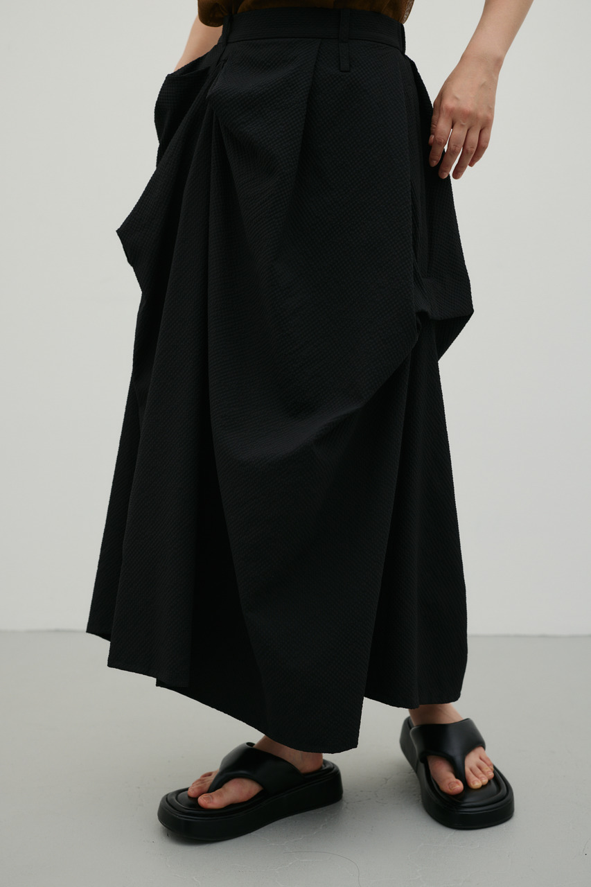 ランダムタックをあしらったサッカー素材のスカート。軽やかで通気性に優れた素材感が特徴で、快適な着心地を実現。ウエスト周りのタックが立体感のあるシルエットを作り、カジュアルからきれいめまで幅広く着こなせます。500JSB30-1791(ギャザーペプラムキャミ)とセットアップ着用可能です。ストレッチなし、透け感ややあり。