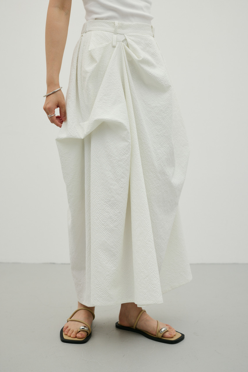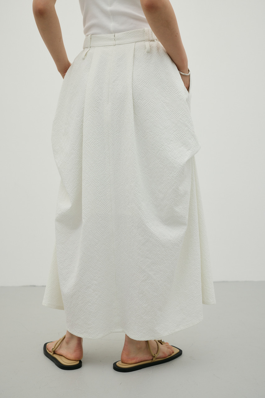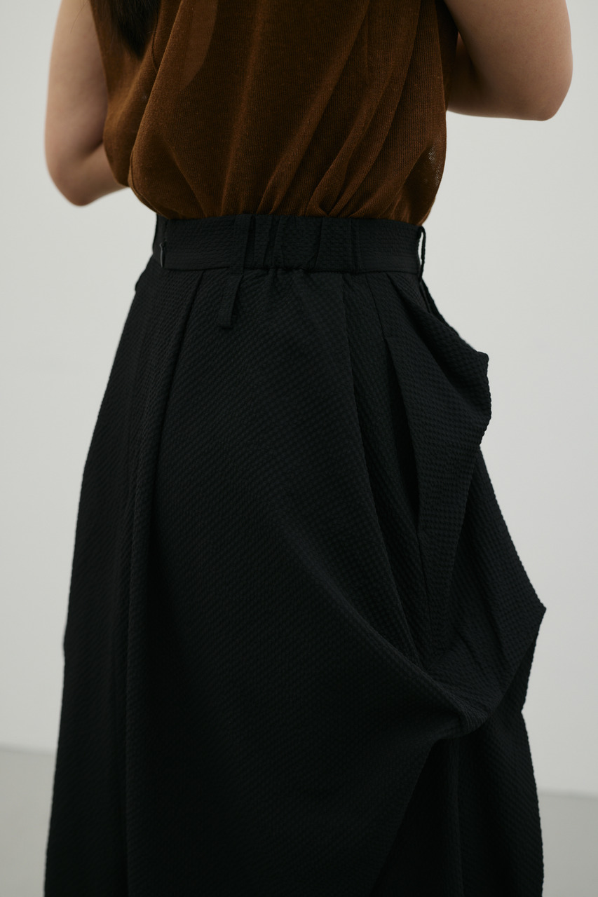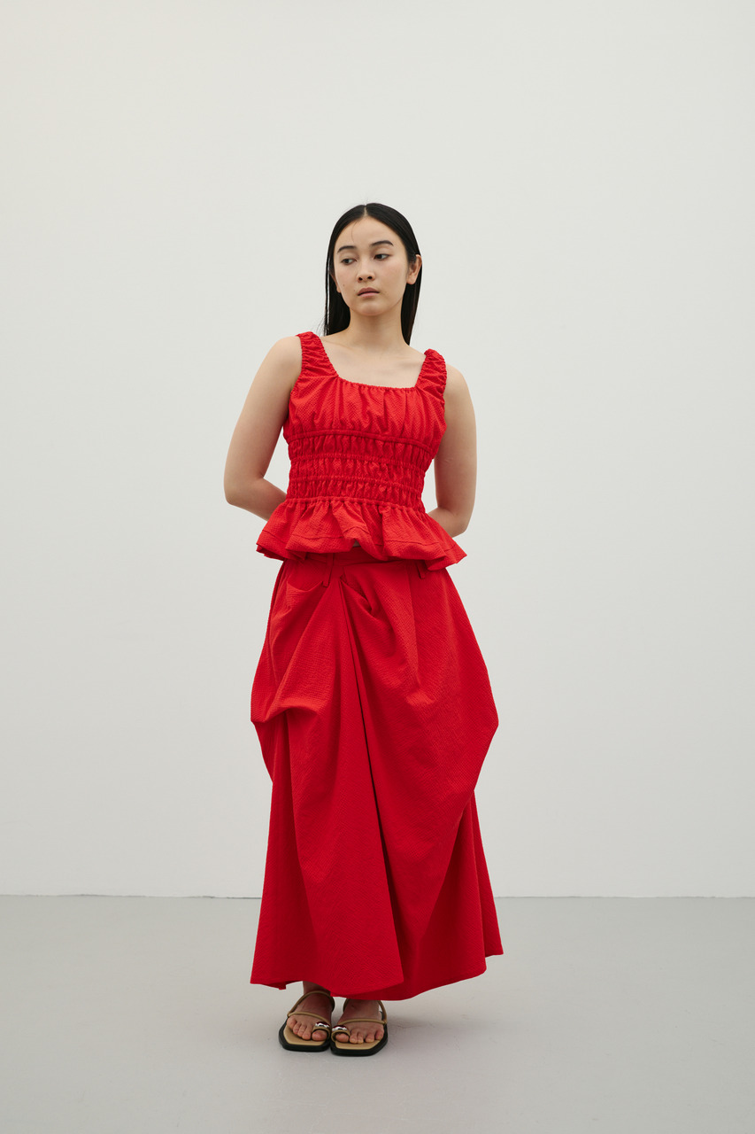 ランダムタックをあしらったサッカー素材のスカート。軽やかで通気性に優れた素材感が特徴で、快適な着心地を実現。ウエスト周りのタックが立体感のあるシルエットを作り、カジュアルからきれいめまで幅広く着こなせます。500JSB30-1791(ギャザーペプラムキャミ)とセットアップ着用可能です。ストレッチなし、透け感ややあり。