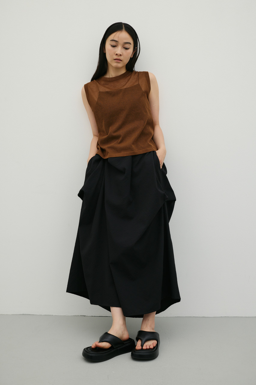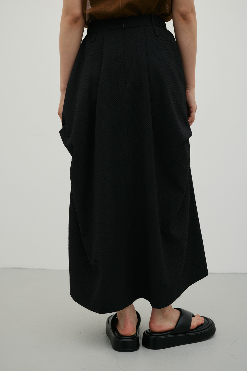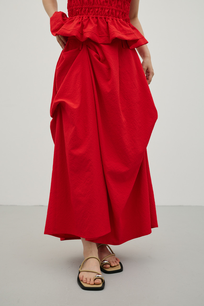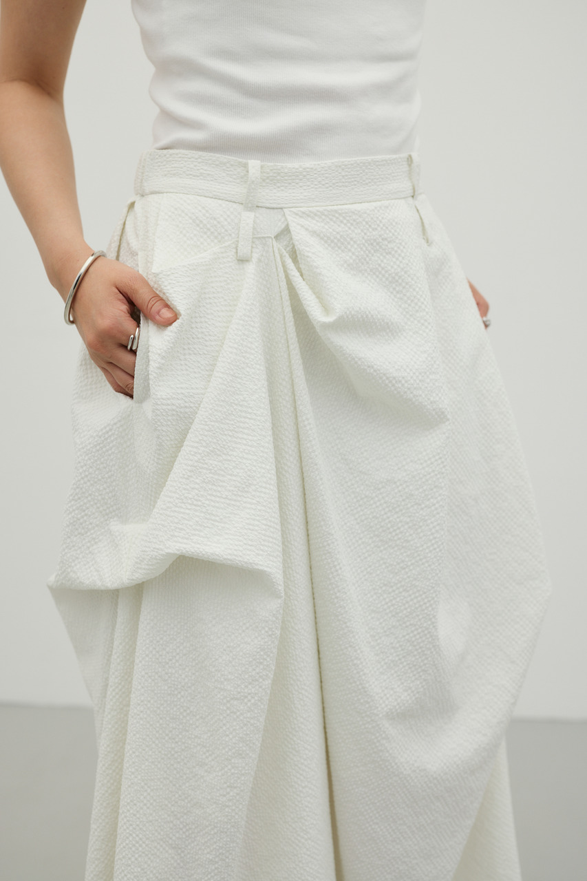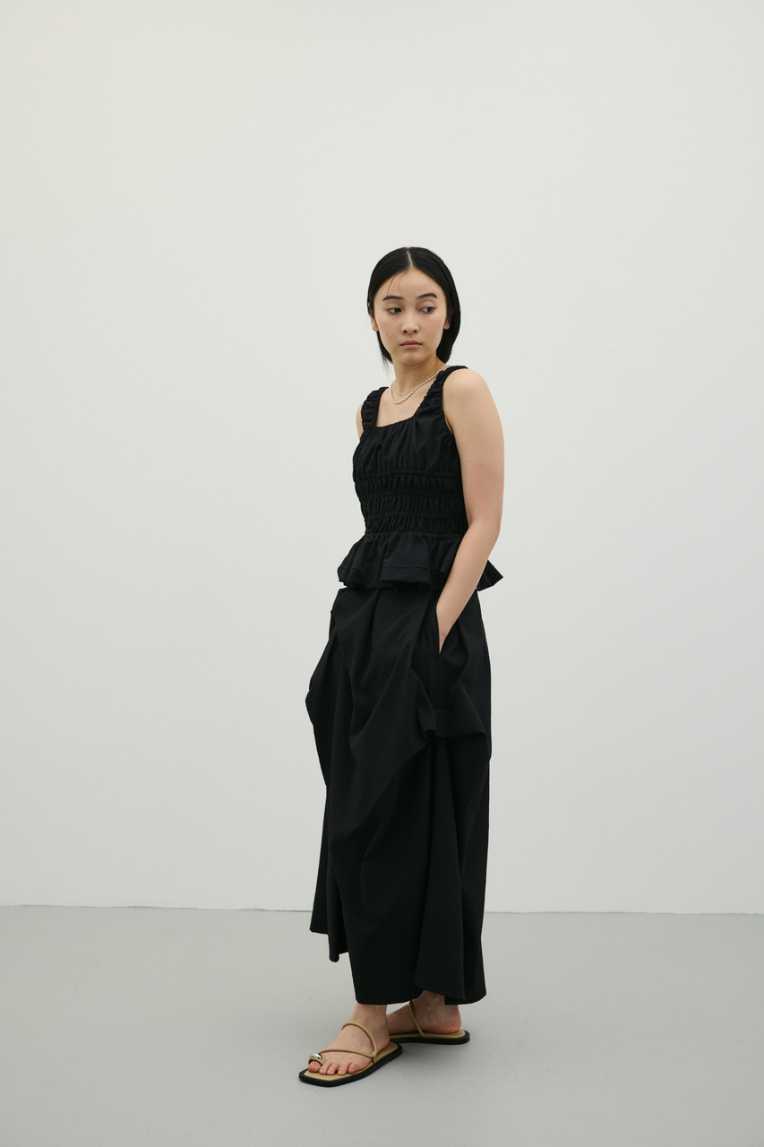 ランダムタックをあしらったサッカー素材のスカート。軽やかで通気性に優れた素材感が特徴で、快適な着心地を実現。ウエスト周りのタックが立体感のあるシルエットを作り、カジュアルからきれいめまで幅広く着こなせます。500JSB30-1791(ギャザーペプラムキャミ)とセットアップ着用可能です。ストレッチなし、透け感ややあり。