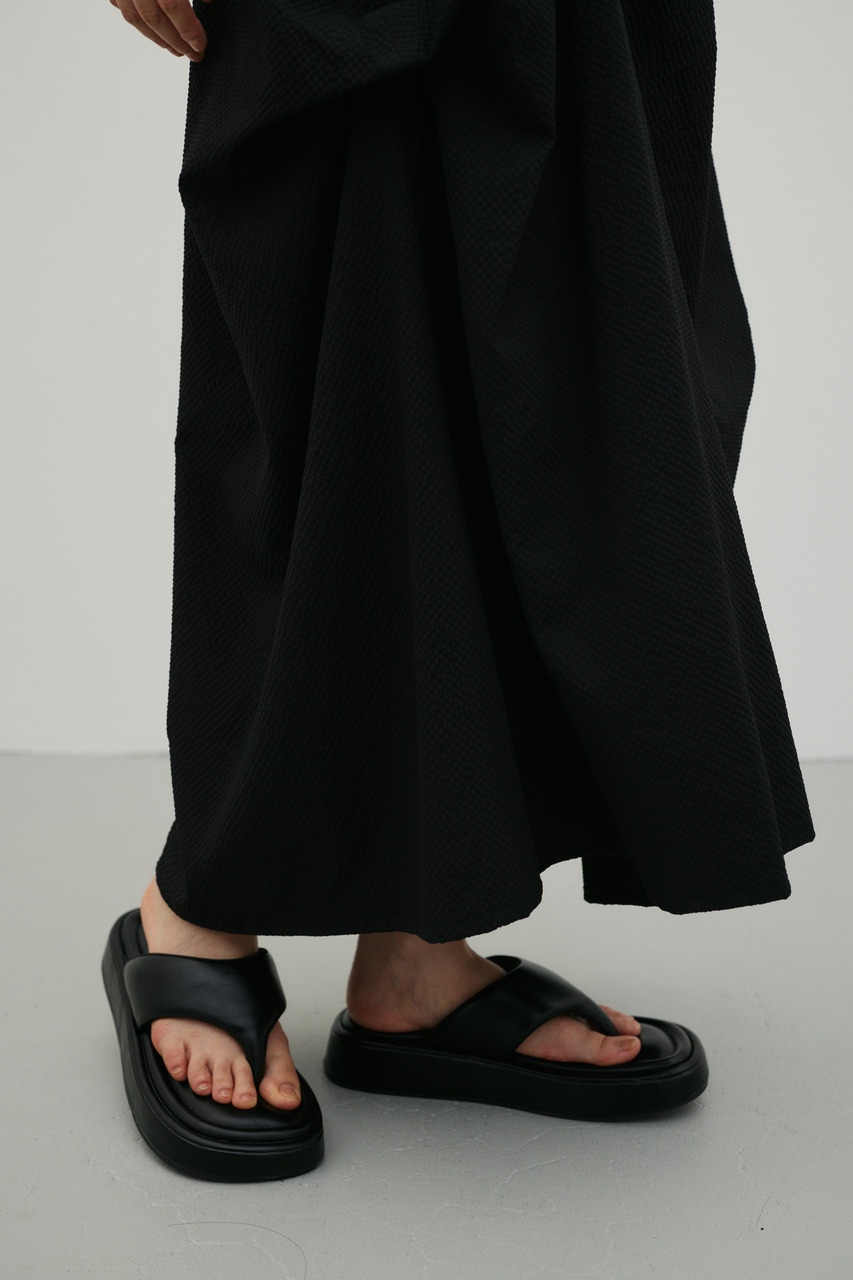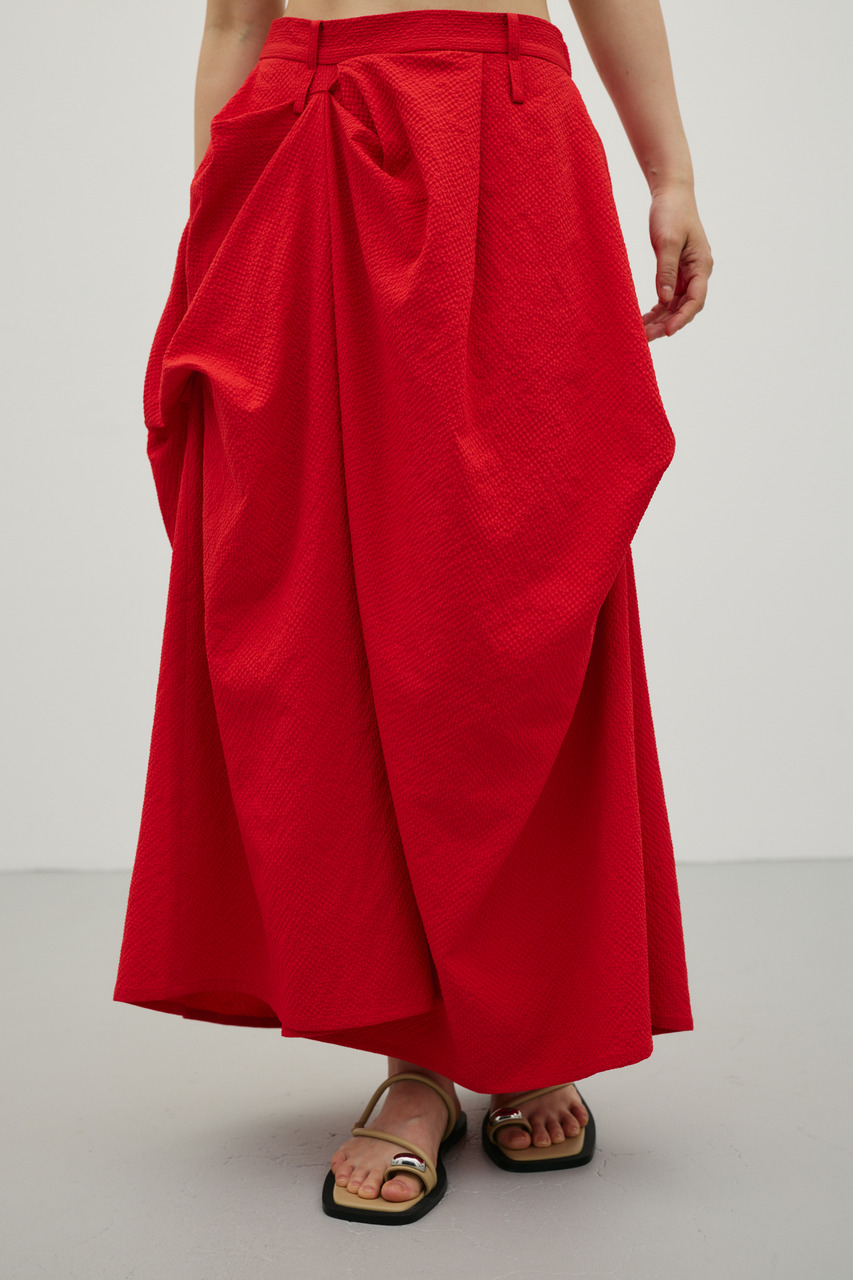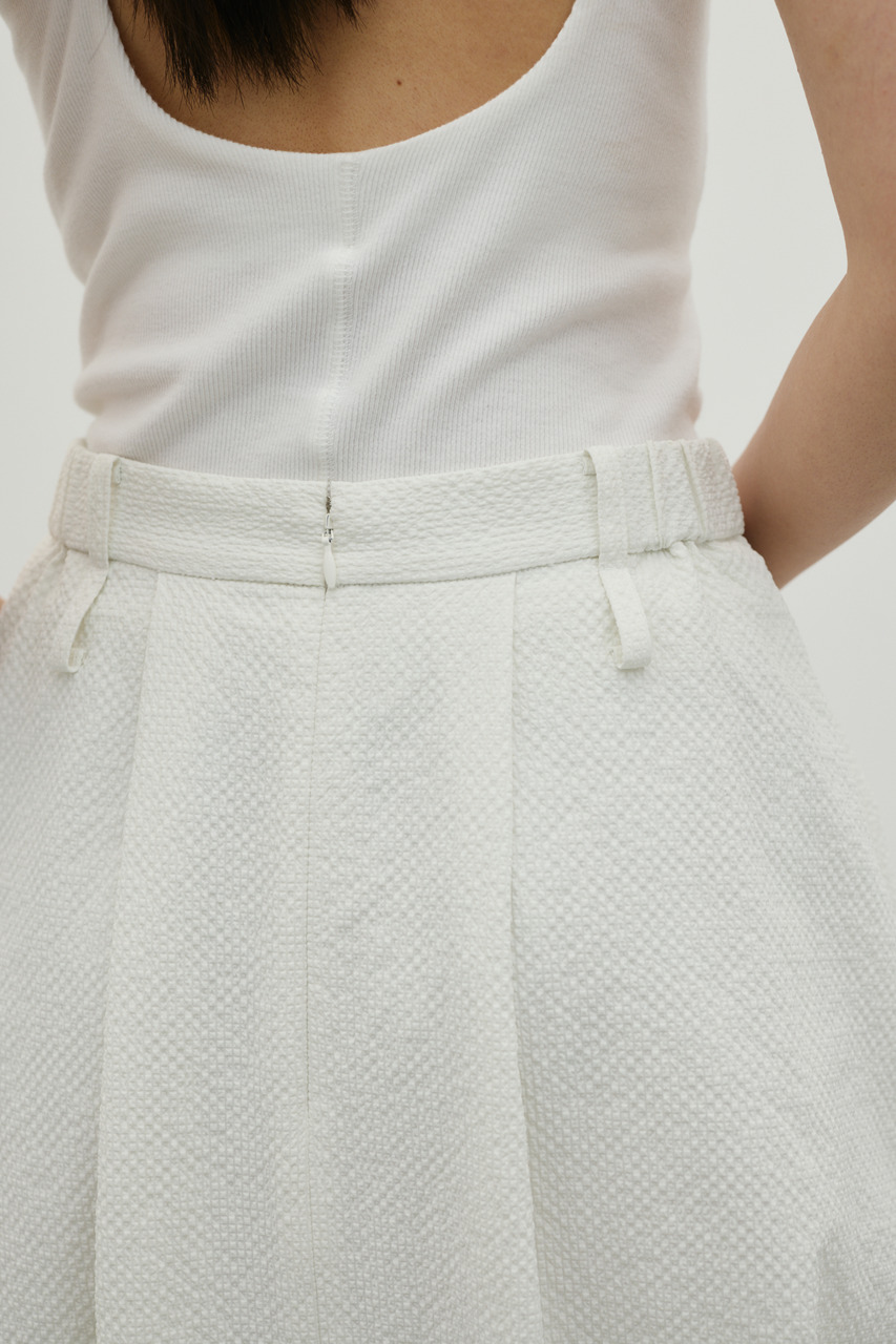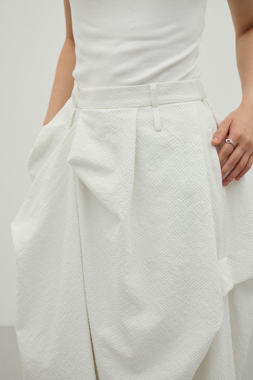 ランダムタックをあしらったサッカー素材のスカート。軽やかで通気性に優れた素材感が特徴で、快適な着心地を実現。ウエスト周りのタックが立体感のあるシルエットを作り、カジュアルからきれいめまで幅広く着こなせます。500JSB30-1791(ギャザーペプラムキャミ)とセットアップ着用可能です。ストレッチなし、透け感ややあり。