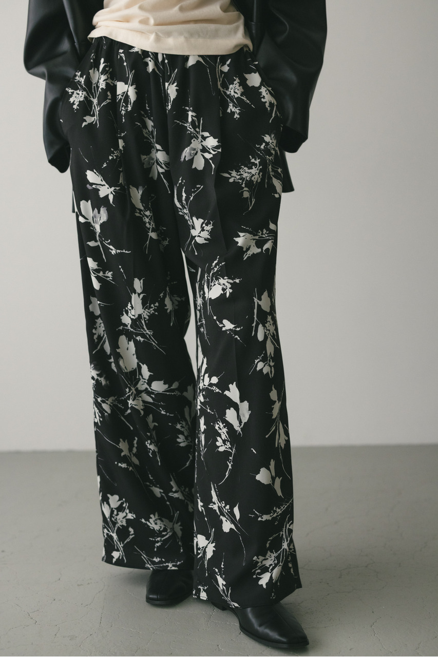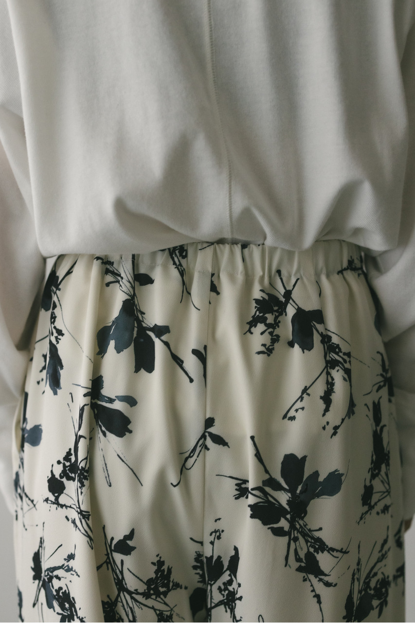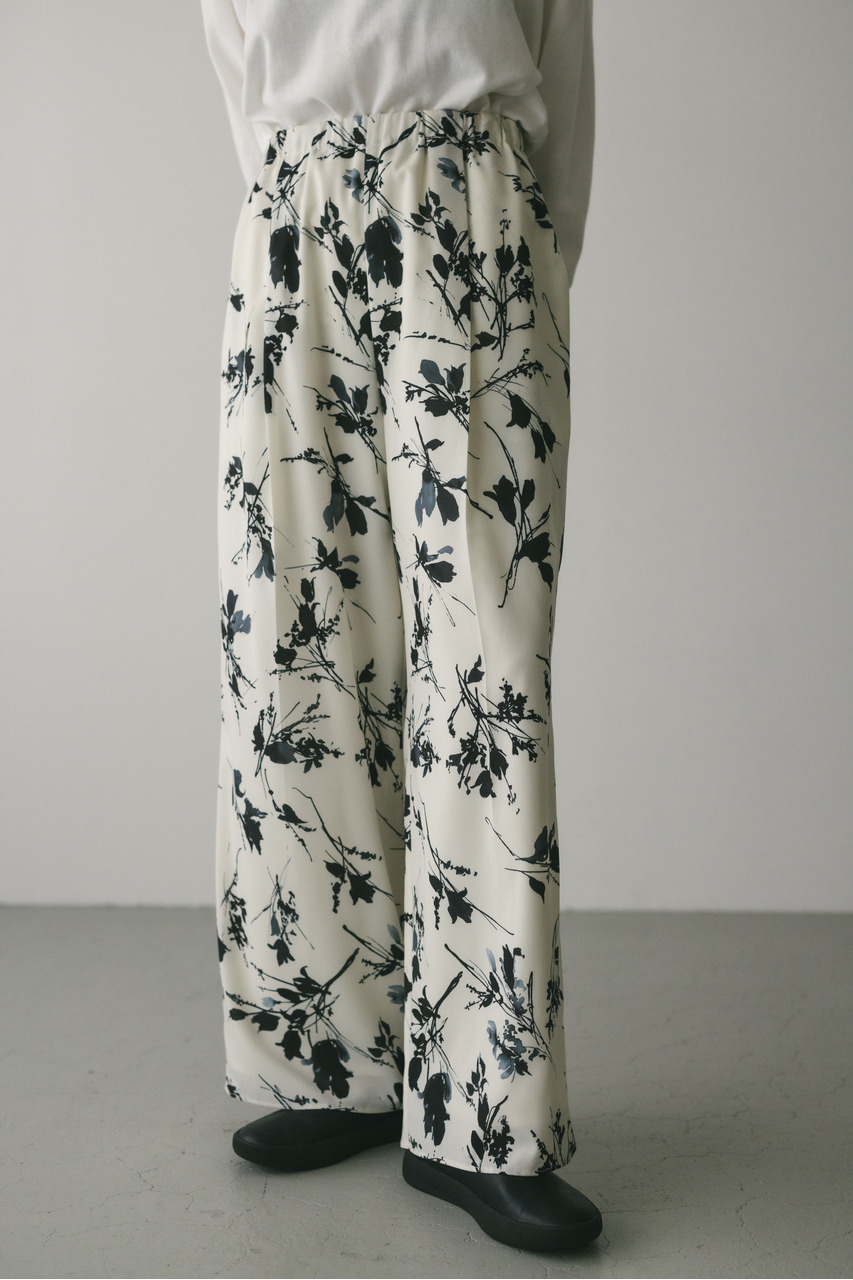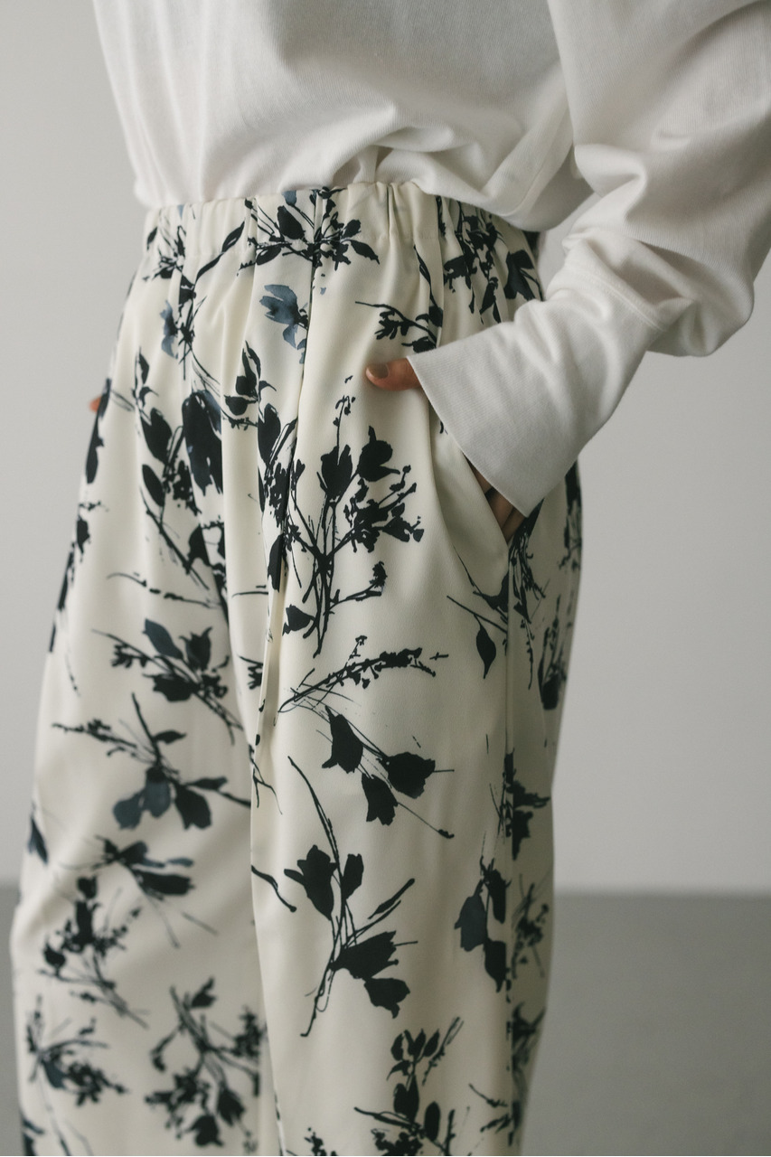 オリジナルのフラワープリントを施したウエストゴムのリラックスパンツ。春を感じさせる柔らかく軽やかな素材で仕上げました。ストレッチなし、透け感なし。