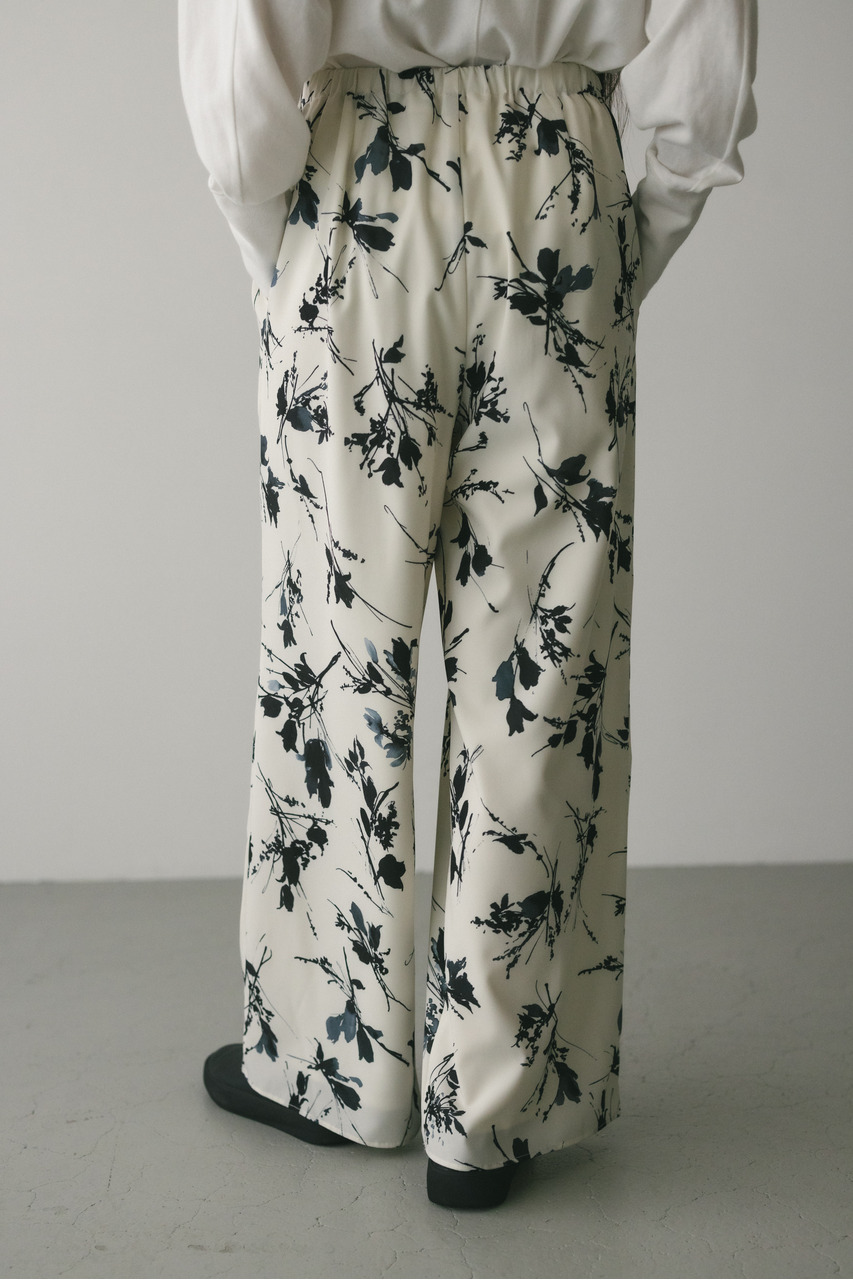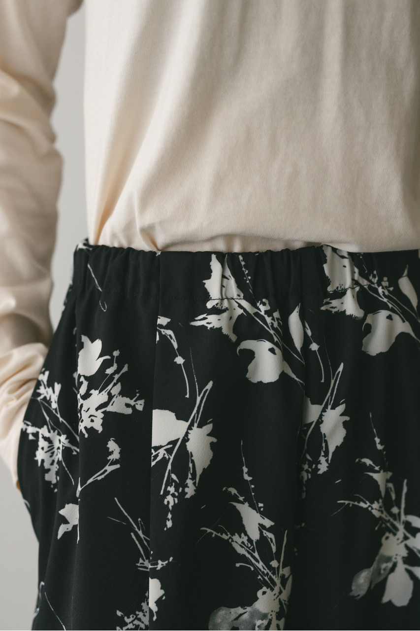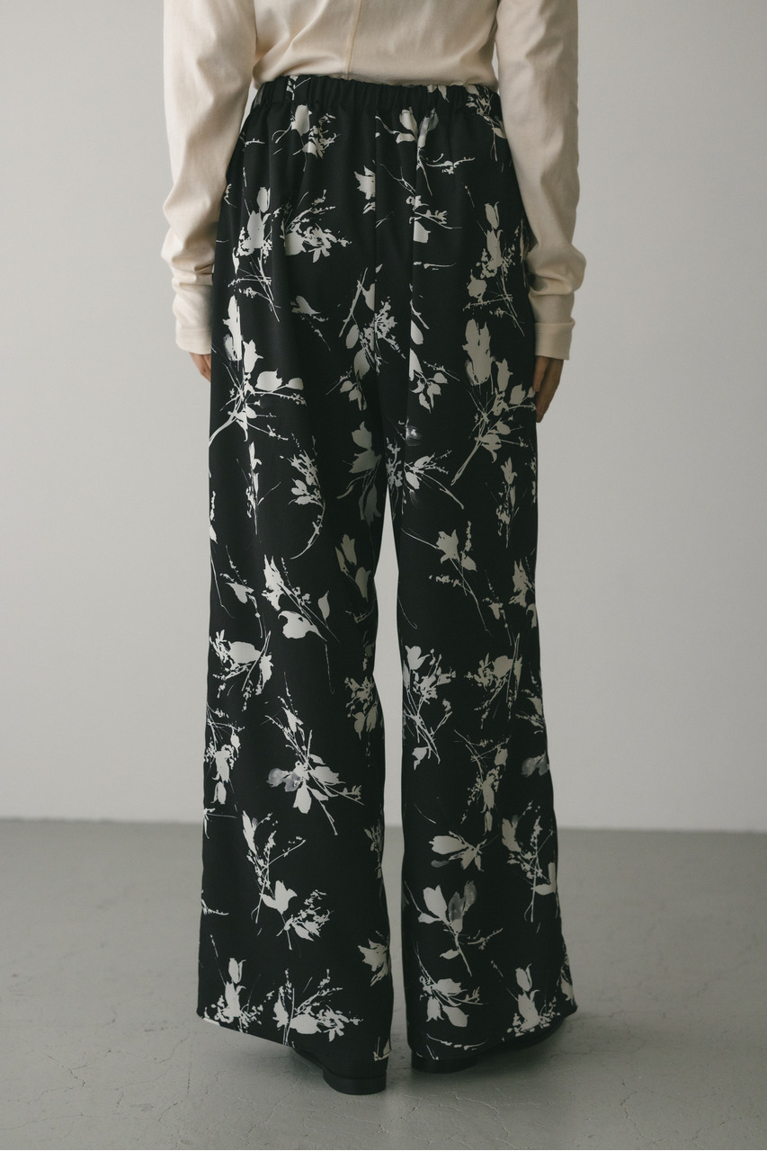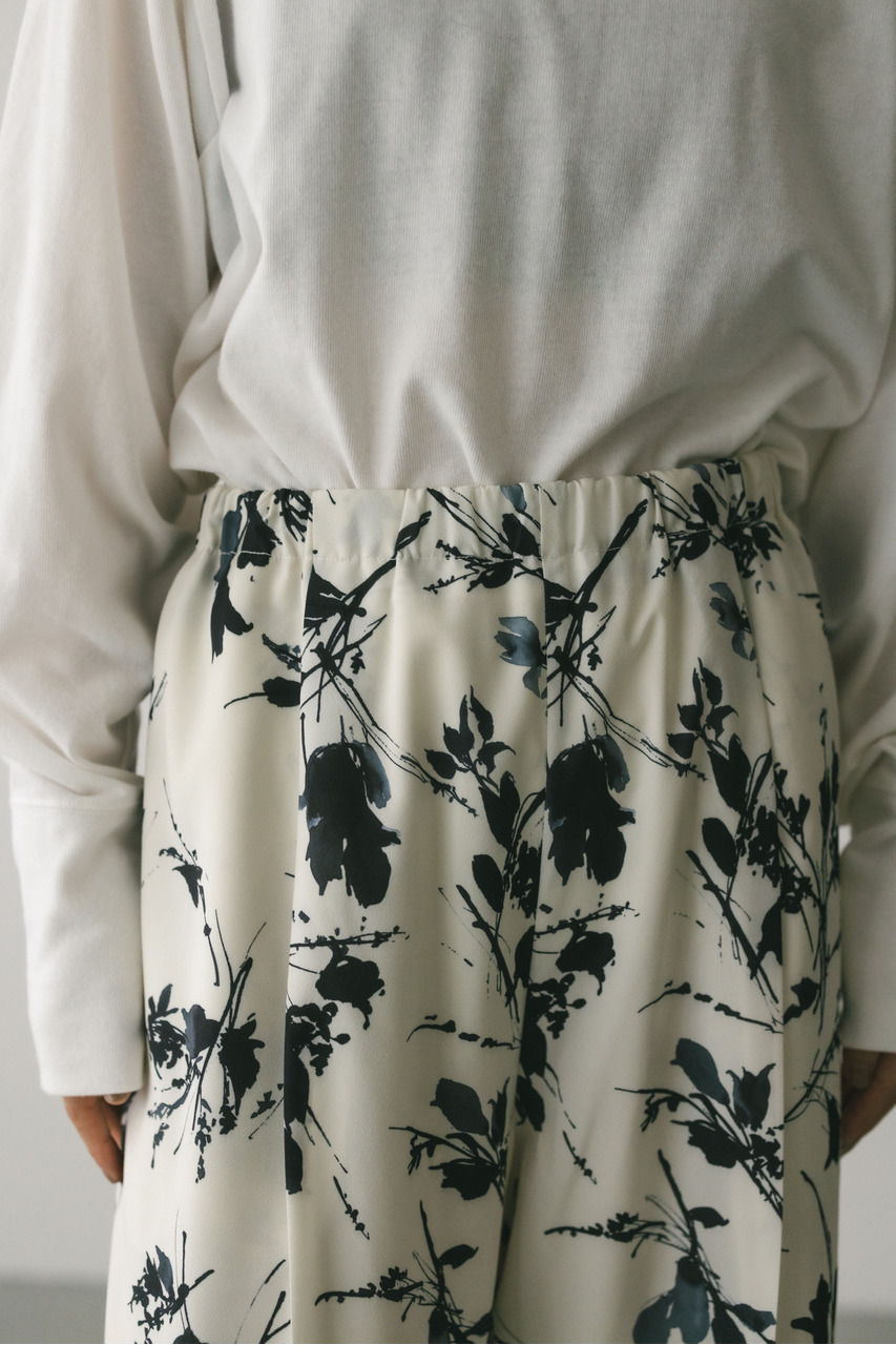 オリジナルのフラワープリントを施したウエストゴムのリラックスパンツ。春を感じさせる柔らかく軽やかな素材で仕上げました。ストレッチなし、透け感なし。