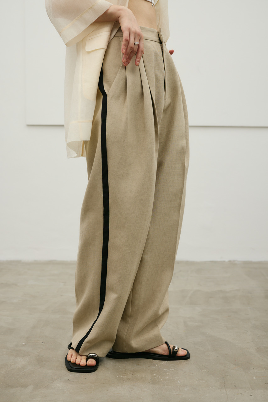 テンセルコットンリネン素材を使用した、表面にほどよい変化感のあるサラッとしたドライな質感が特徴のサイドラインパンツ。リネンの自然な表面感とコットンの柔らかさ、テンセルの滑らかさが組み合わさり、肌触りがよくシワになりにくいのも魅力。軽やかで通気性に優れ、快適な履き心地を実現します。サイドラインデザインがアクセントになったすっきりとしたシルエットで、トップスを選ばずカジュアルからきれいめまで幅広く着こなせる一着です。500JSB30-3641(セットアップバイカラーキャミ)とセットアップ着用可能です。ストレッチなし、透け感なし。