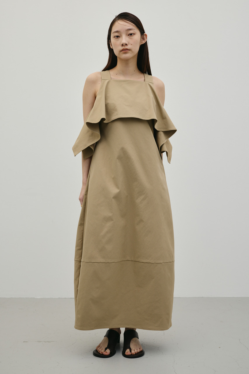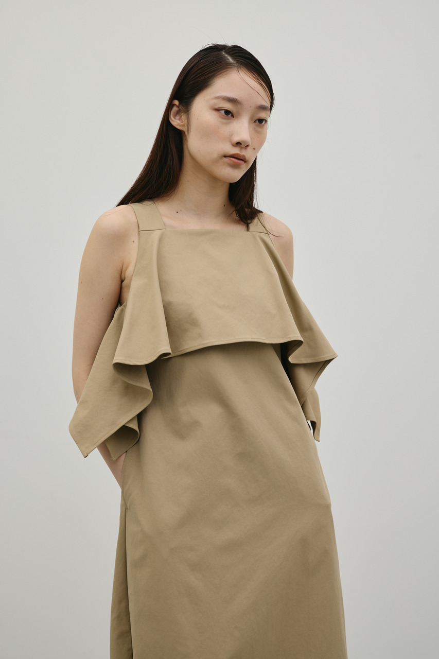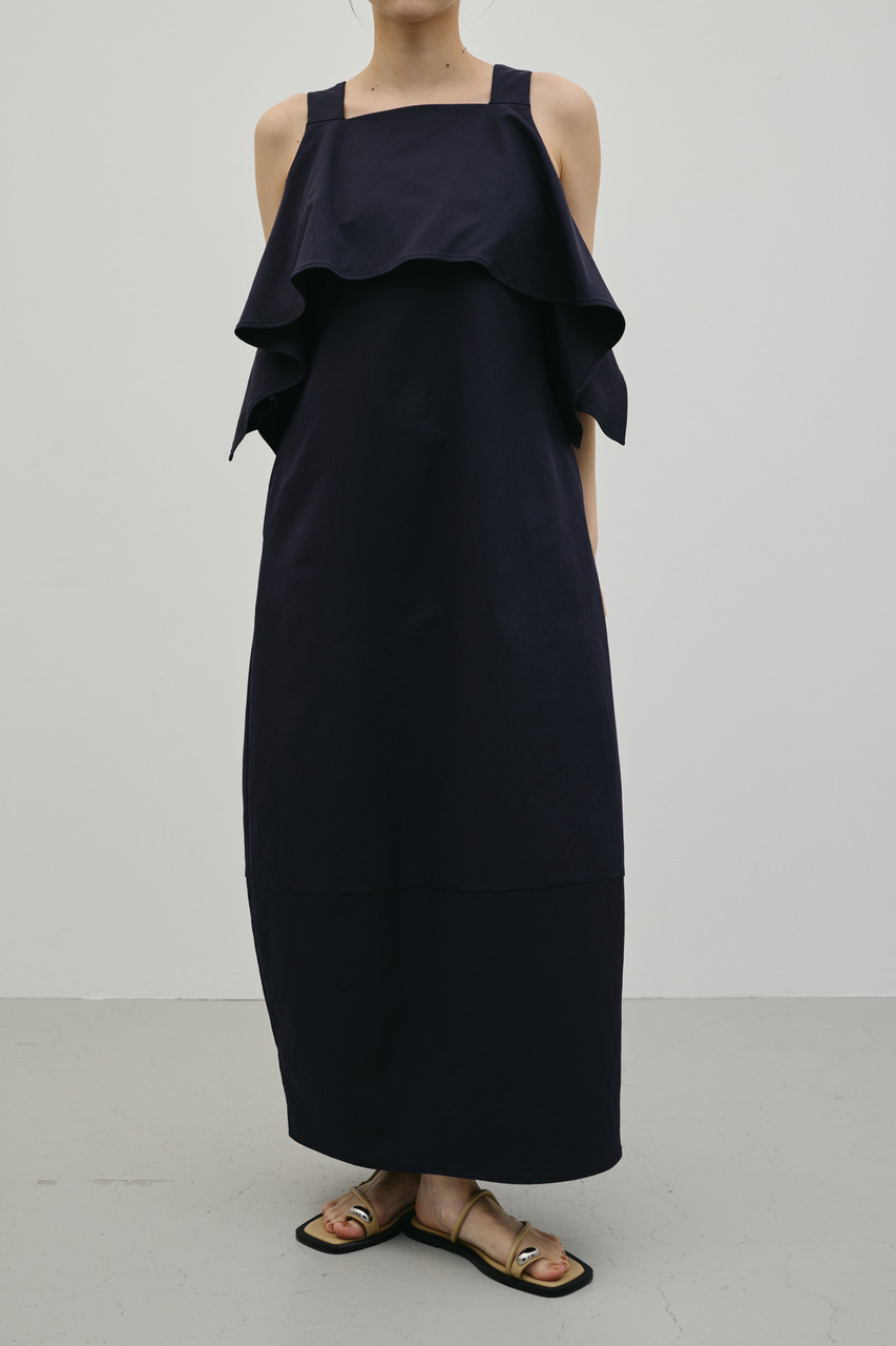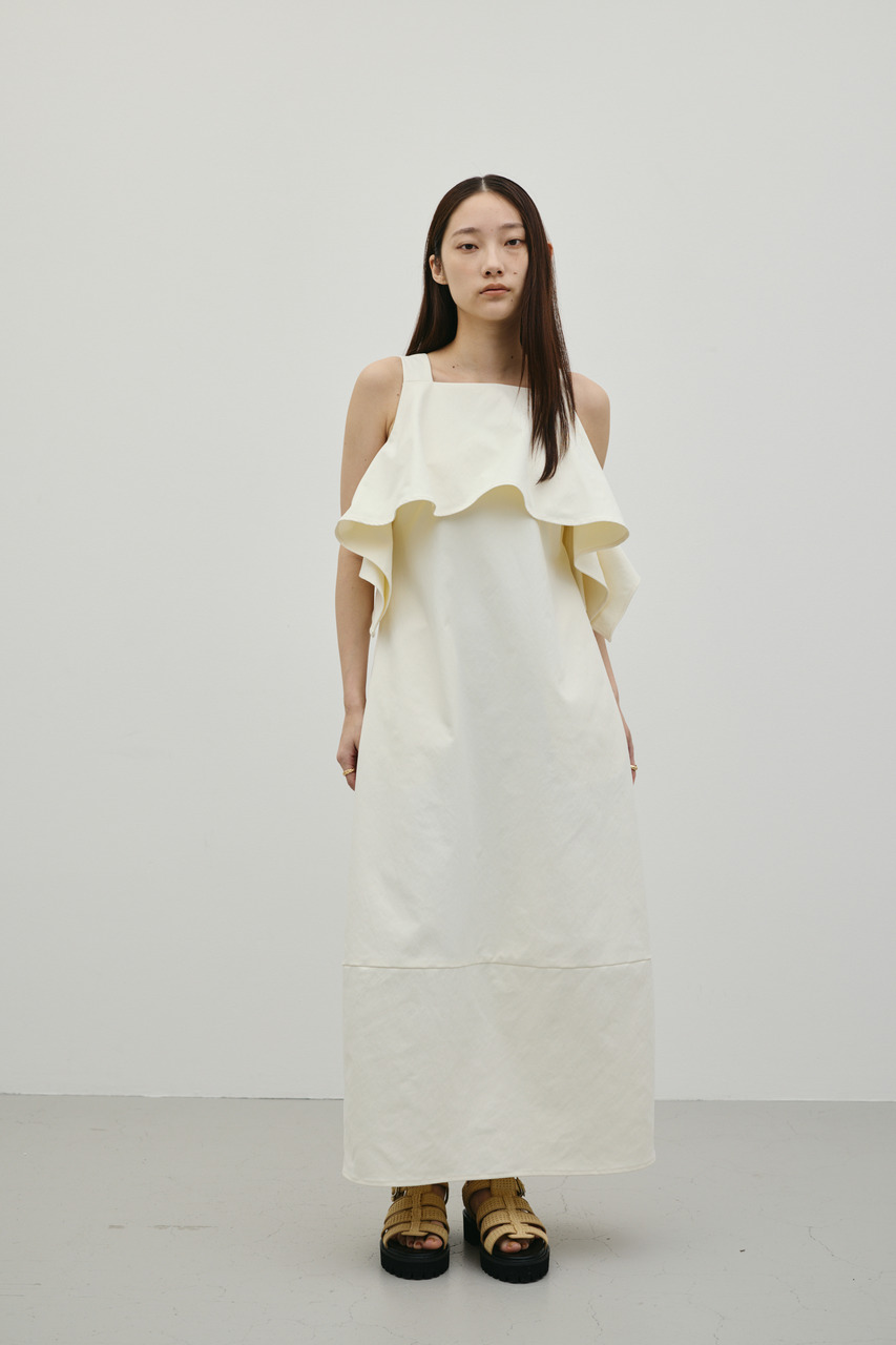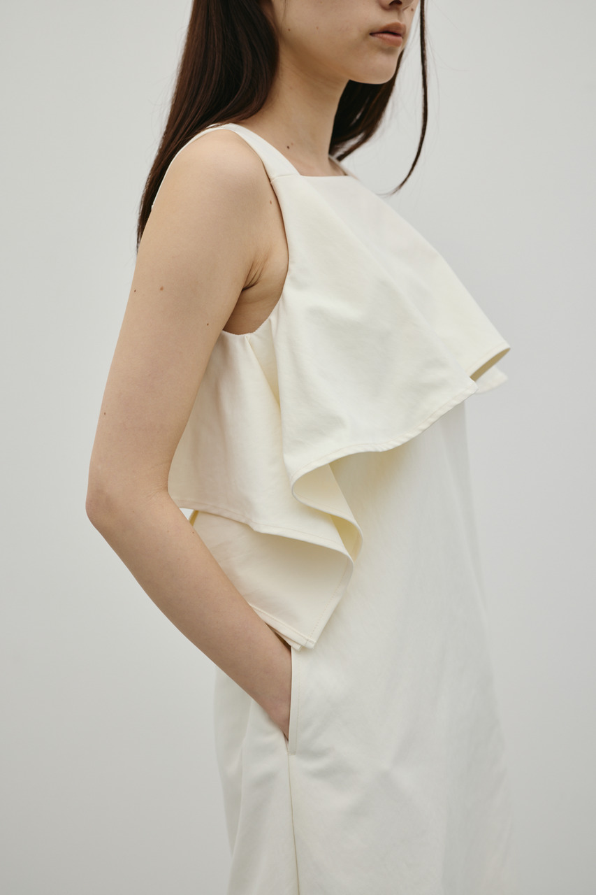 立体感のあるフリルデザインと、丸みのあるコクーンシルエットが魅力のノースリーブワンピース。甘さとモード感をバランスよく取り入れた、シンプルながらも存在感のある一枚。ふんわりとしたコクーンラインが身体のラインをやさしくカバーしつつ、すっきりとしたノースリーブで抜け感をプラス。デイリーからお出かけシーンまで幅広く活躍します。ストレッチあり、透け感なし。