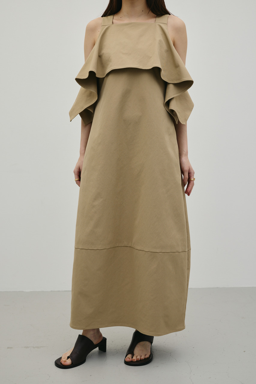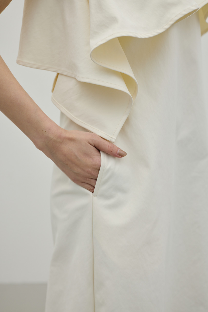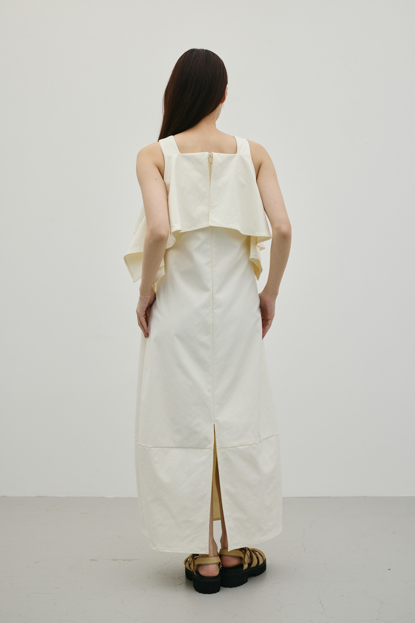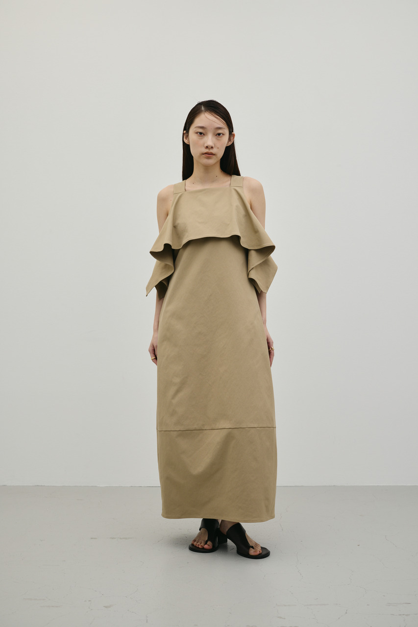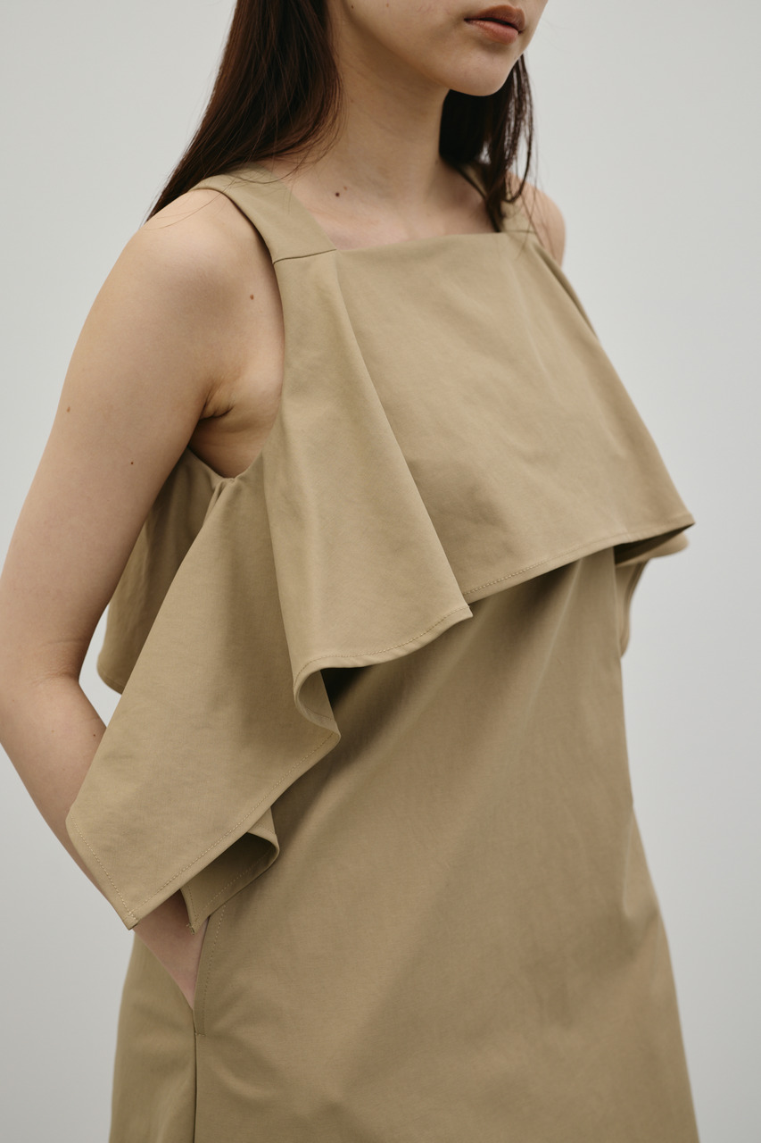 立体感のあるフリルデザインと、丸みのあるコクーンシルエットが魅力のノースリーブワンピース。甘さとモード感をバランスよく取り入れた、シンプルながらも存在感のある一枚。ふんわりとしたコクーンラインが身体のラインをやさしくカバーしつつ、すっきりとしたノースリーブで抜け感をプラス。デイリーからお出かけシーンまで幅広く活躍します。ストレッチあり、透け感なし。