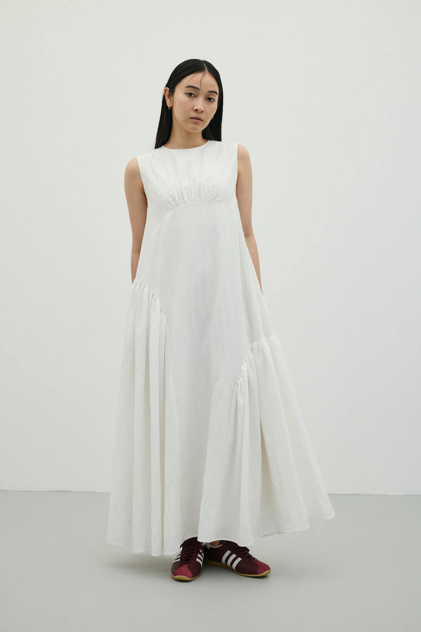 天然由来のセルロースとナイロンを組み合わせた軽量素材を使用したギャザーパネルリラックスワンピース。柔らかくしなやかで肌触りが良く、通気性や吸湿性に優れ、シワになりにくい快適な着心地が魅力。アシンメトリーに入ったギャザーがデザインアクセントとなり、動きやすさと女性らしさを両立した一着です。ストレッチなし、透け感ややあり。