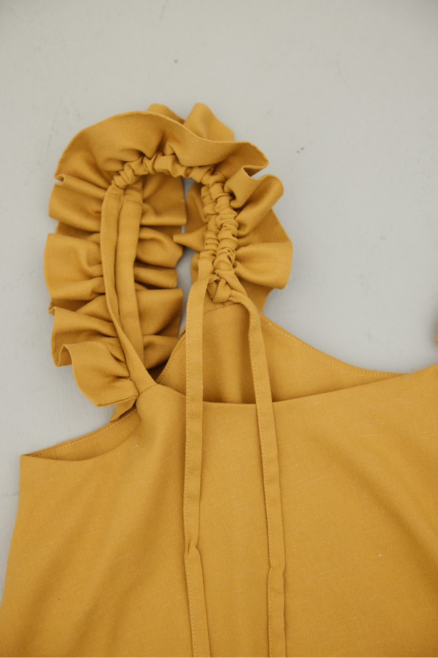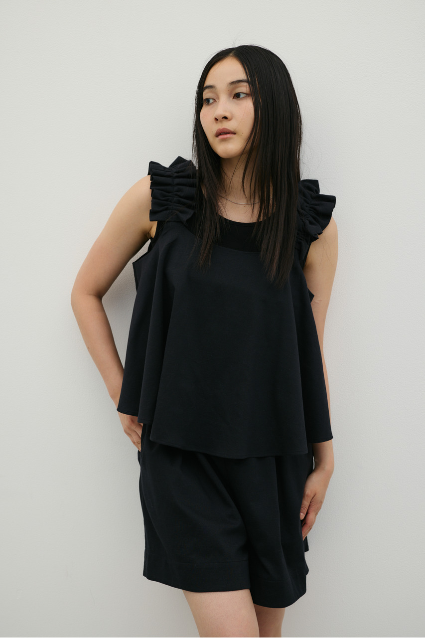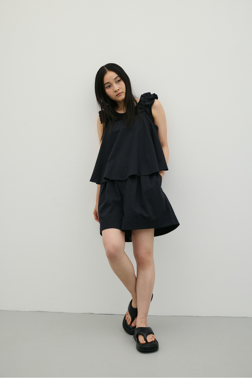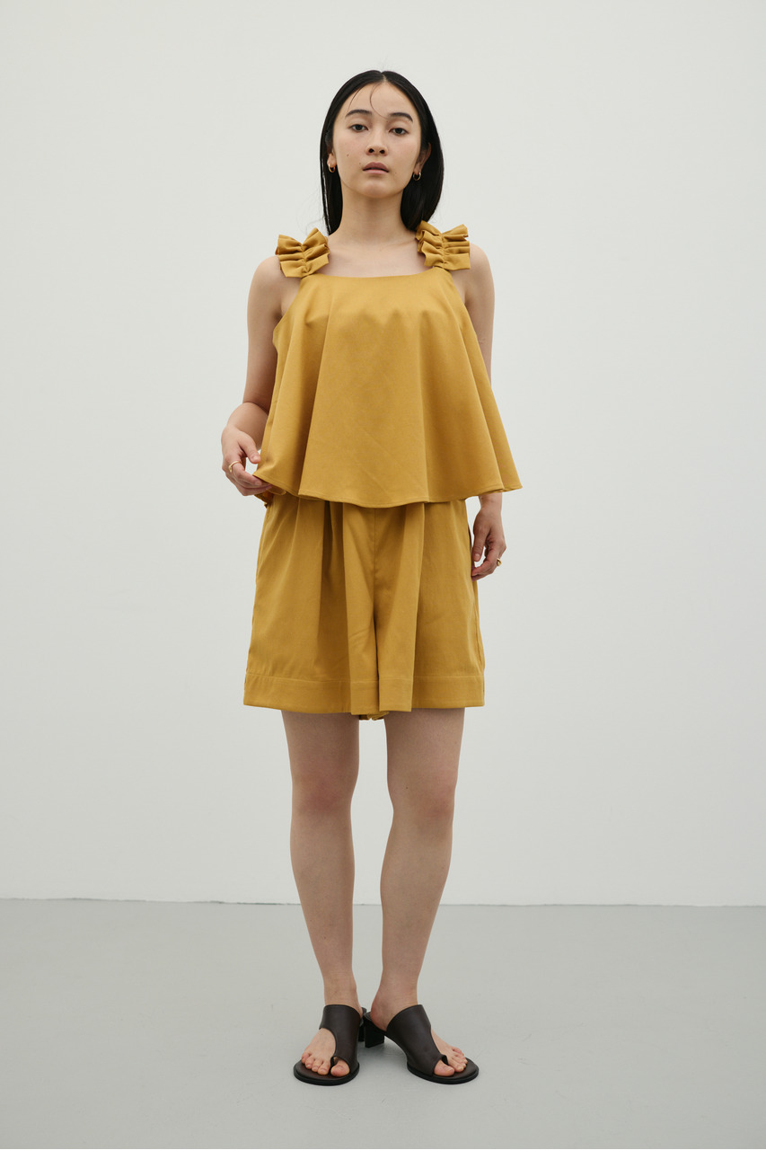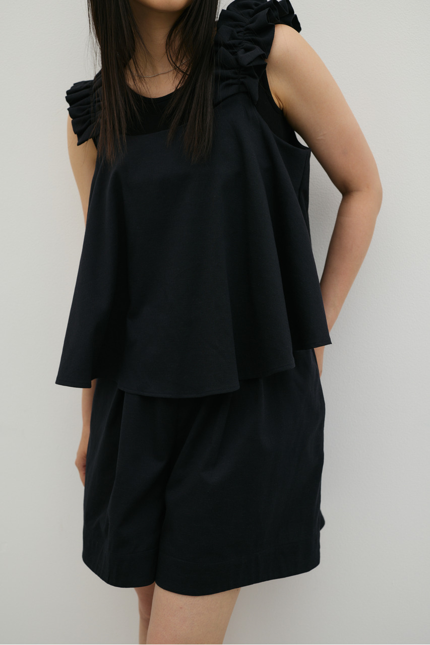 フリルショルダーストラップが目を引く、ショート丈のオールインワン。肩まわりに華やかさをプラスし、シンプルながらも存在感のある一枚に仕上げました。ほどよい落ち感と軽やかさ、さらりとしたドライな風合いが魅力。快適な着心地で、デイリーからお出かけまで幅広く活躍します。フリルストラップは長さ調整が可能。ウエストはゴムと紐でサイズ調整でき、フィット感のある着こなしが叶います。ストレッチなし、透け感なし。