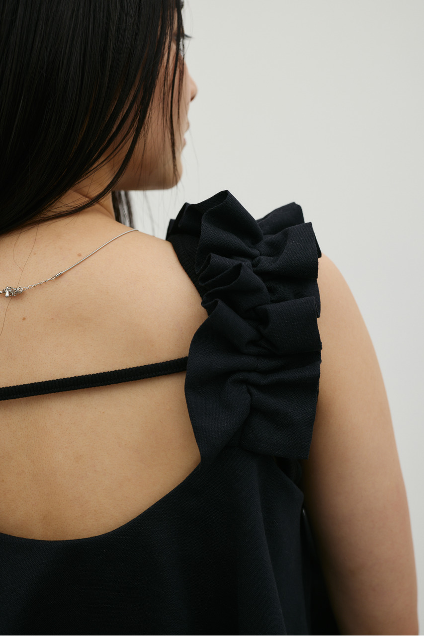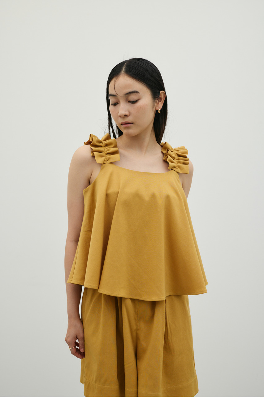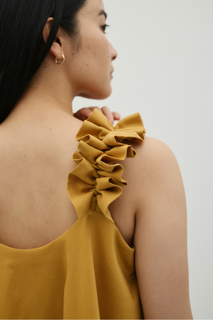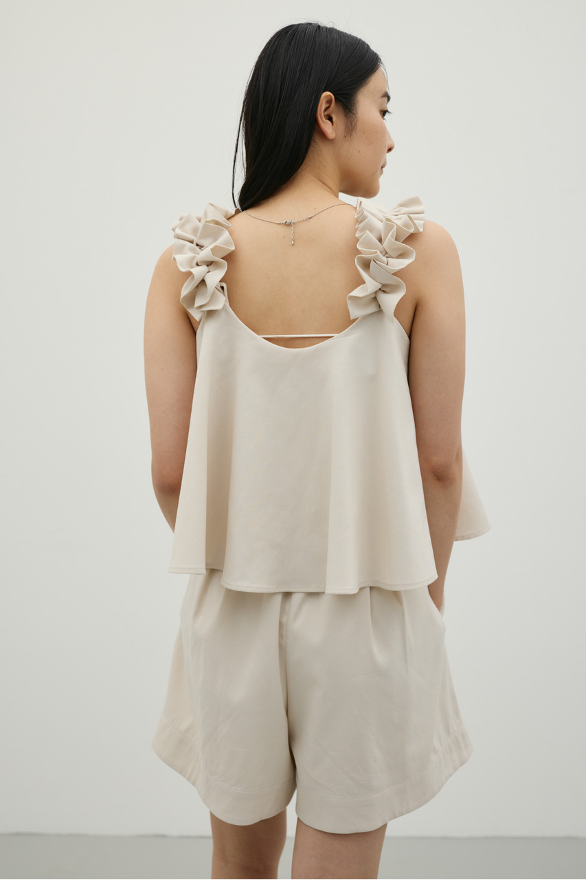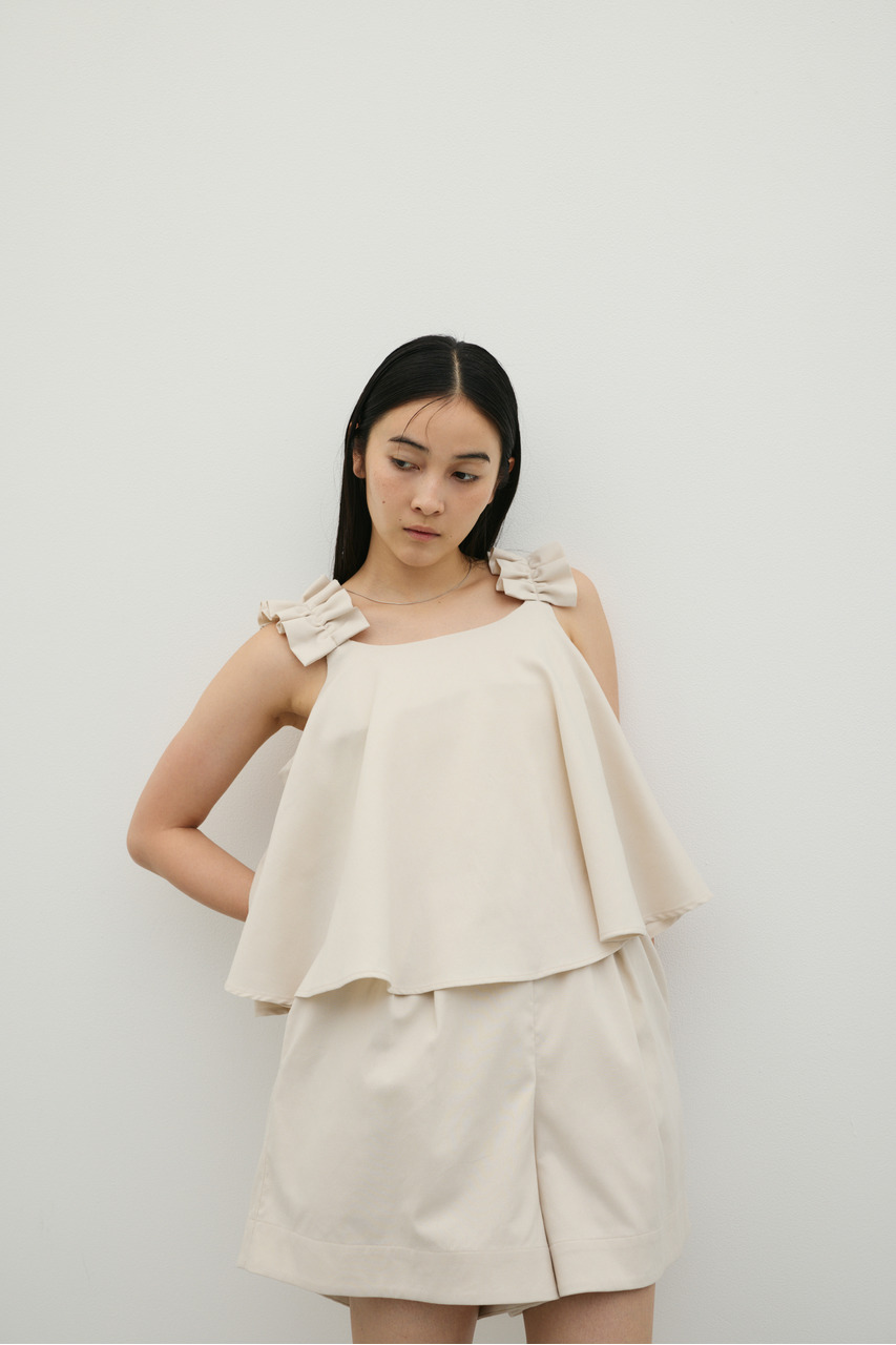 フリルショルダーストラップが目を引く、ショート丈のオールインワン。肩まわりに華やかさをプラスし、シンプルながらも存在感のある一枚に仕上げました。ほどよい落ち感と軽やかさ、さらりとしたドライな風合いが魅力。快適な着心地で、デイリーからお出かけまで幅広く活躍します。フリルストラップは長さ調整が可能。ウエストはゴムと紐でサイズ調整でき、フィット感のある着こなしが叶います。ストレッチなし、透け感なし。
