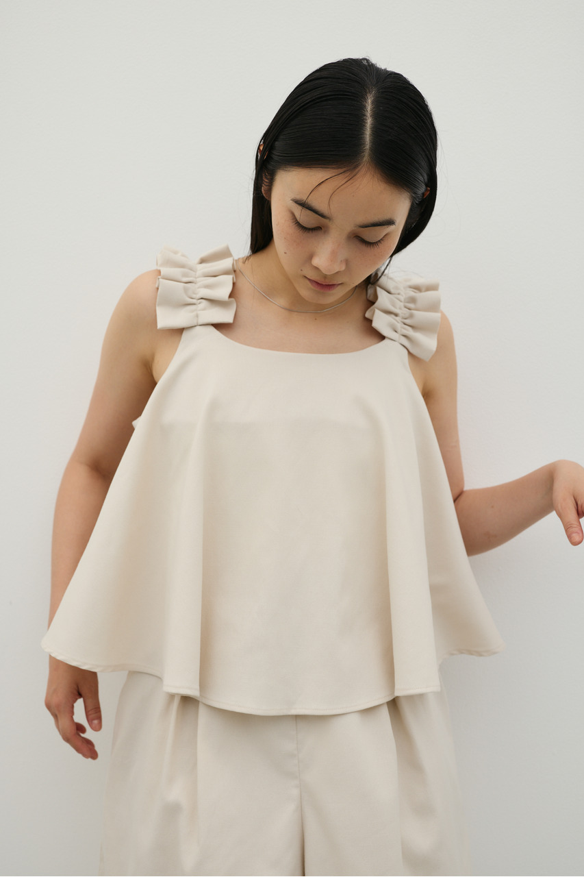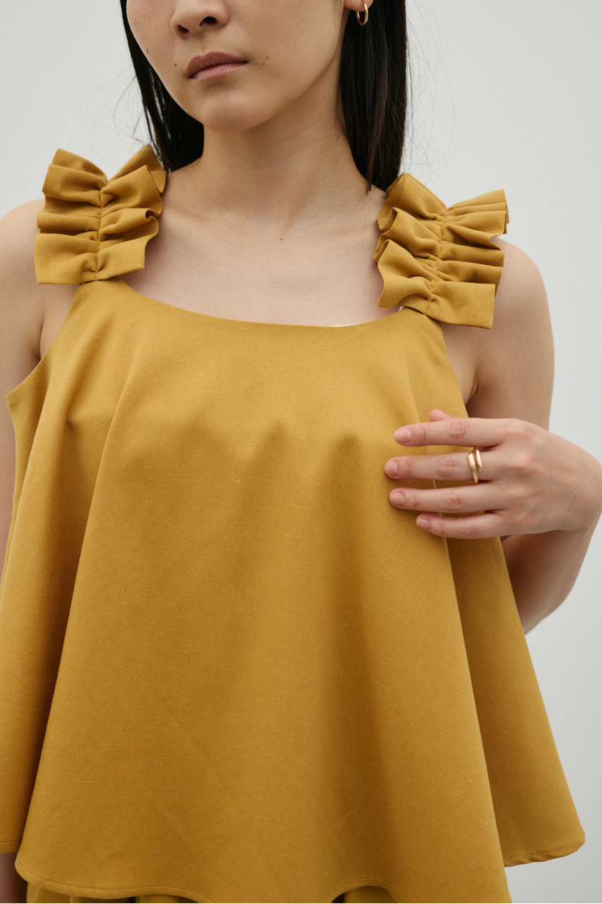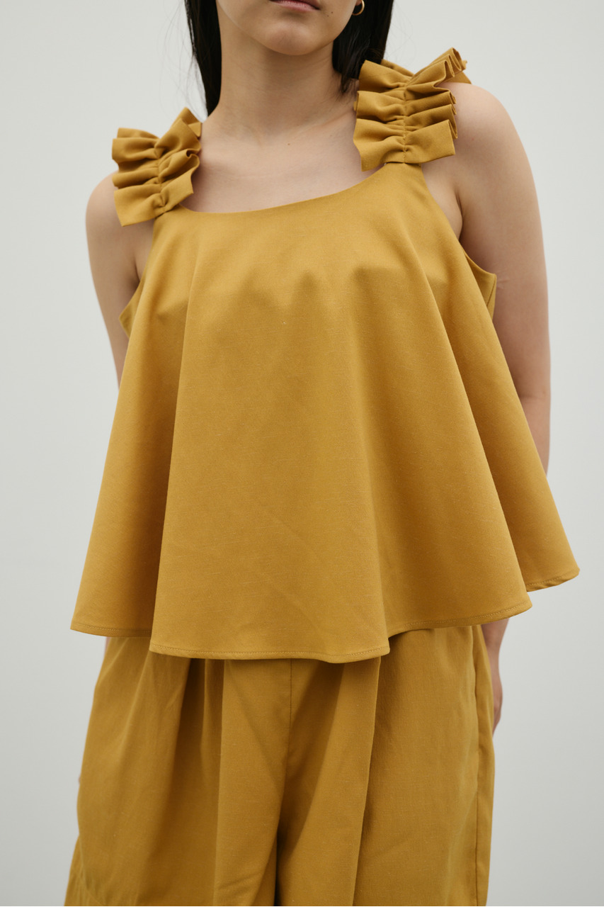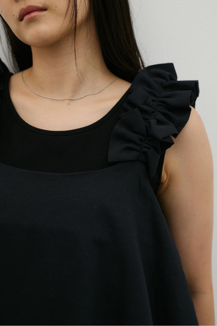 フリルショルダーストラップが目を引く、ショート丈のオールインワン。肩まわりに華やかさをプラスし、シンプルながらも存在感のある一枚に仕上げました。ほどよい落ち感と軽やかさ、さらりとしたドライな風合いが魅力。快適な着心地で、デイリーからお出かけまで幅広く活躍します。フリルストラップは長さ調整が可能。ウエストはゴムと紐でサイズ調整でき、フィット感のある着こなしが叶います。ストレッチなし、透け感なし。