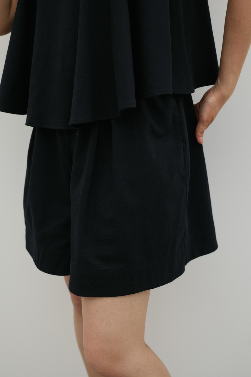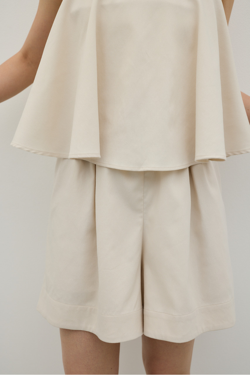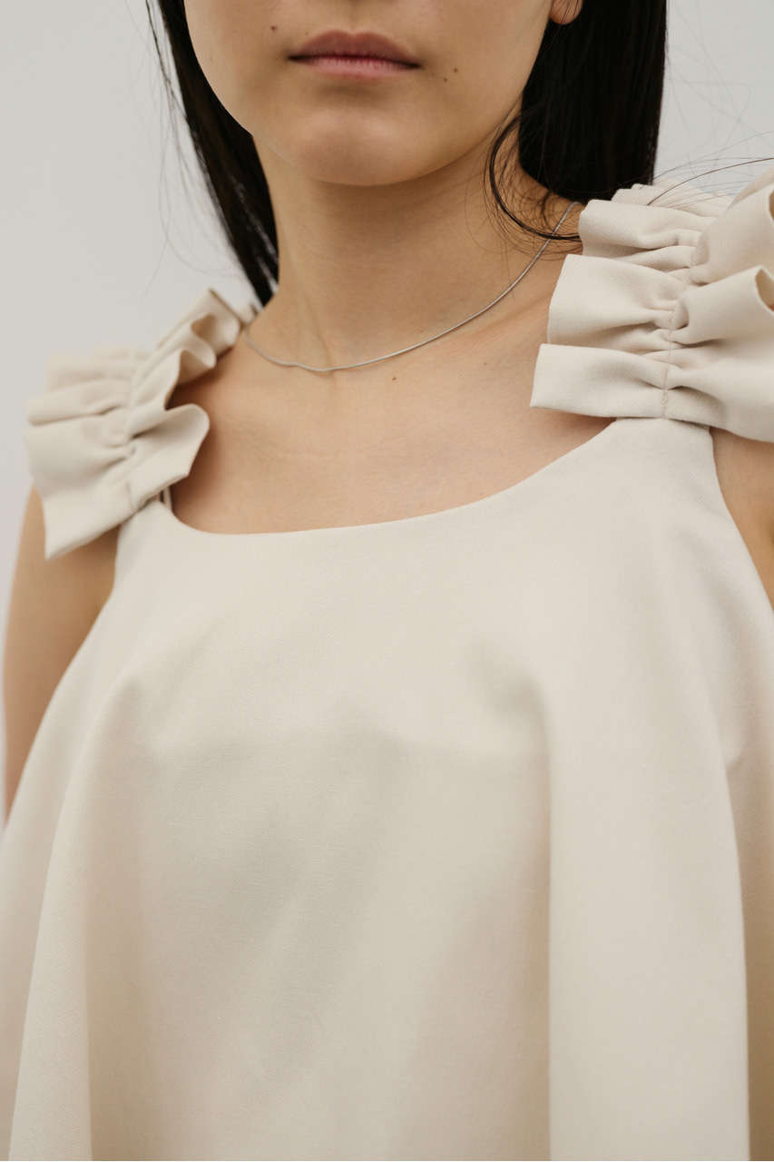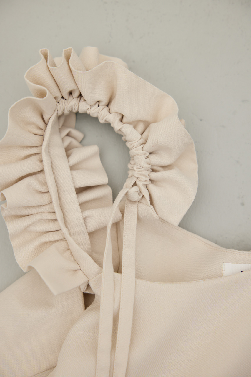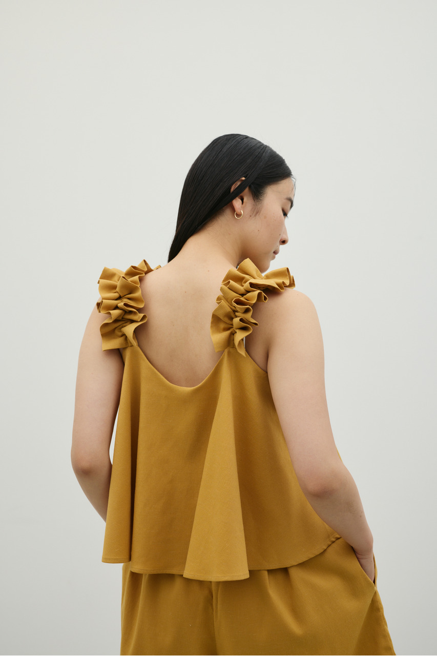 フリルショルダーストラップが目を引く、ショート丈のオールインワン。肩まわりに華やかさをプラスし、シンプルながらも存在感のある一枚に仕上げました。ほどよい落ち感と軽やかさ、さらりとしたドライな風合いが魅力。快適な着心地で、デイリーからお出かけまで幅広く活躍します。フリルストラップは長さ調整が可能。ウエストはゴムと紐でサイズ調整でき、フィット感のある着こなしが叶います。ストレッチなし、透け感なし。
