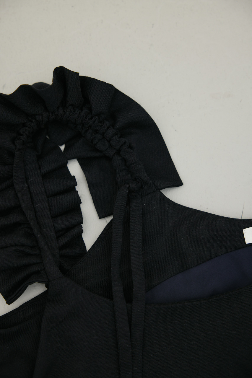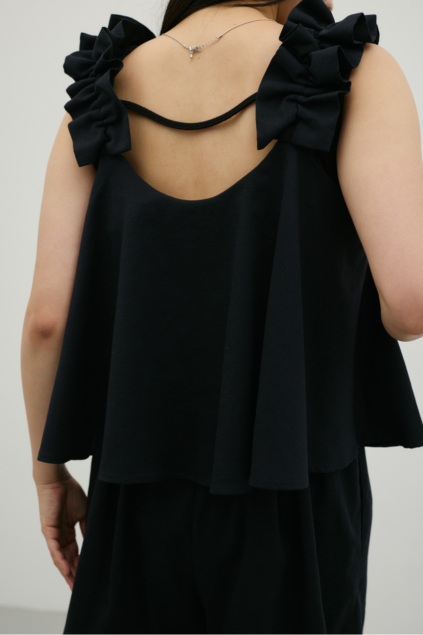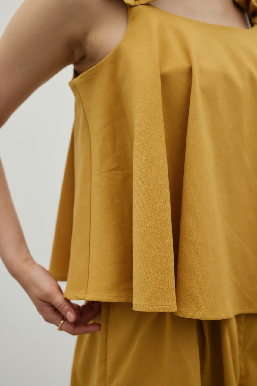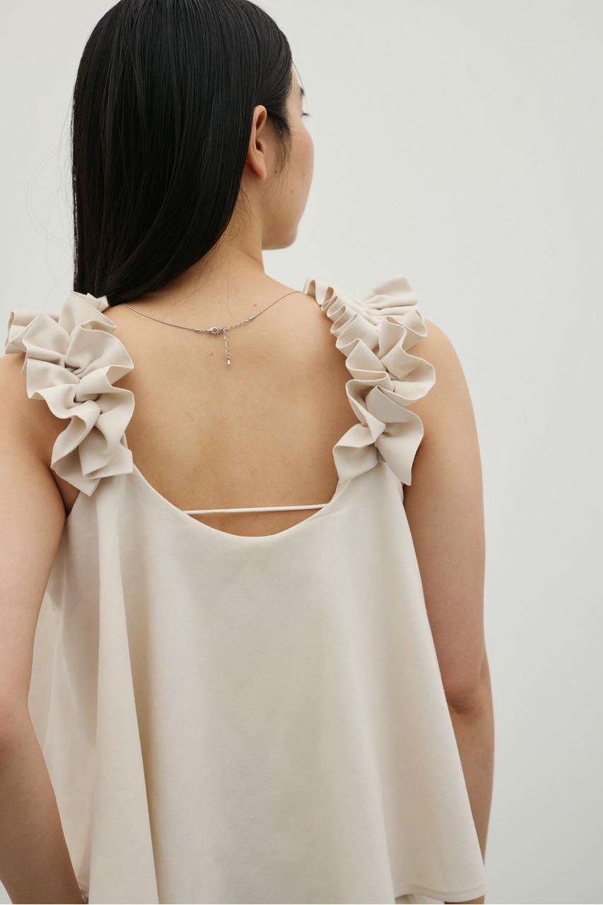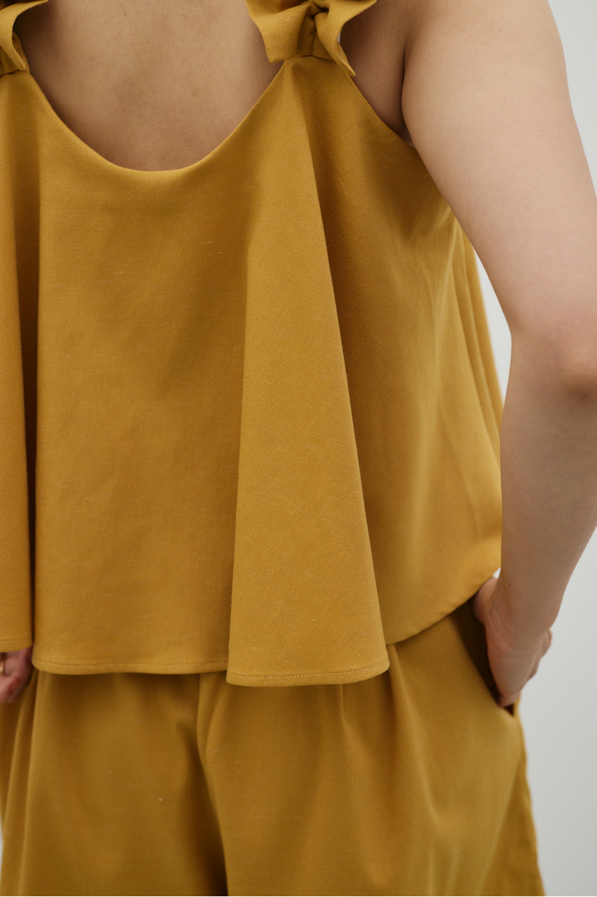フリルショルダーストラップが目を引く、ショート丈のオールインワン。肩まわりに華やかさをプラスし、シンプルながらも存在感のある一枚に仕上げました。ほどよい落ち感と軽やかさ、さらりとしたドライな風合いが魅力。快適な着心地で、デイリーからお出かけまで幅広く活躍します。フリルストラップは長さ調整が可能。ウエストはゴムと紐でサイズ調整でき、フィット感のある着こなしが叶います。ストレッチなし、透け感なし。