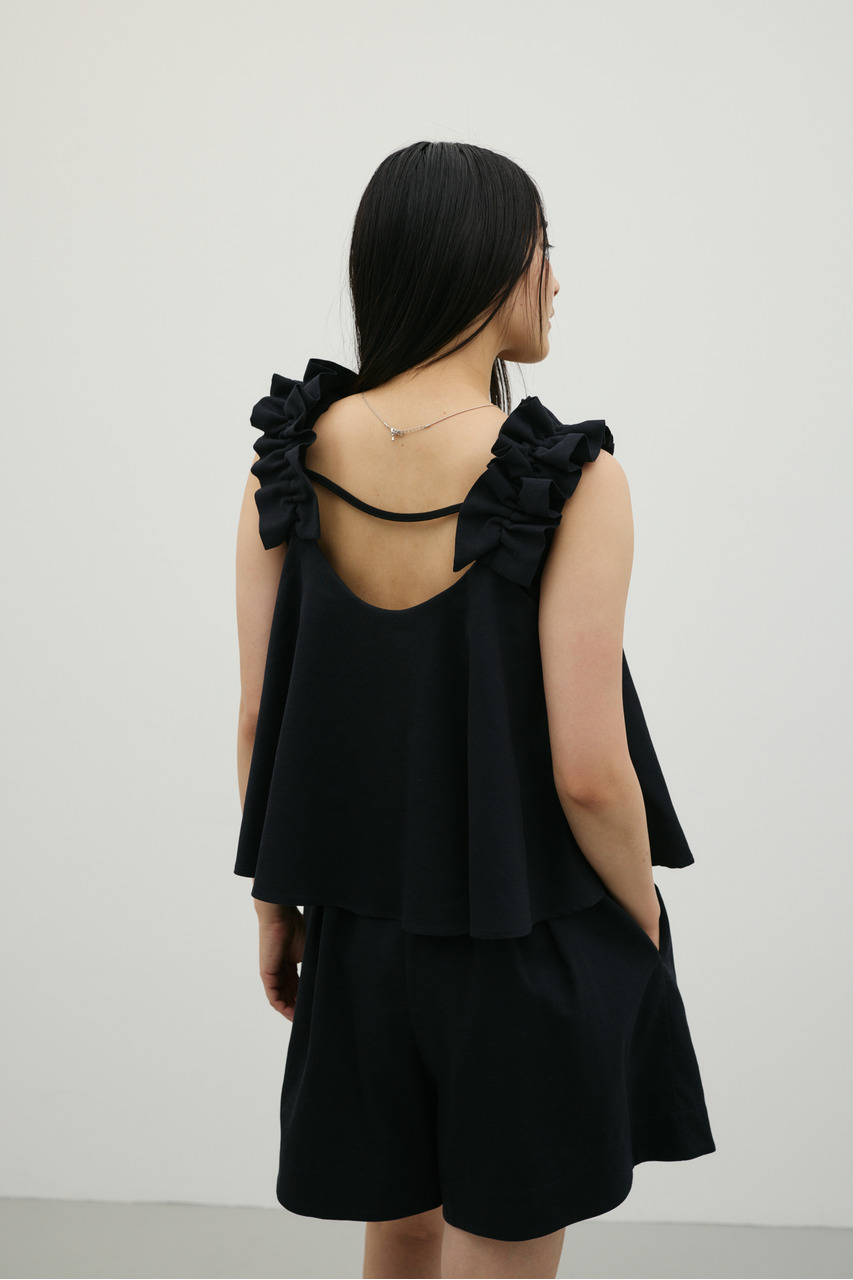 フリルショルダーストラップが目を引く、ショート丈のオールインワン。肩まわりに華やかさをプラスし、シンプルながらも存在感のある一枚に仕上げました。ほどよい落ち感と軽やかさ、さらりとしたドライな風合いが魅力。快適な着心地で、デイリーからお出かけまで幅広く活躍します。フリルストラップは長さ調整が可能。ウエストはゴムと紐でサイズ調整でき、フィット感のある着こなしが叶います。ストレッチなし、透け感なし。