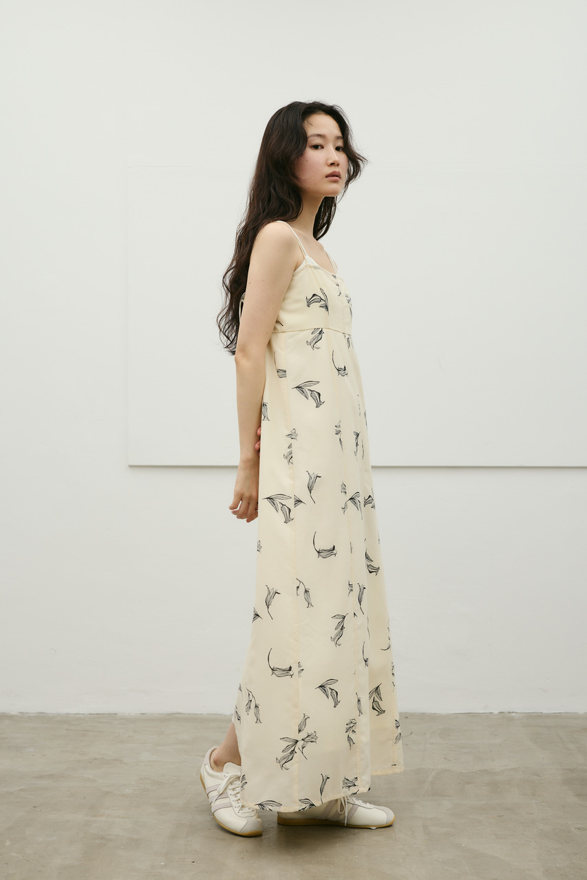 キャミソールをレイヤードしたようなデザインで、1枚でスタイリングが完成する存在感のあるワンピース。BLKとWHTはオリジナルのフラワープリントは線画タッチで、大人っぽく洗練された印象に仕上げています。
