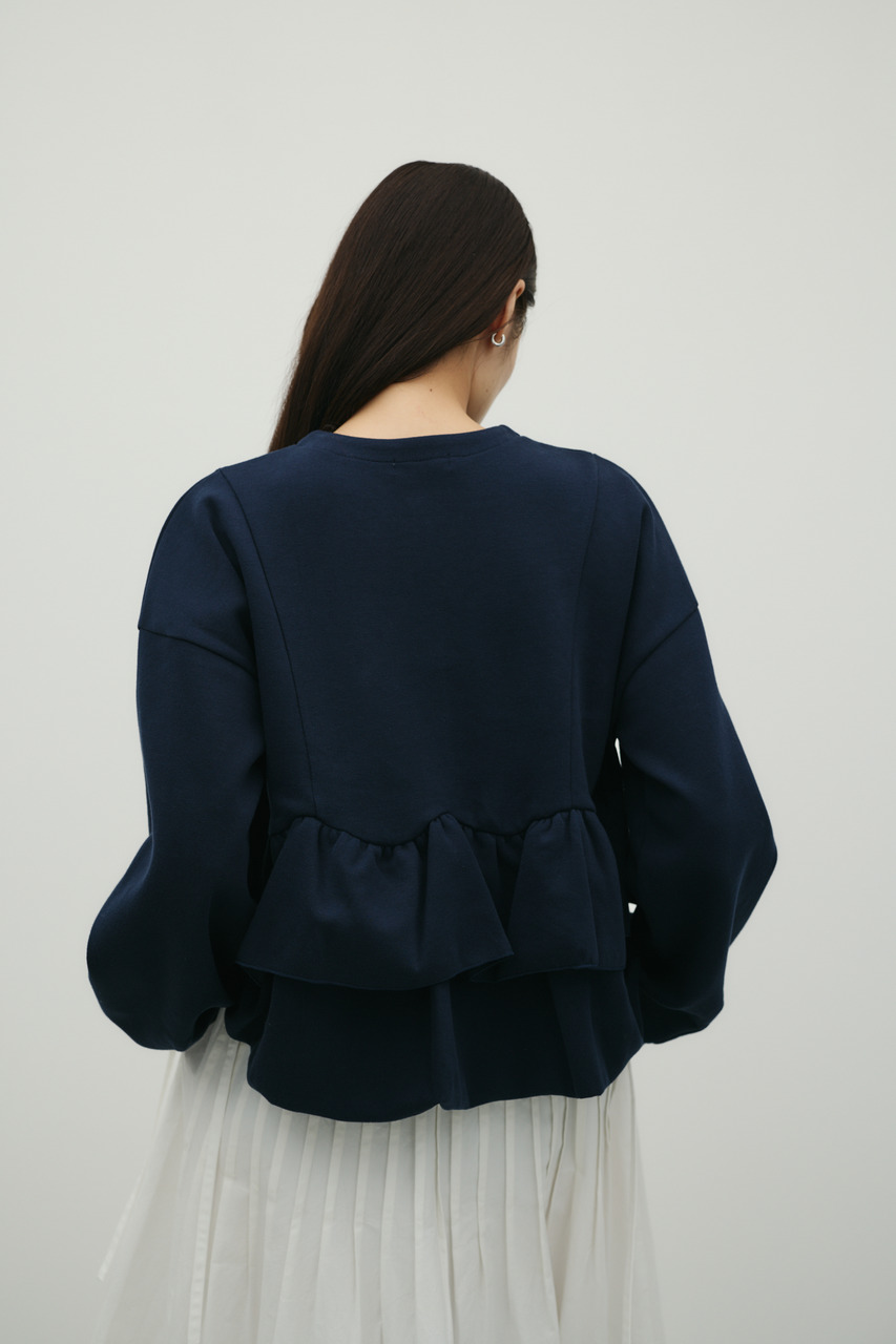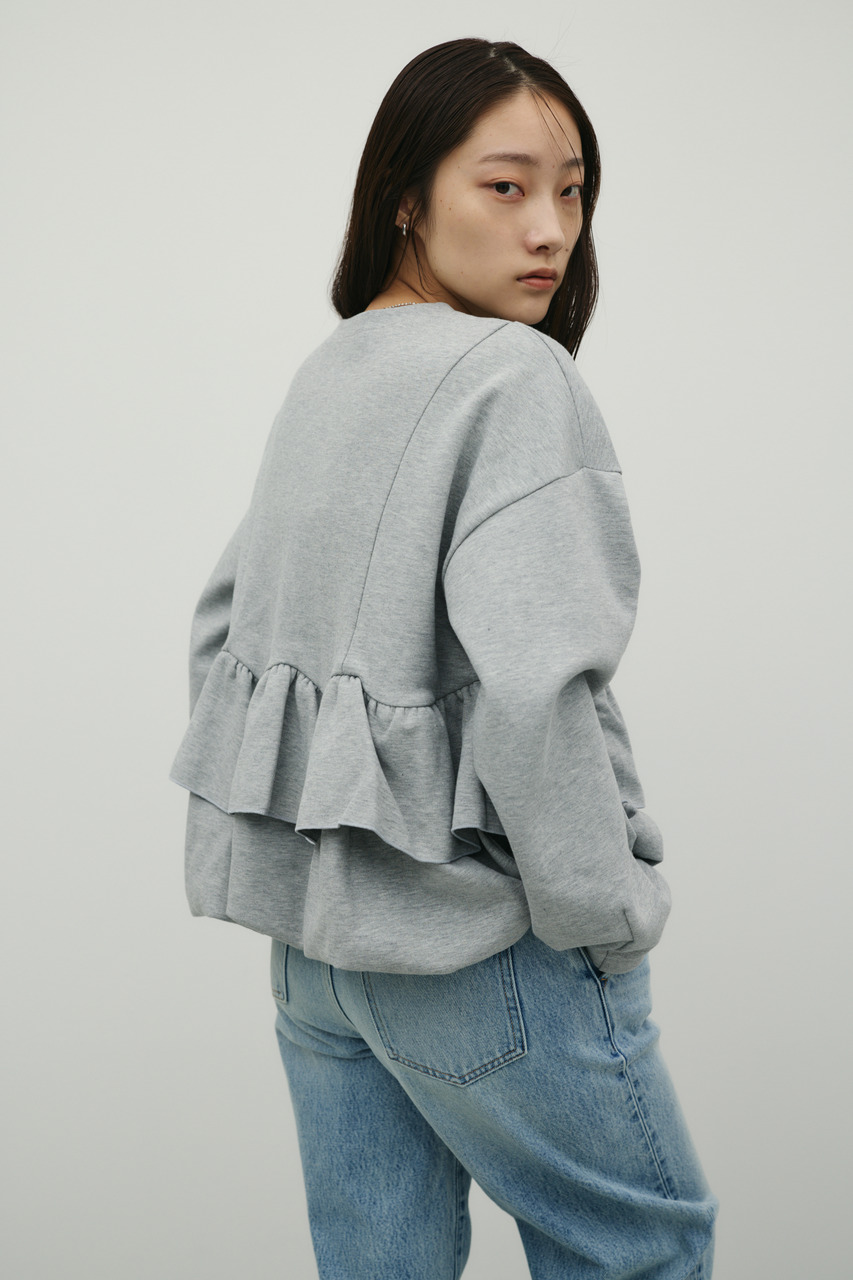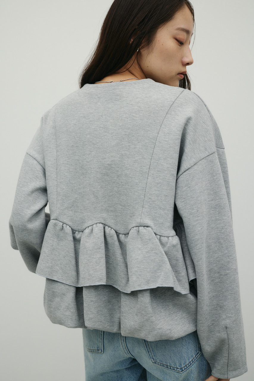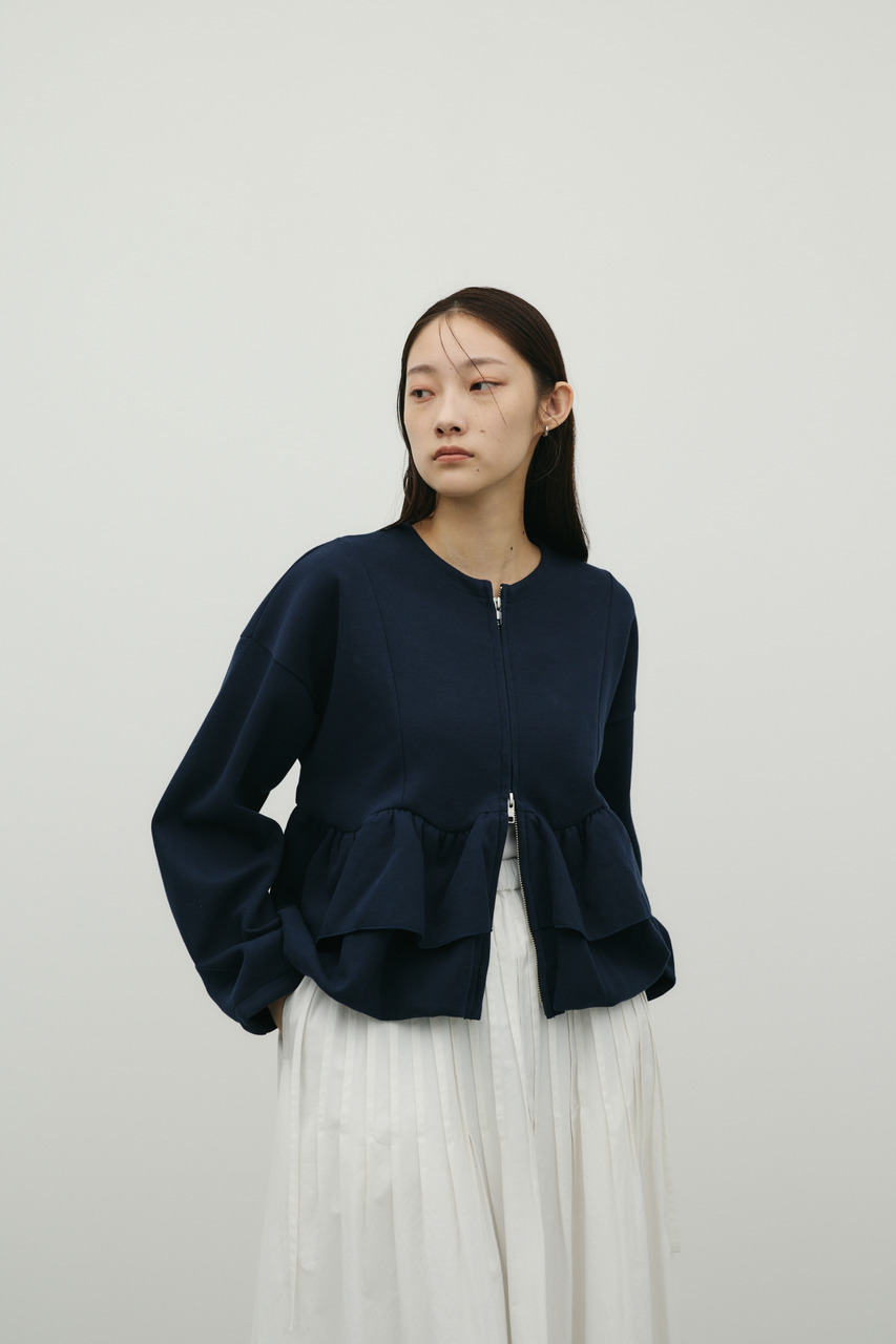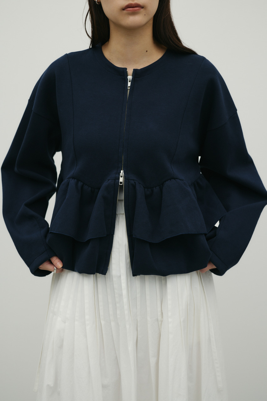 裾にあしらったフリルがさりげない甘さをプラスするフロントジップジャケット。程よいハリと伸縮性のあるポンチ素材を使用し、快適な着心地ときれいなシルエットを両立しました。フロントジップ仕様で着脱しやすく、カジュアルからきれいめまで幅広いスタイリングに合わせていただけます。パンツにもスカートにも合わせやすく、デイリーからお出かけまで活躍する一枚です。逆開ファスナー仕様。透け感なし、ストレッチあり。