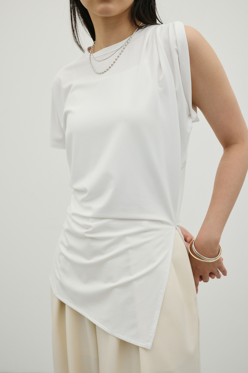 左右非対称のディテールが、シンプルながらもモードな印象を演出する、アシンメトリーデザインが目をひくルーズTシャツ。片側は半袖、もう片側は袖をまくったようなノースリーブ風のデザインで、抜け感のあるバランスに仕上げました。さらに片側の裾には長めのスリットを入れ、動くたびに表情が生まれる一枚です。なめらかな落ち感と柔らかな肌触り、ほどよいストレッチ性で快適な着心地を実現しています。一枚でスタイリングにニュアンスを加える、存在感のあるトップスです。透け感なし、ストレッチあり。