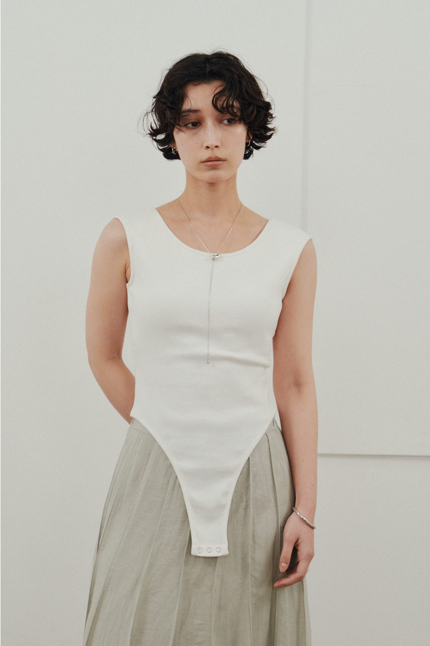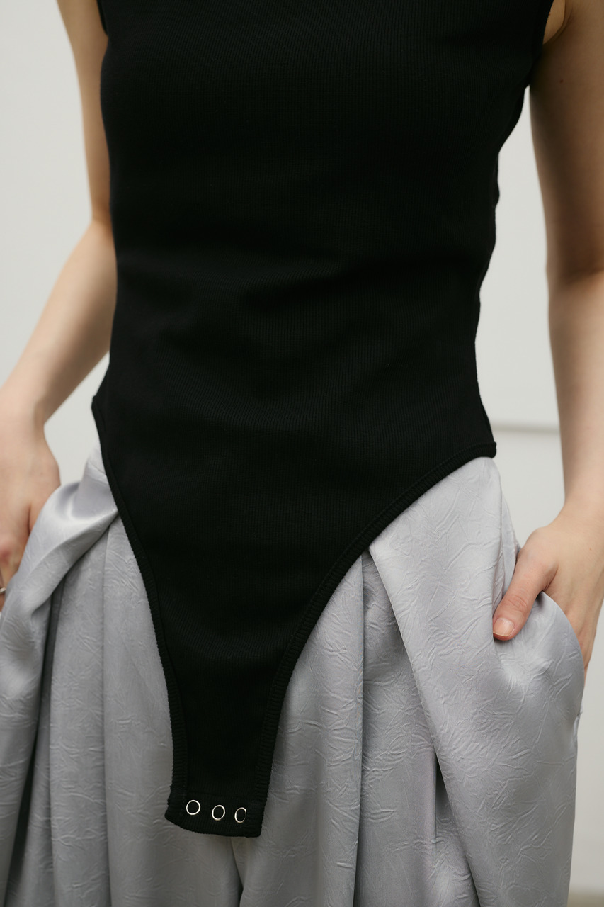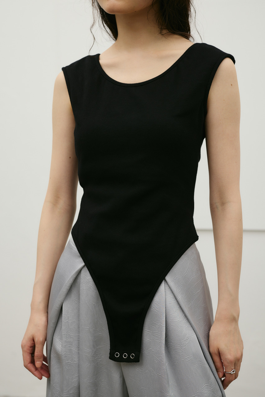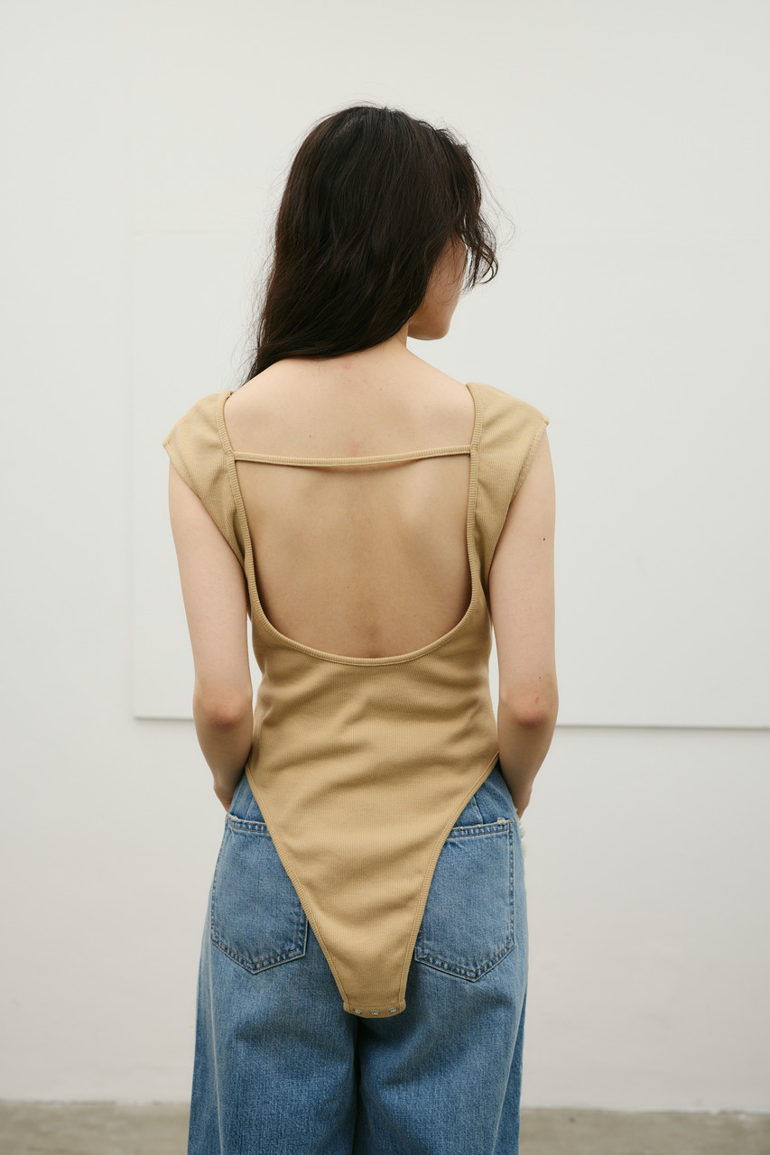 バックオープンデザインのボディスーツ。パッド付きで美しいシルエットをキープしつつ、背中あきのデザインが女性らしいアクセントに。インナーとしても一枚でも、スタイリッシュに着こなせるアイテムです。ストレッチあり、透け感無し