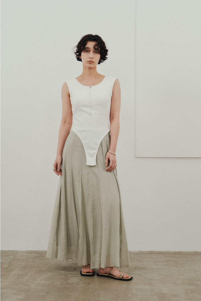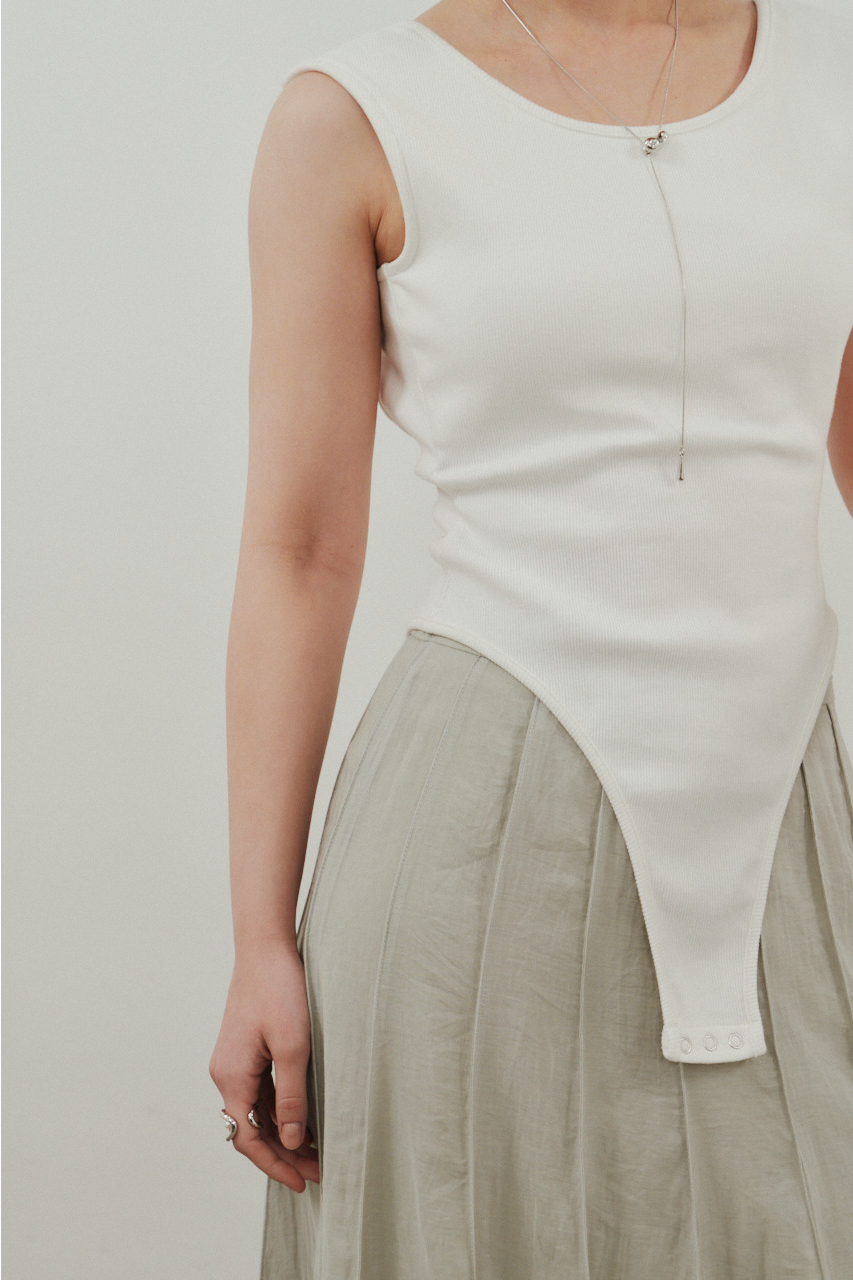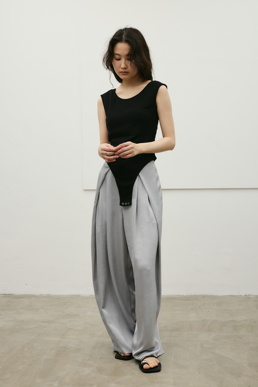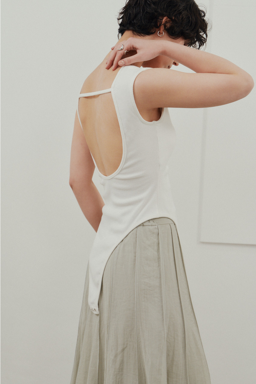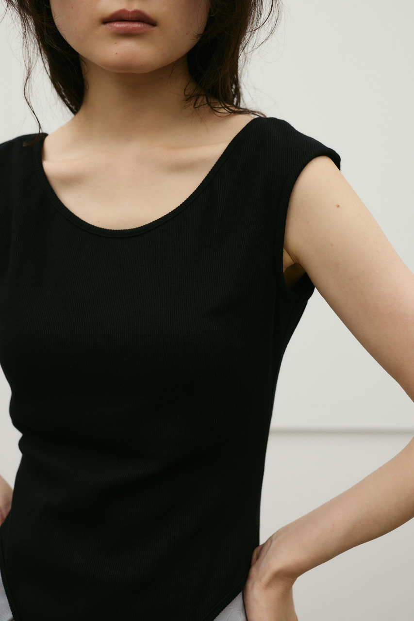バックオープンデザインのボディスーツ。パッド付きで美しいシルエットをキープしつつ、背中あきのデザインが女性らしいアクセントに。インナーとしても一枚でも、スタイリッシュに着こなせるアイテムです。ストレッチあり、透け感無し