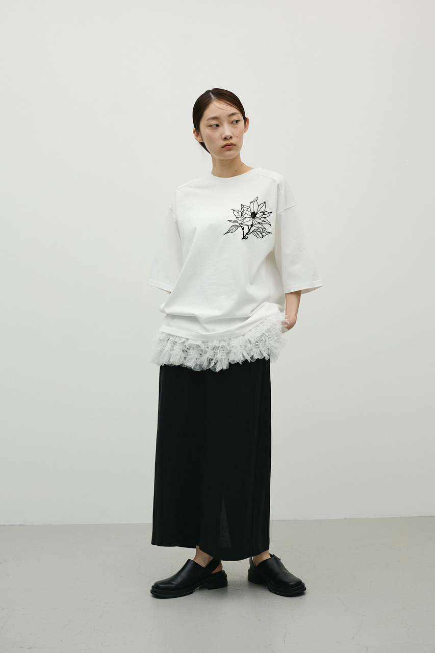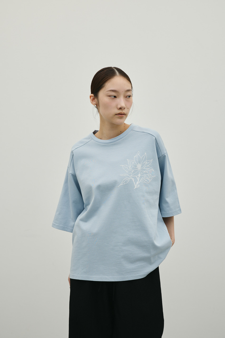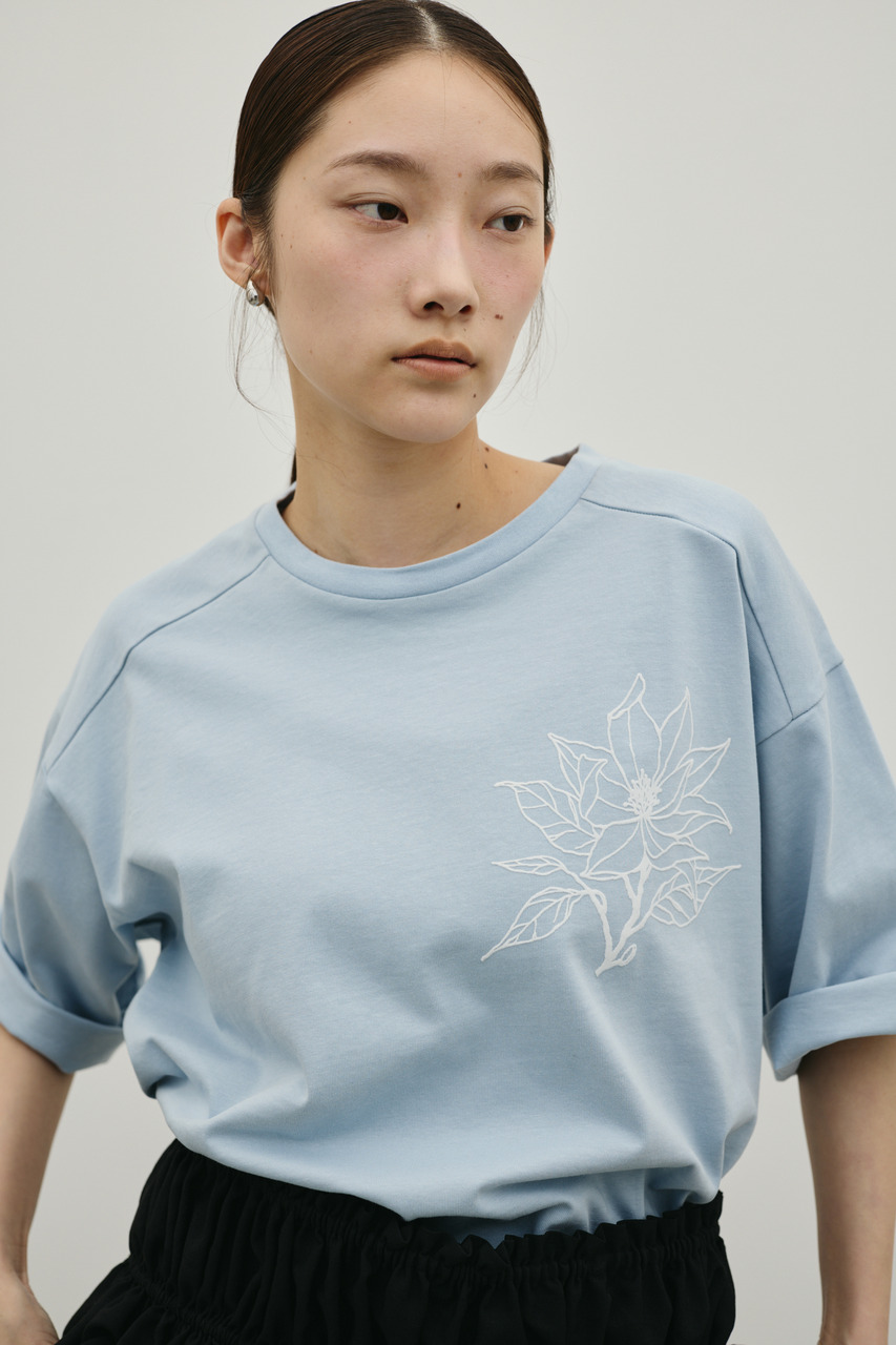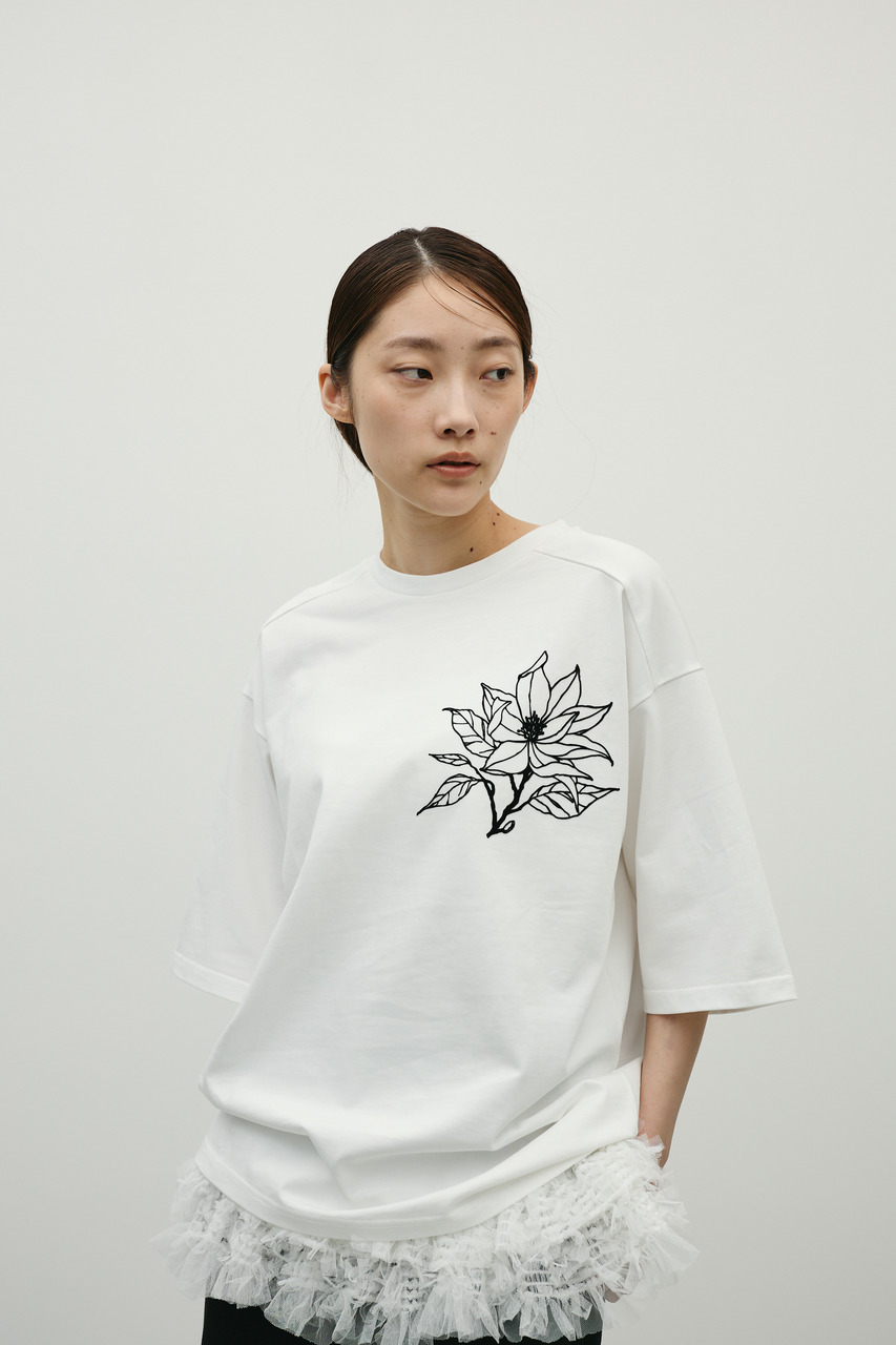 立体感のあるフロッキープリントで仕上げた、存在感たっぷりのフラワーTシャツ。ほんのり起毛した花柄デザインがシンプルながらも上品で華やかな印象を演出します。程よいオーバーサイズのシルエットで着回しやすく、使いやすいサイズ感がポイント。ビスチェやコルセットとのレイヤードでメリハリのある着回しがおすすめです。しっかりと厚みもあり、透け感を気にせず着用いただけます。ストレッチややあり、透け感無し。