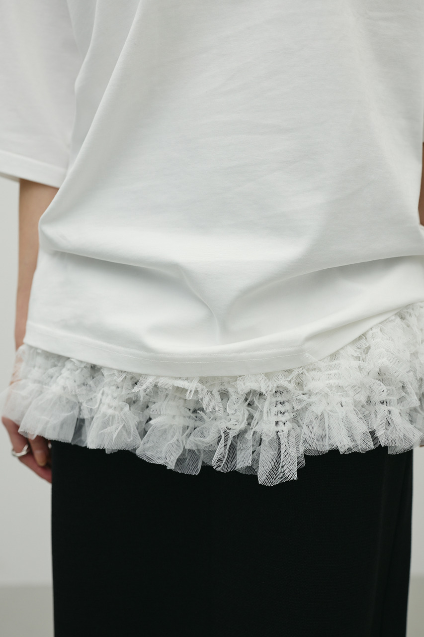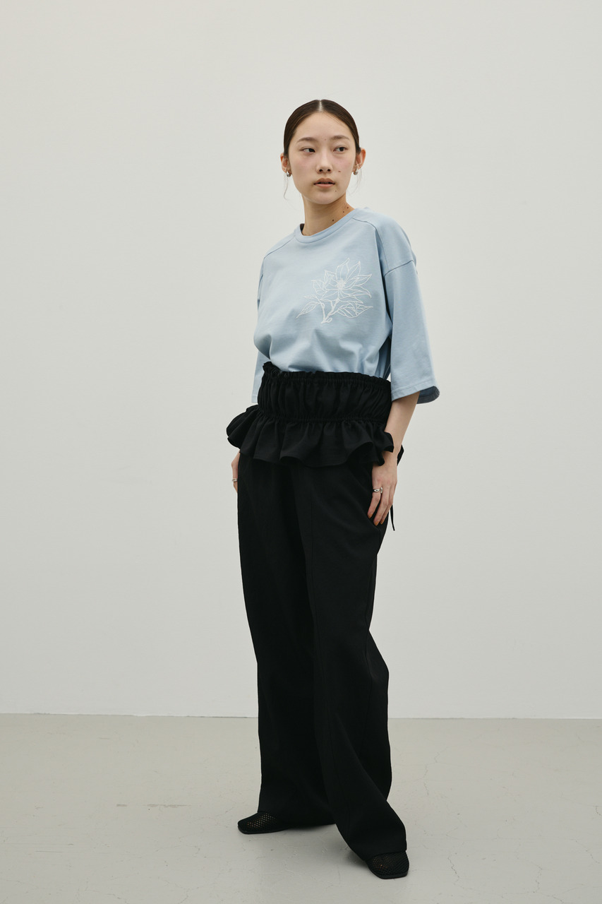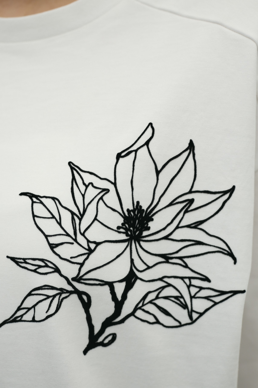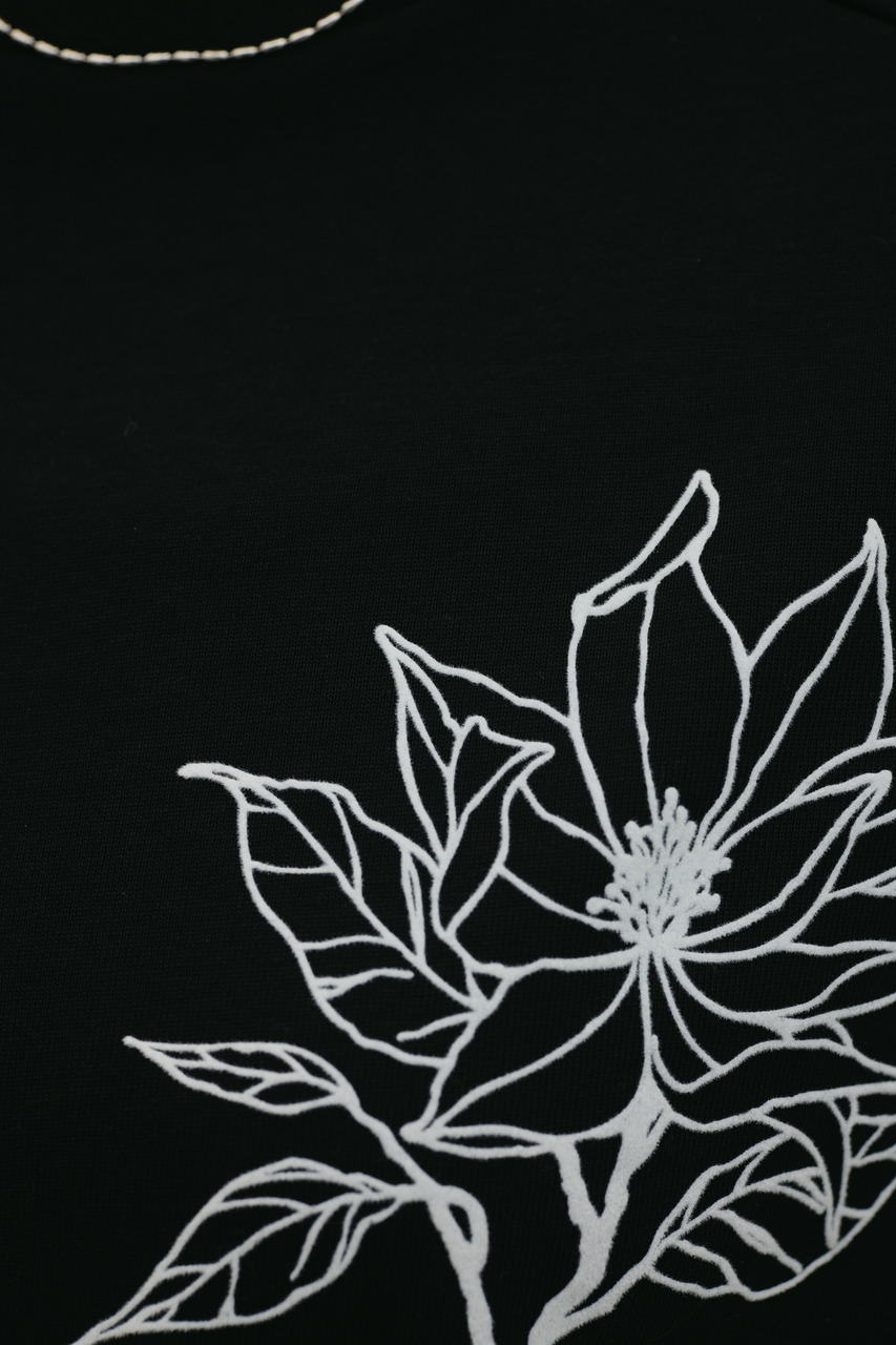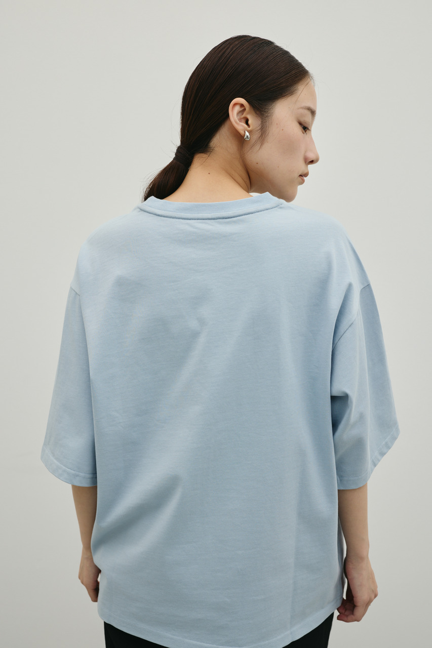 立体感のあるフロッキープリントで仕上げた、存在感たっぷりのフラワーTシャツ。ほんのり起毛した花柄デザインがシンプルながらも上品で華やかな印象を演出します。程よいオーバーサイズのシルエットで着回しやすく、使いやすいサイズ感がポイント。ビスチェやコルセットとのレイヤードでメリハリのある着回しがおすすめです。しっかりと厚みもあり、透け感を気にせず着用いただけます。ストレッチややあり、透け感無し。