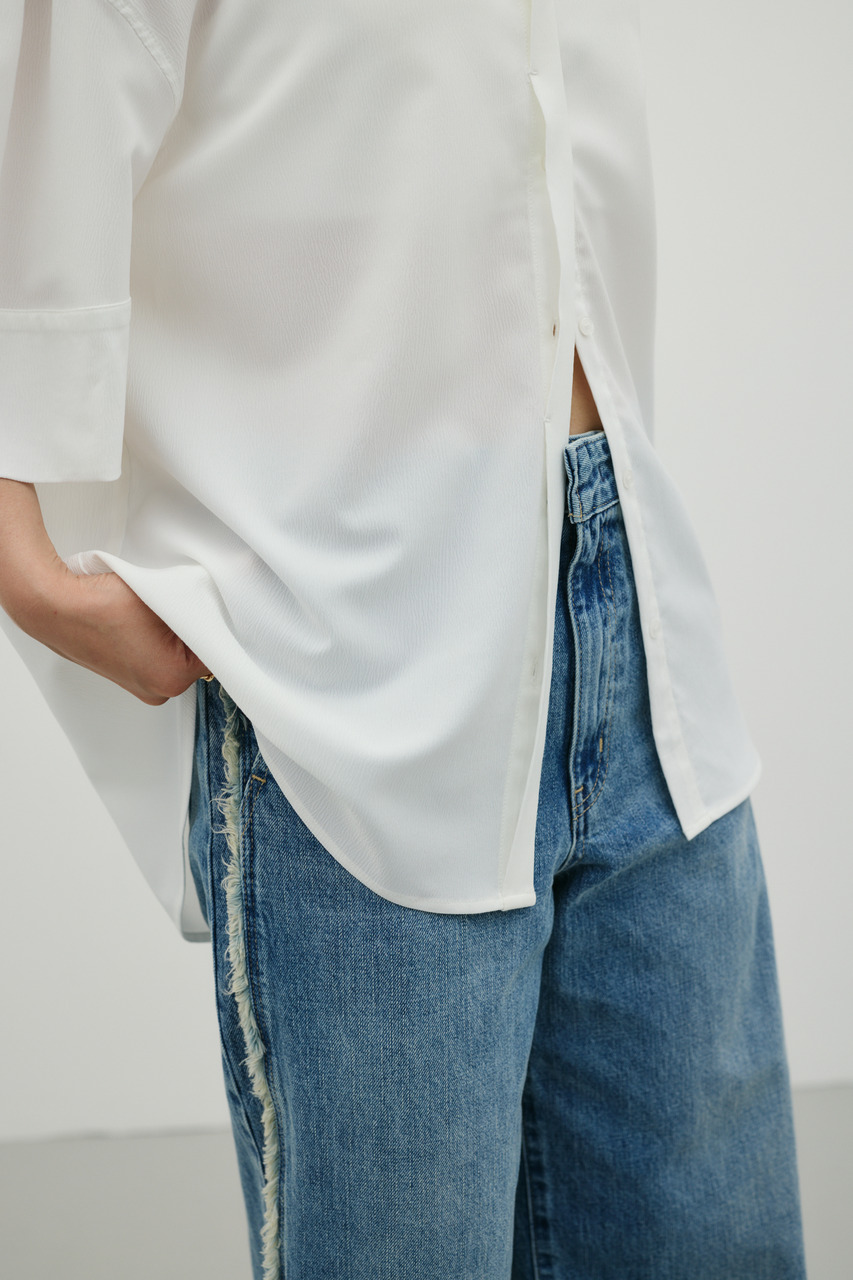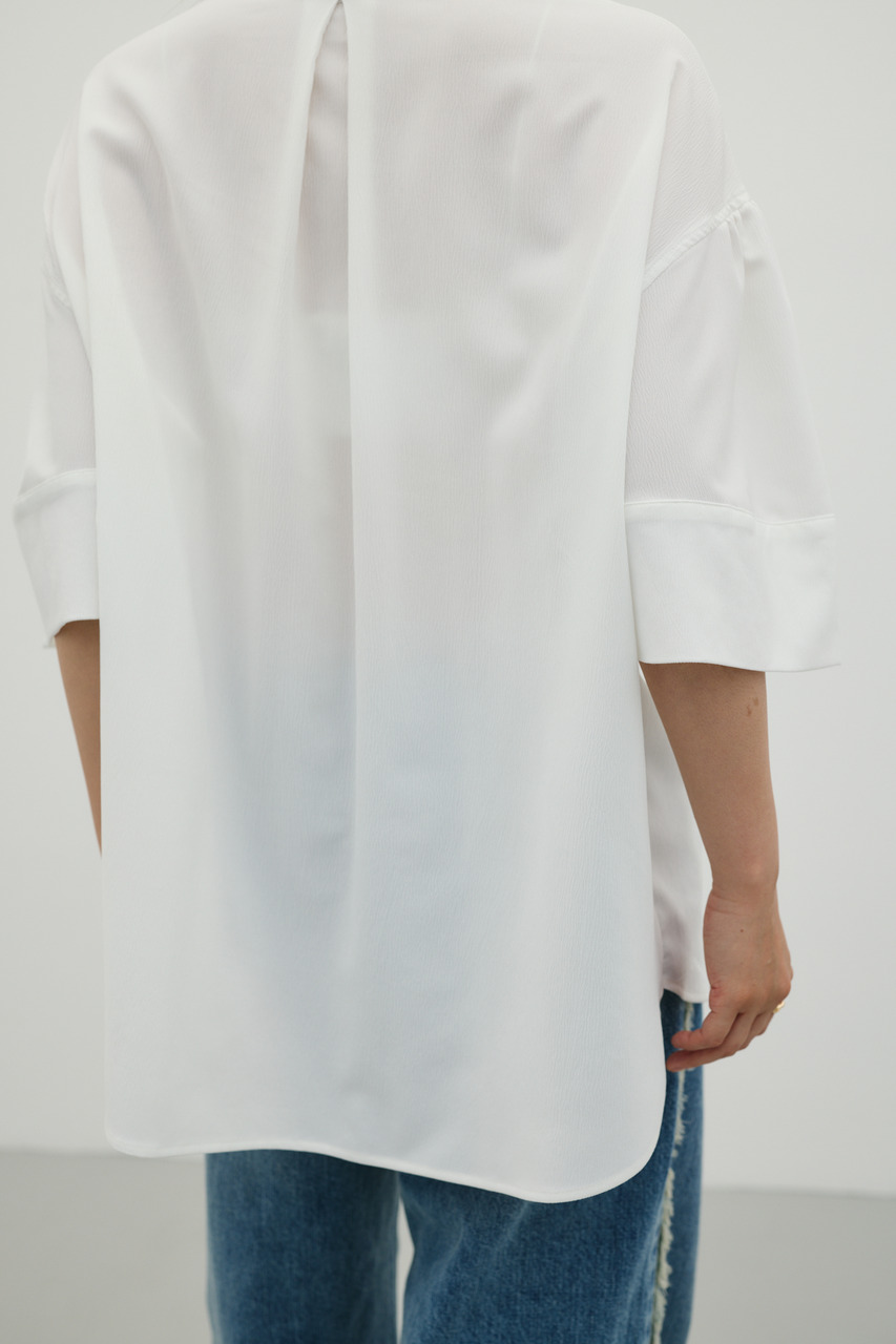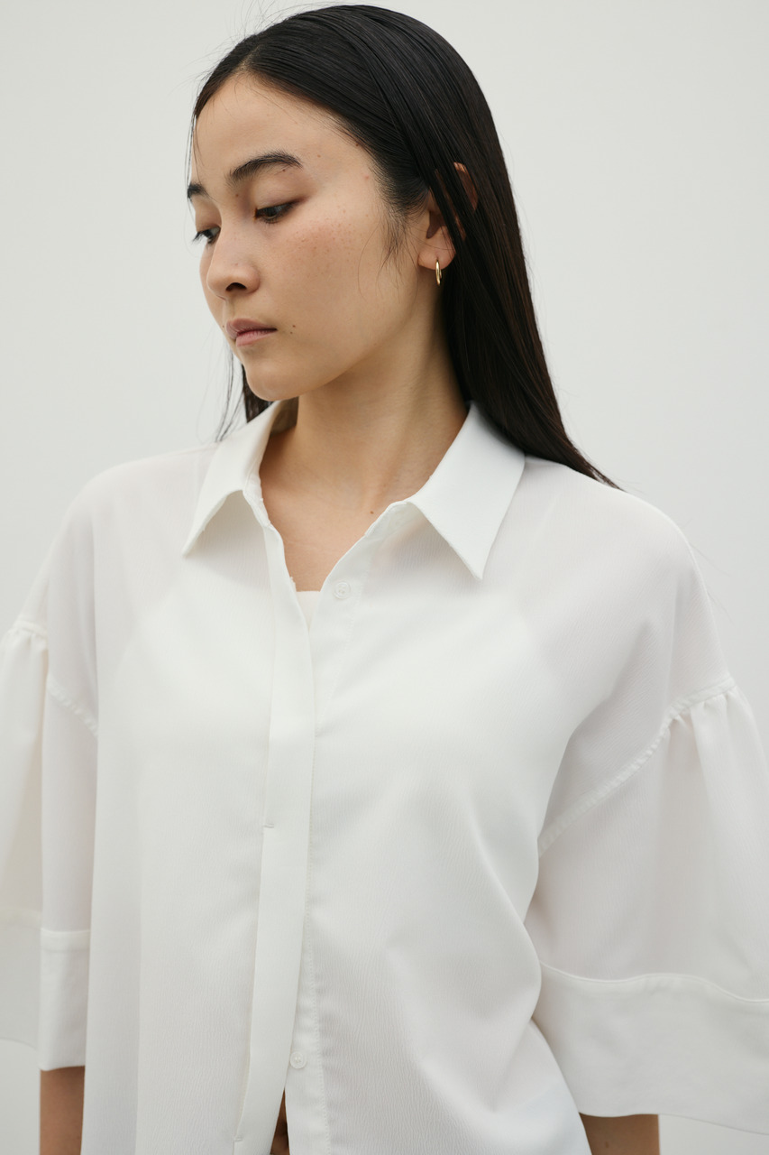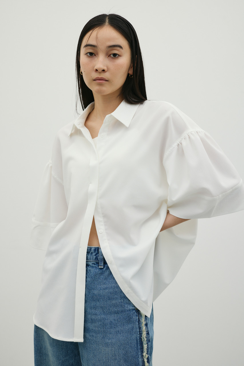 袖のギャザーと袖口にややフォルムを出したデザインがポイントのギャザーシャツ。オーバーサイズながら素材の落ち感で細見えが叶う一枚です。ドライタッチで涼しく着用できる素材感も魅力。マニッシュにもフェミニンにも着用いただけます。透け感WHTややあり、ストレッチややあり。
