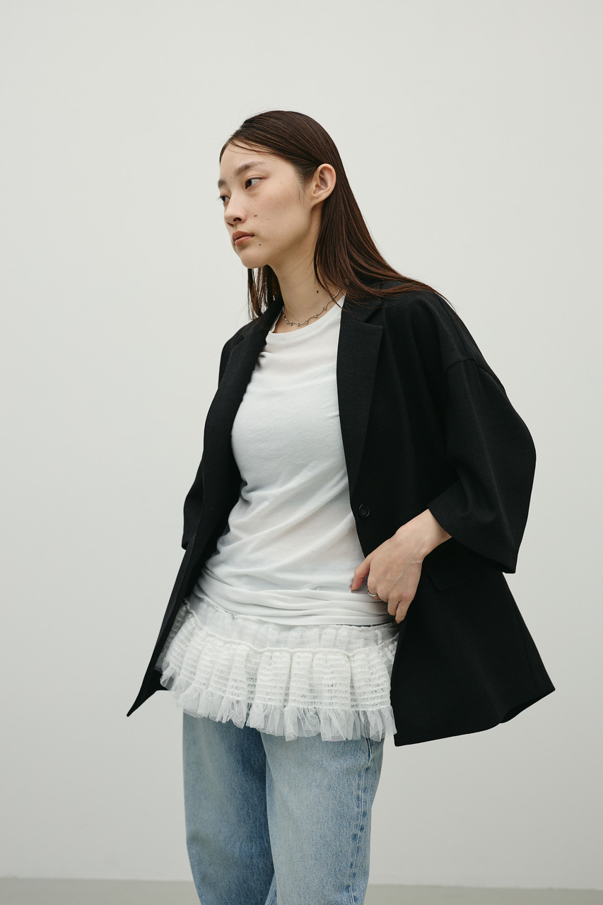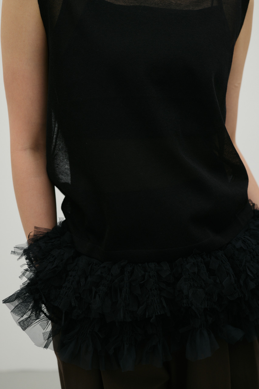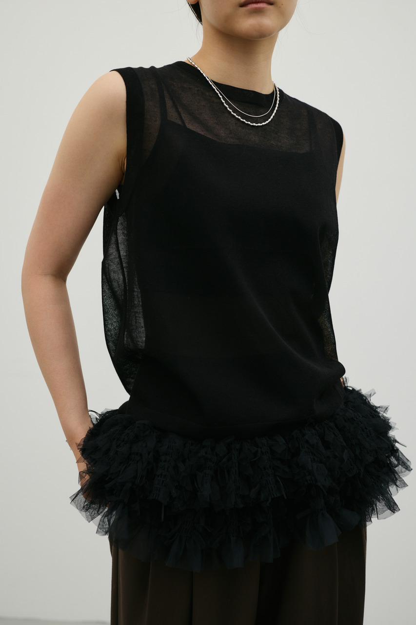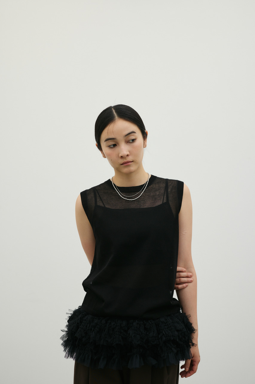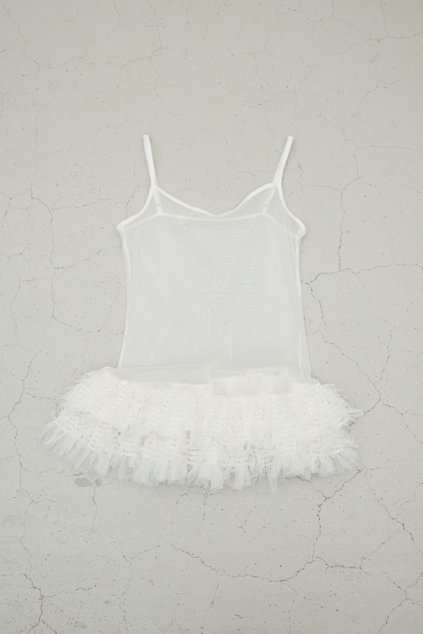 シャツやカットソー、ジャケットなどと重ねて裾から出るフリンジのレイヤードコーディネートが楽しめるキャミソール。程よくフィット感があり薄手のトップスの中にもインしやすいサイズ感。身頃のチュール素材も柔らかく、伸縮性があるのでストレスフリーに着用いただけます。透け感あり。ストレッチあり。