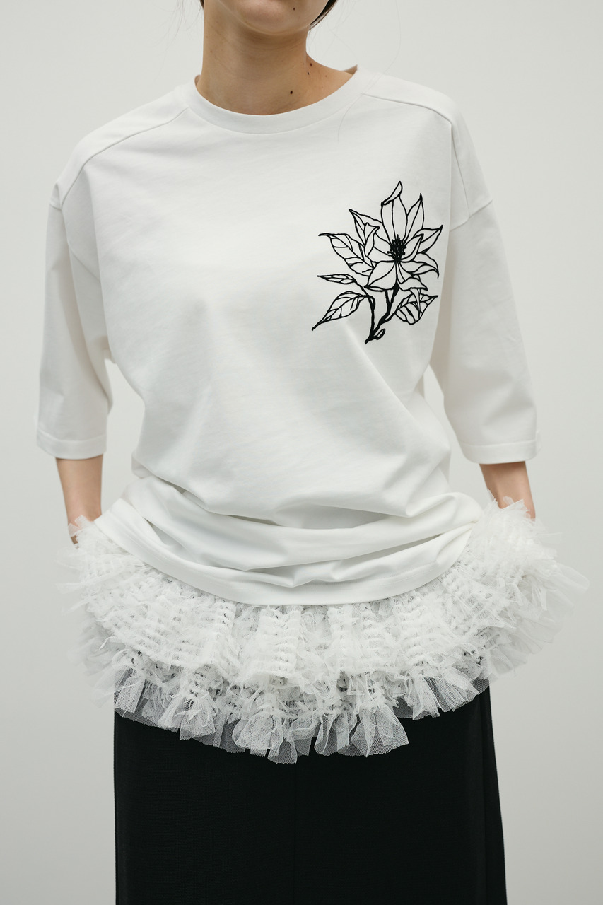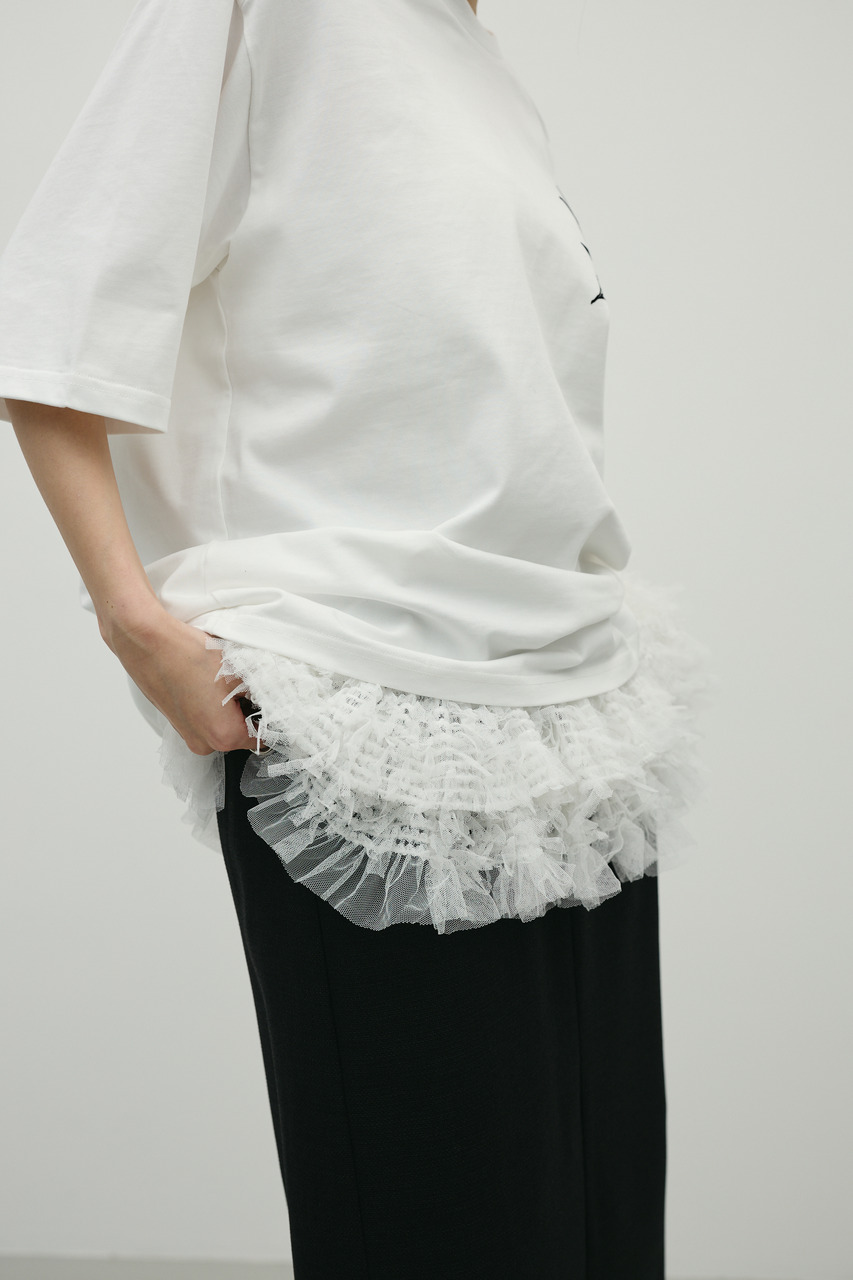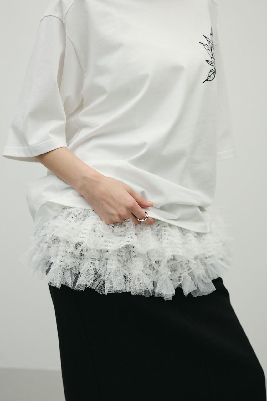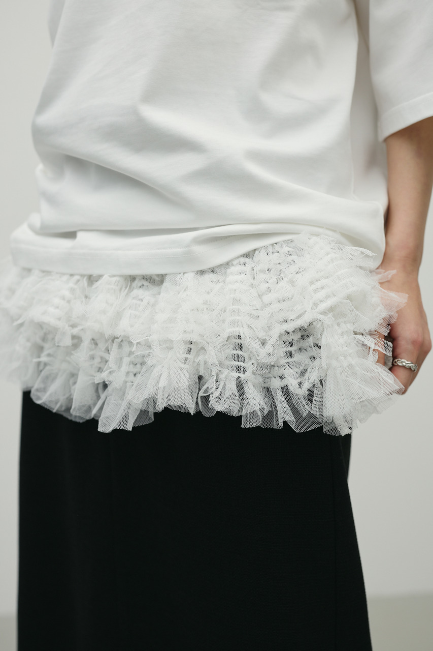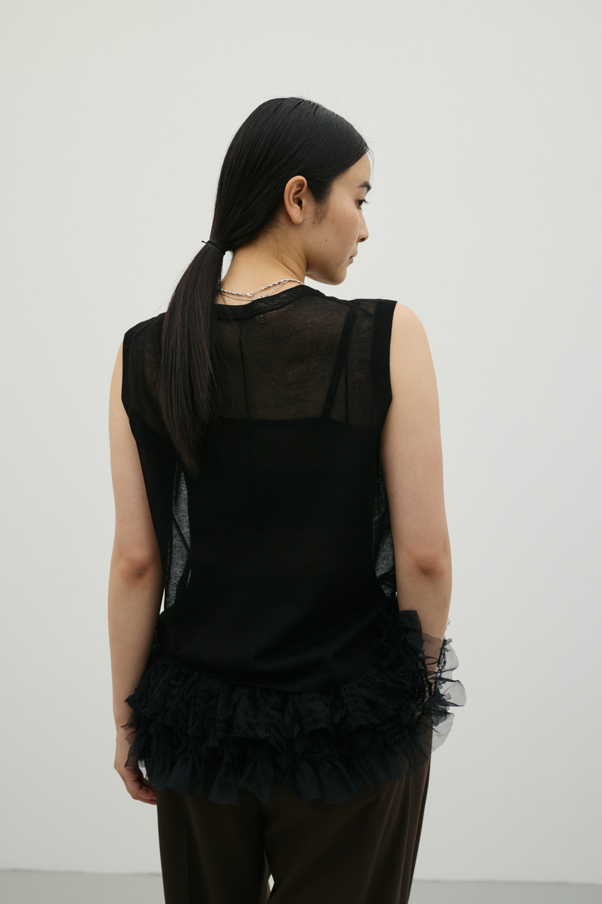 シャツやカットソー、ジャケットなどと重ねて裾から出るフリンジのレイヤードコーディネートが楽しめるキャミソール。程よくフィット感があり薄手のトップスの中にもインしやすいサイズ感。身頃のチュール素材も柔らかく、伸縮性があるのでストレスフリーに着用いただけます。透け感あり。ストレッチあり。