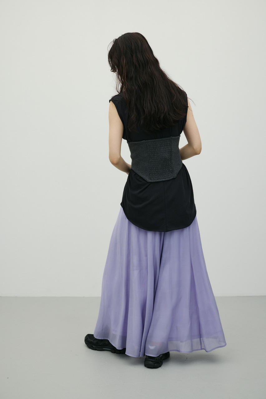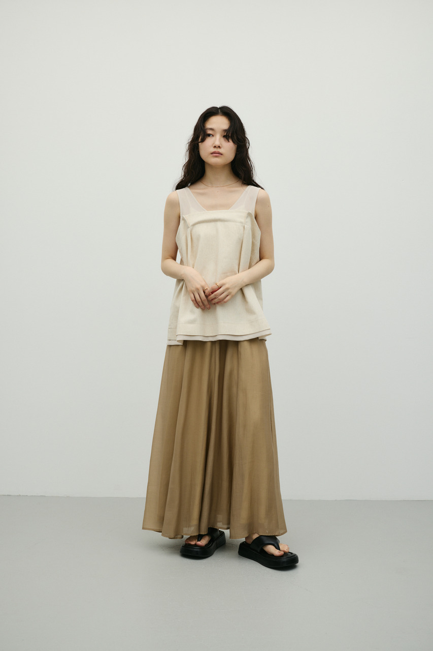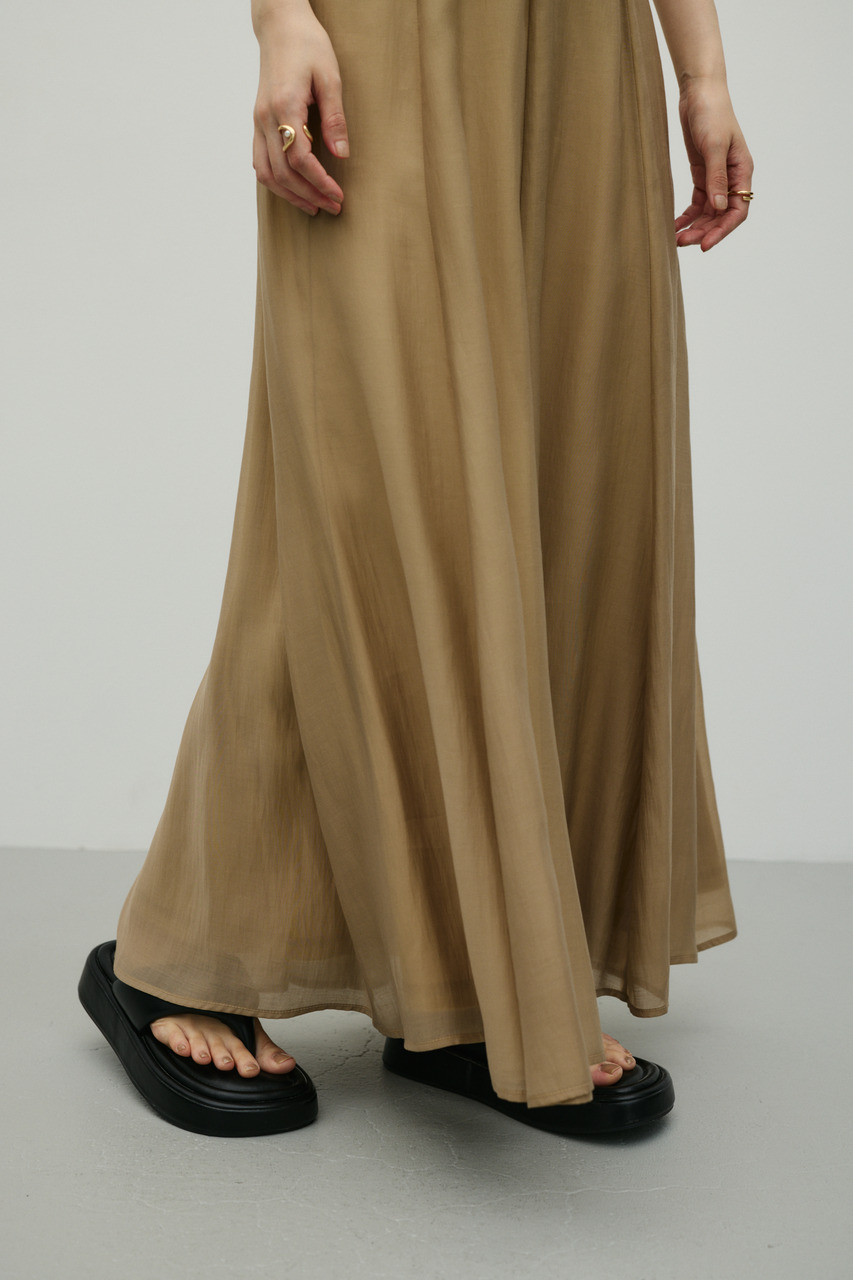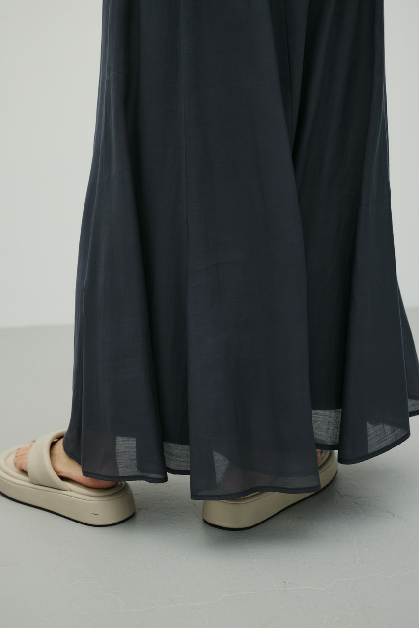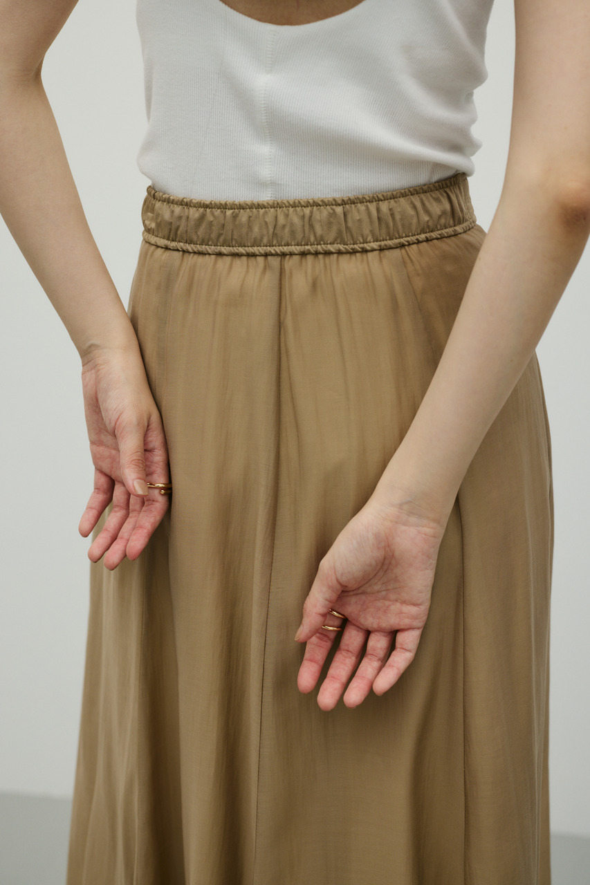 軽やかなシアー生地がポイントのフレアスカート。すっきりとしたウエスト周りから裾に向かって広がるフレアシルエットで女性らしい印象に仕上げました。デイリースタイルに程よいアクセントを加えてくれる一枚です。透け感あり(裏地付き)、ストレッチなし。
