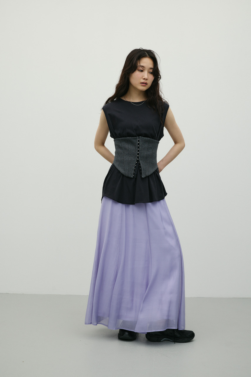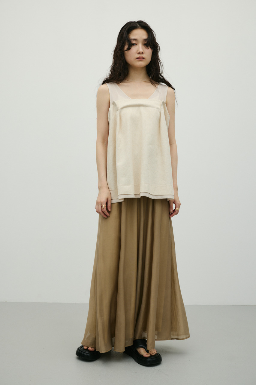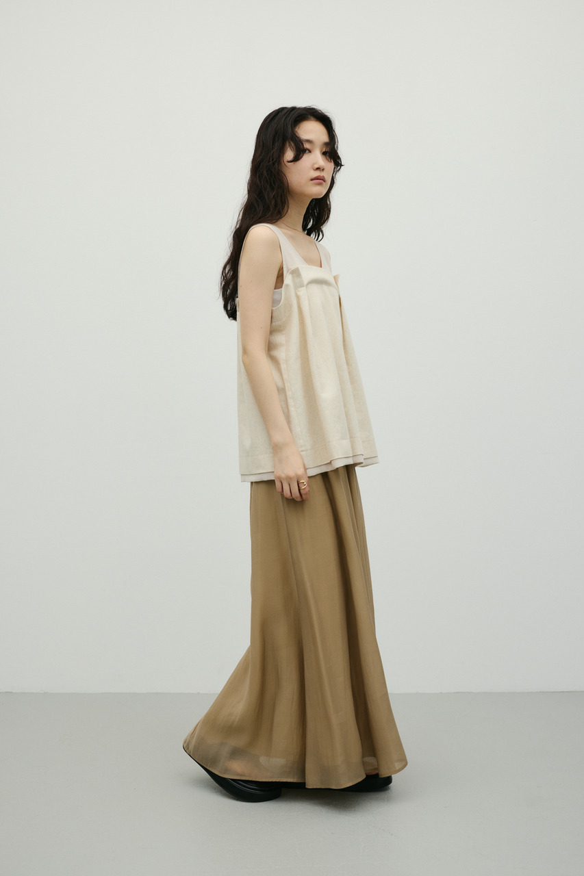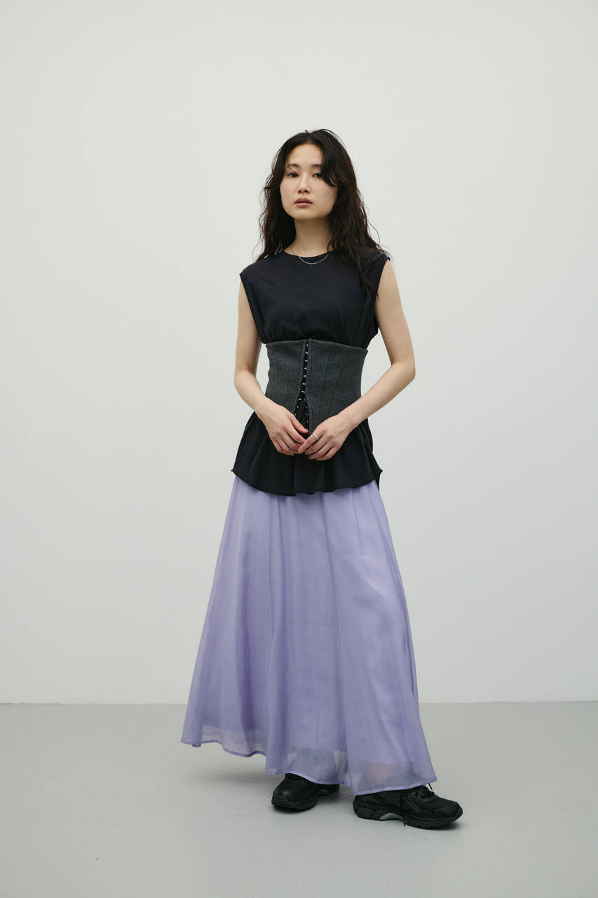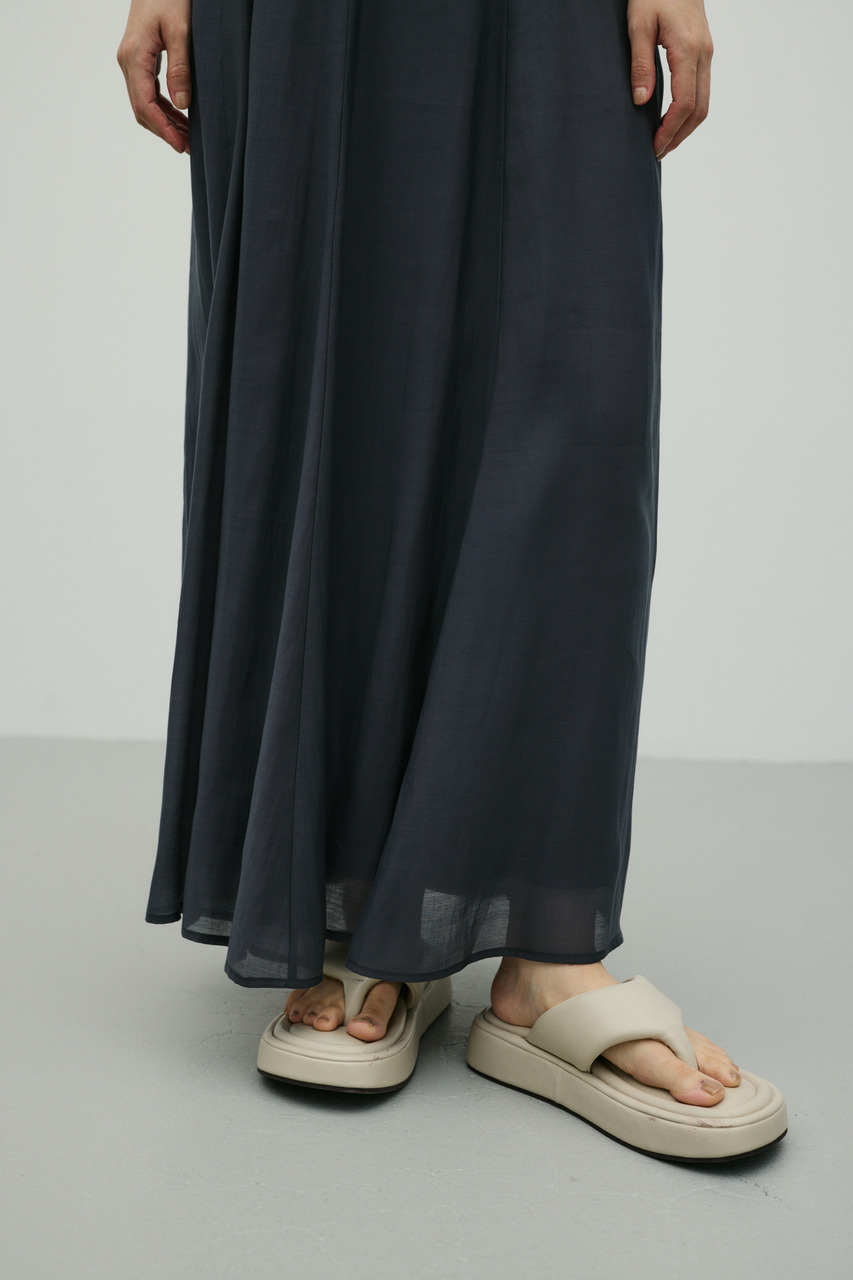 軽やかなシアー生地がポイントのフレアスカート。すっきりとしたウエスト周りから裾に向かって広がるフレアシルエットで女性らしい印象に仕上げました。デイリースタイルに程よいアクセントを加えてくれる一枚です。透け感あり(裏地付き)、ストレッチなし。