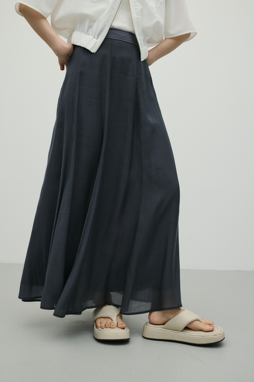 軽やかなシアー生地がポイントのフレアスカート。すっきりとしたウエスト周りから裾に向かって広がるフレアシルエットで女性らしい印象に仕上げました。デイリースタイルに程よいアクセントを加えてくれる一枚です。透け感あり(裏地付き)、ストレッチなし。