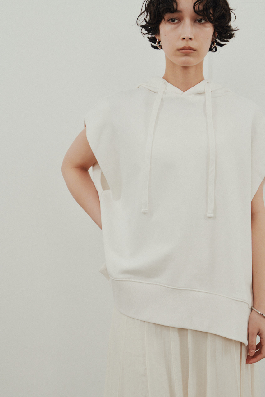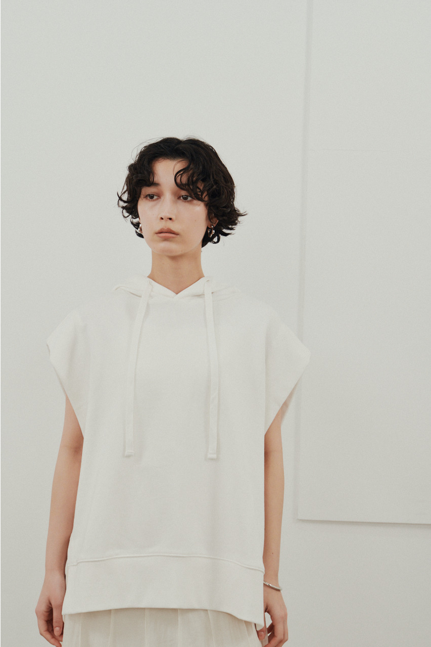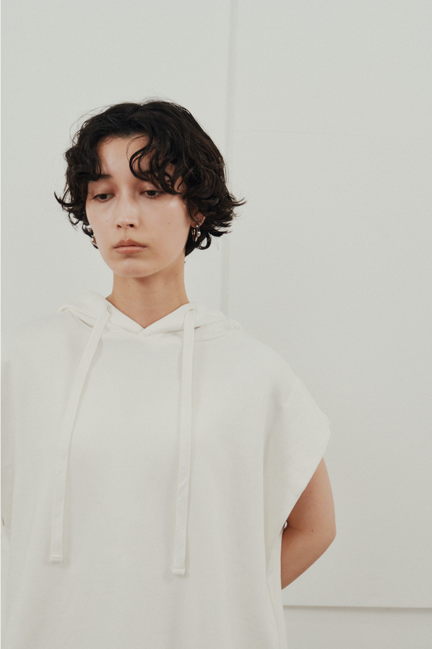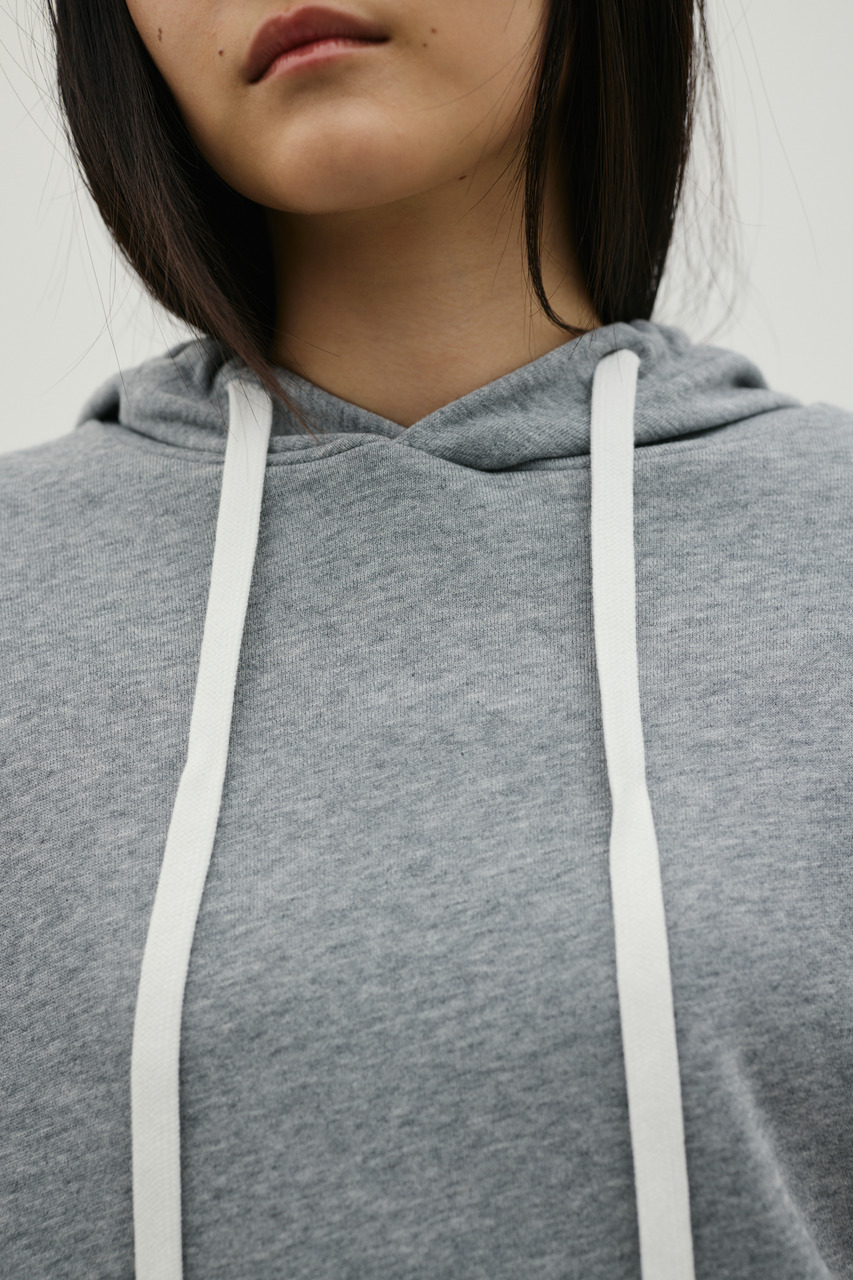 柔らかなスウェット素材を使用した、リラックス感のあるルーズカットトップ。肩幅を広めにとったドロップショルダーで、二の腕周りをさりげなくカバー。フードには敢えて太めの平紐を採用し、シンプルなフーディーの中にもさりげないアクセントをプラス。裾サイドのUスリットでボトムのポケットに手を入れやすく、抜け感のあるシルエットを演出します。透け感WHTややあり ストレッチあり