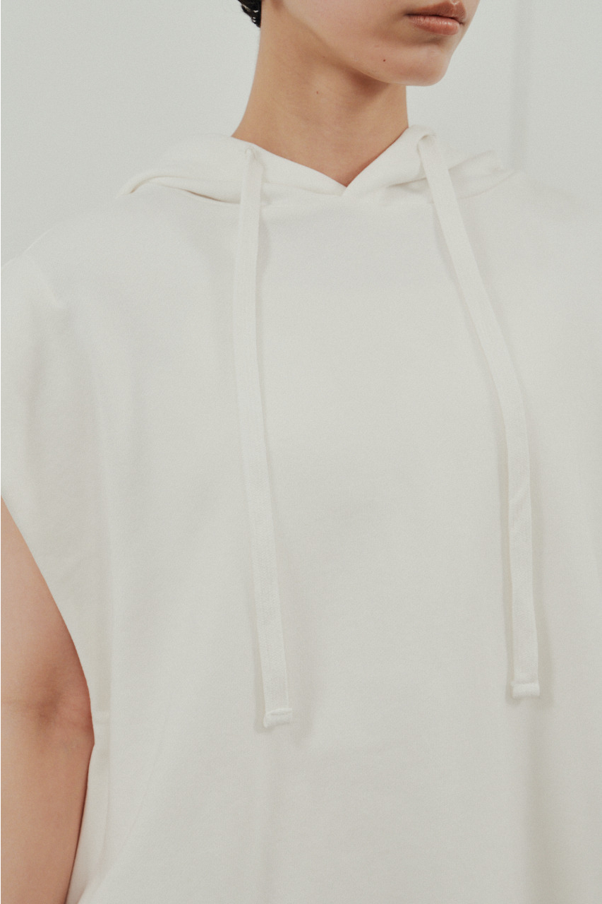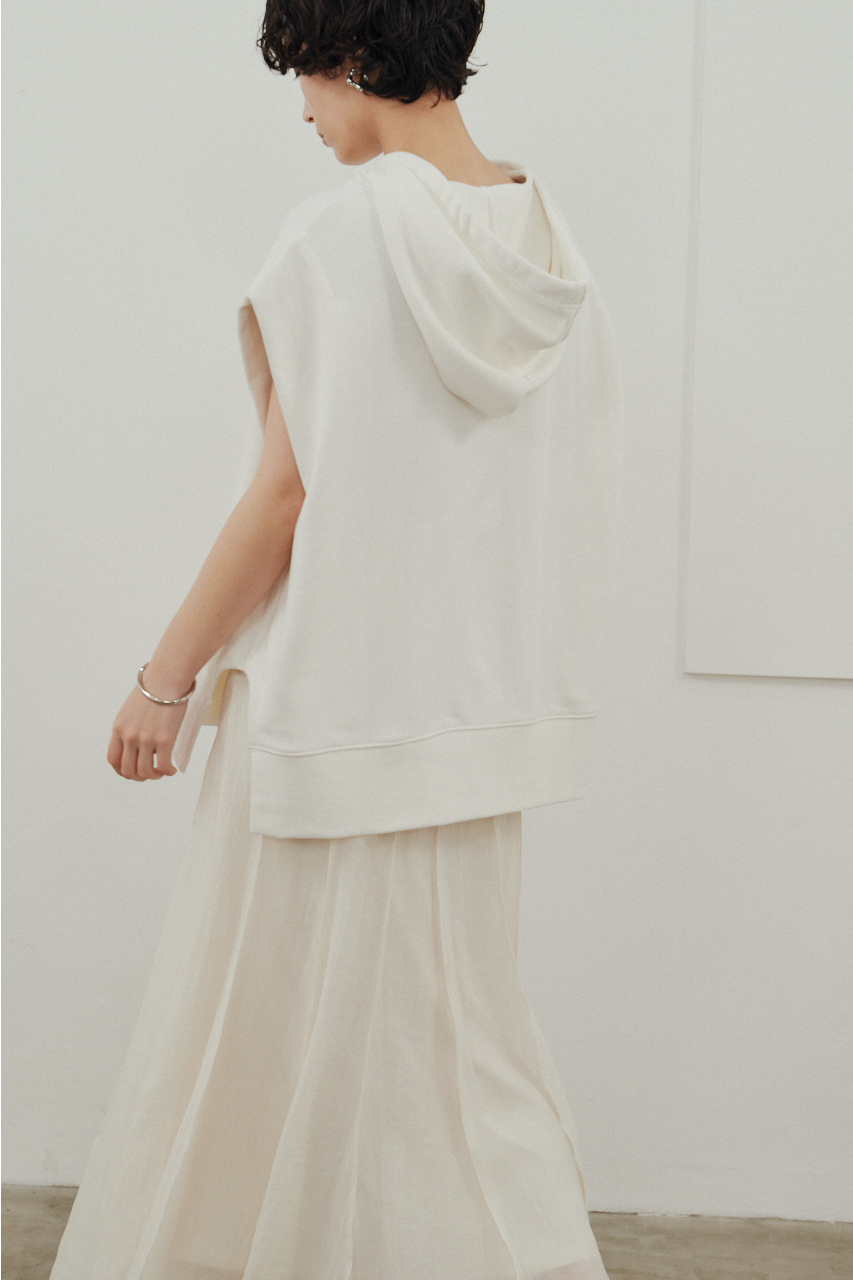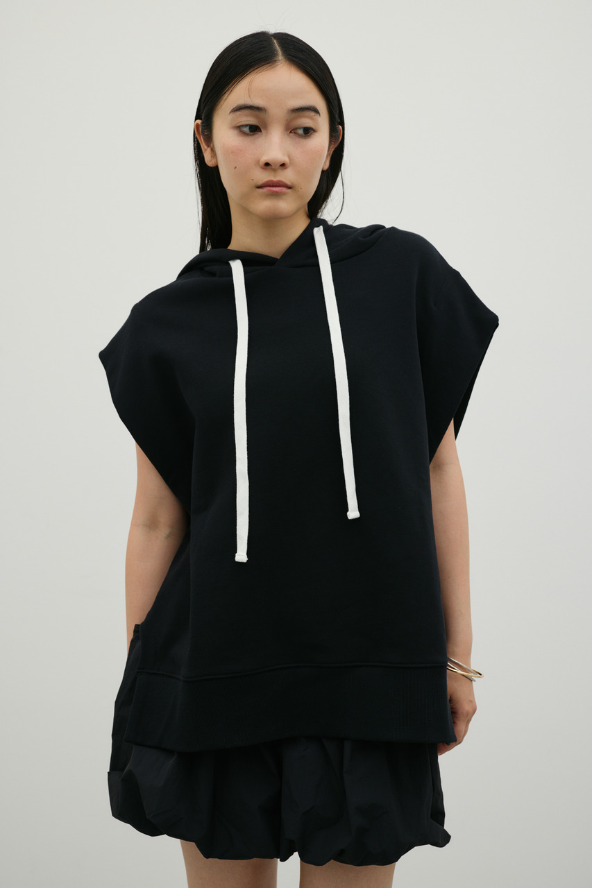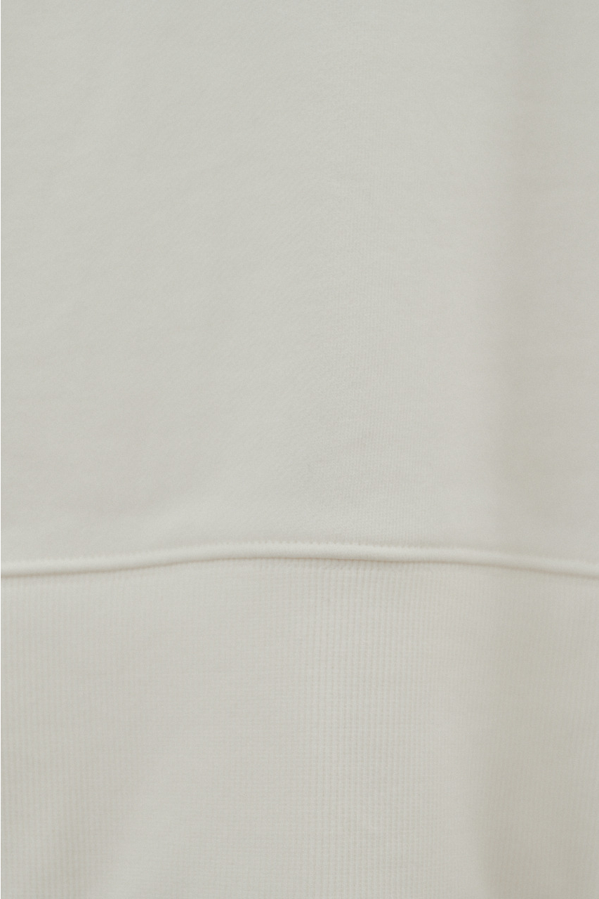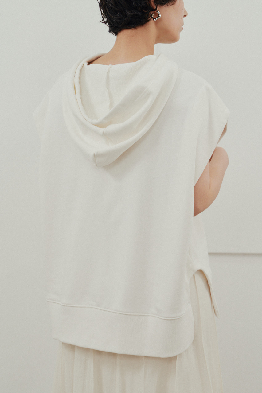 柔らかなスウェット素材を使用した、リラックス感のあるルーズカットトップ。肩幅を広めにとったドロップショルダーで、二の腕周りをさりげなくカバー。フードには敢えて太めの平紐を採用し、シンプルなフーディーの中にもさりげないアクセントをプラス。裾サイドのUスリットでボトムのポケットに手を入れやすく、抜け感のあるシルエットを演出します。透け感WHTややあり ストレッチあり