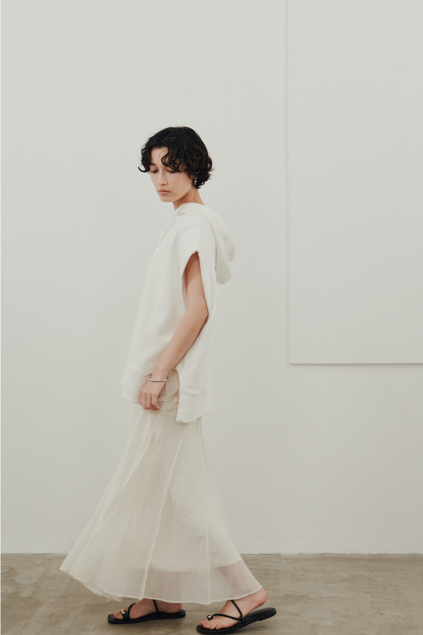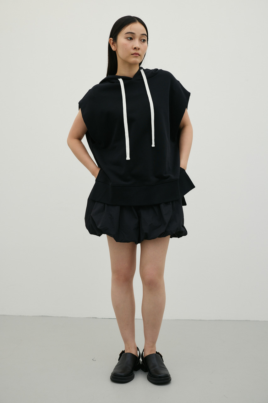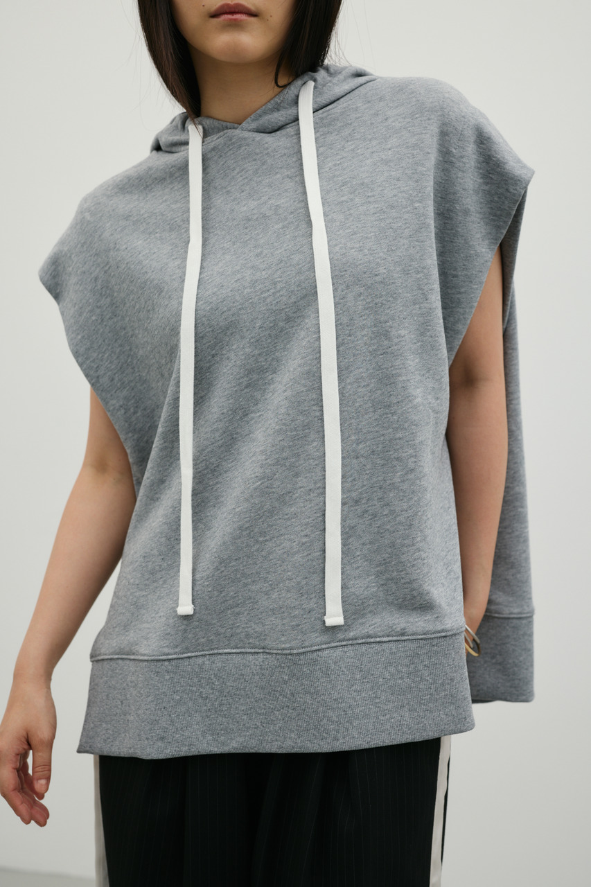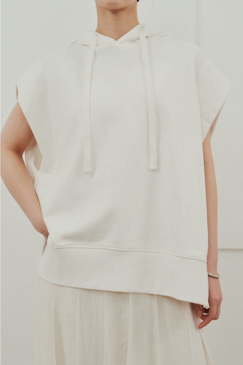 柔らかなスウェット素材を使用した、リラックス感のあるルーズカットトップ。肩幅を広めにとったドロップショルダーで、二の腕周りをさりげなくカバー。フードには敢えて太めの平紐を採用し、シンプルなフーディーの中にもさりげないアクセントをプラス。裾サイドのUスリットでボトムのポケットに手を入れやすく、抜け感のあるシルエットを演出します。透け感WHTややあり ストレッチあり