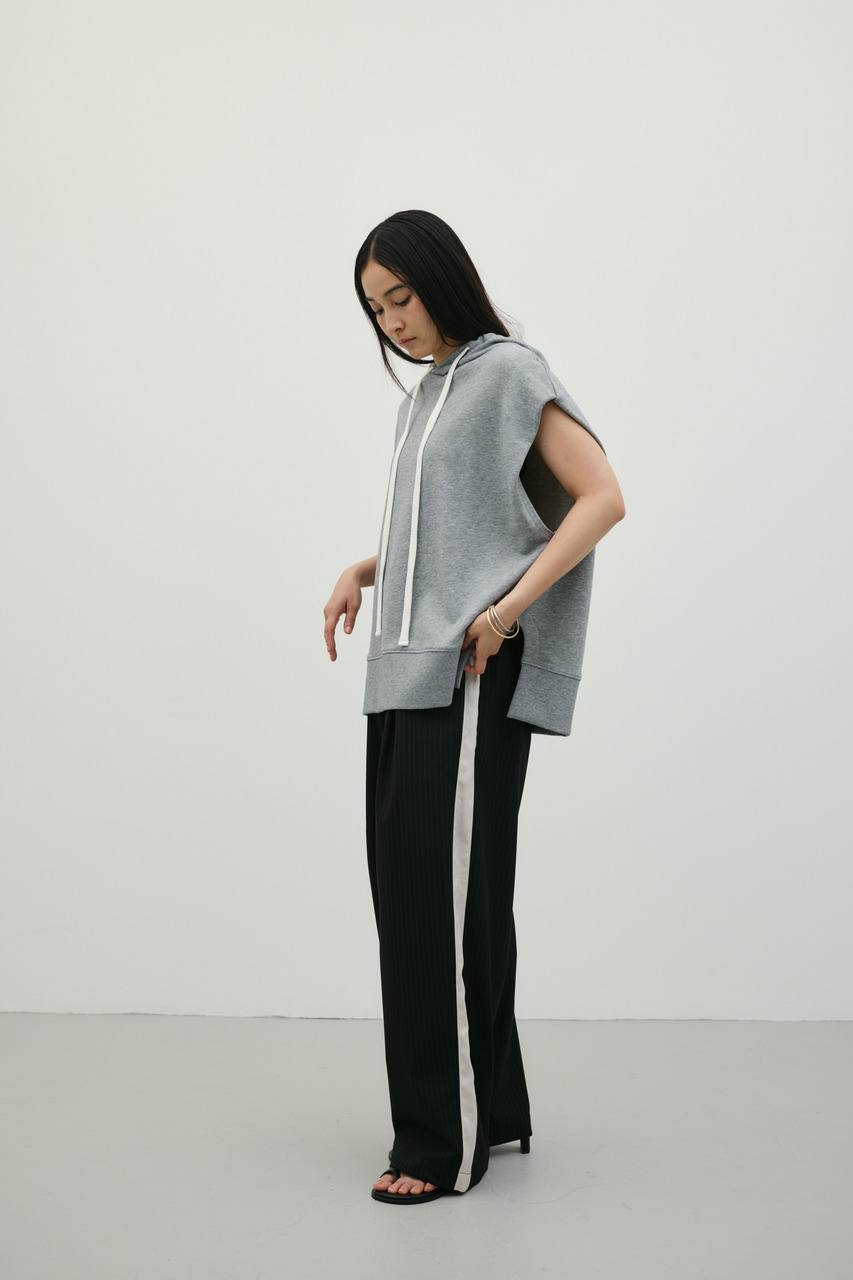 柔らかなスウェット素材を使用した、リラックス感のあるルーズカットトップ。肩幅を広めにとったドロップショルダーで、二の腕周りをさりげなくカバー。フードには敢えて太めの平紐を採用し、シンプルなフーディーの中にもさりげないアクセントをプラス。裾サイドのUスリットでボトムのポケットに手を入れやすく、抜け感のあるシルエットを演出します。透け感WHTややあり ストレッチあり
